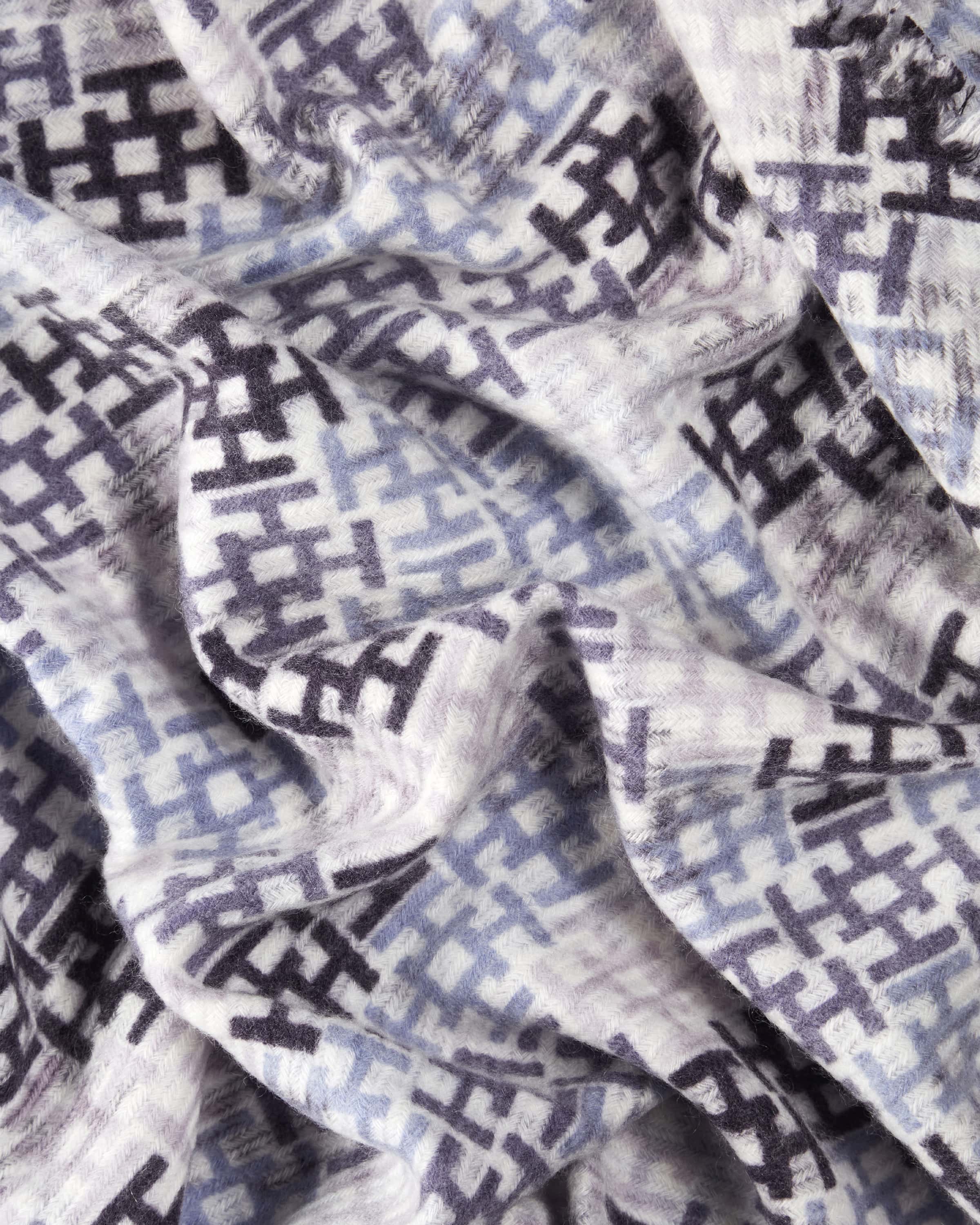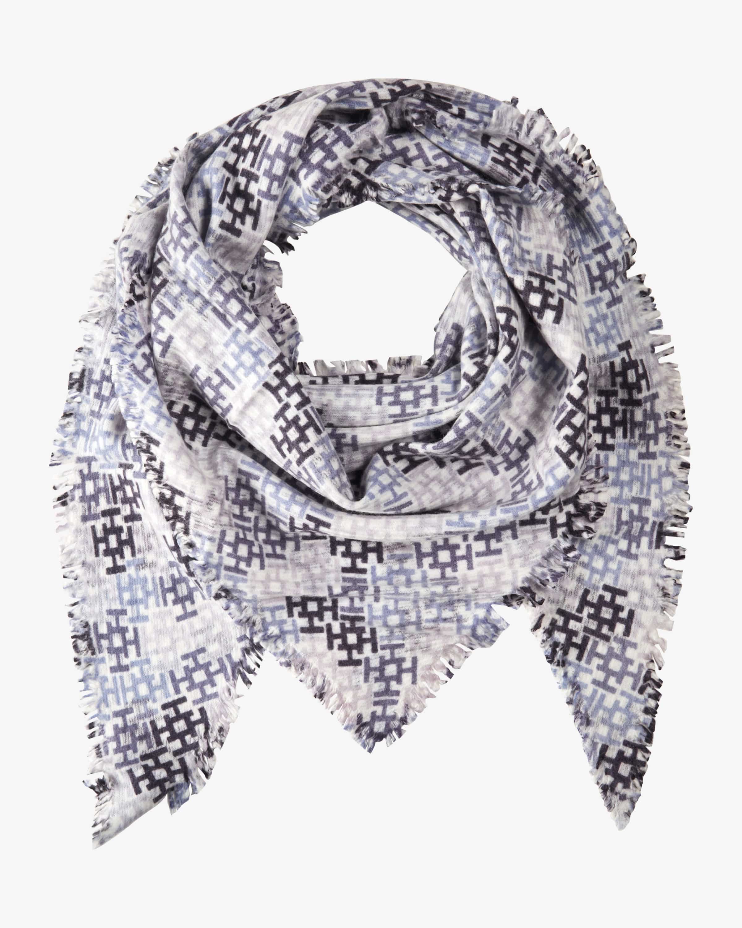 Aliki-Tri Cashmere-Tuch für Damen von Hemisphere in Blau, Flieder und Weiß. Der dreieckige Schal aus hochwertiger Cashmere-Wolle punktet mit einem weichen Griff, während das Monogramm-Muster ein stilvolles Accessoire kreiert, welches zugleich als Cape getragen werden kann.