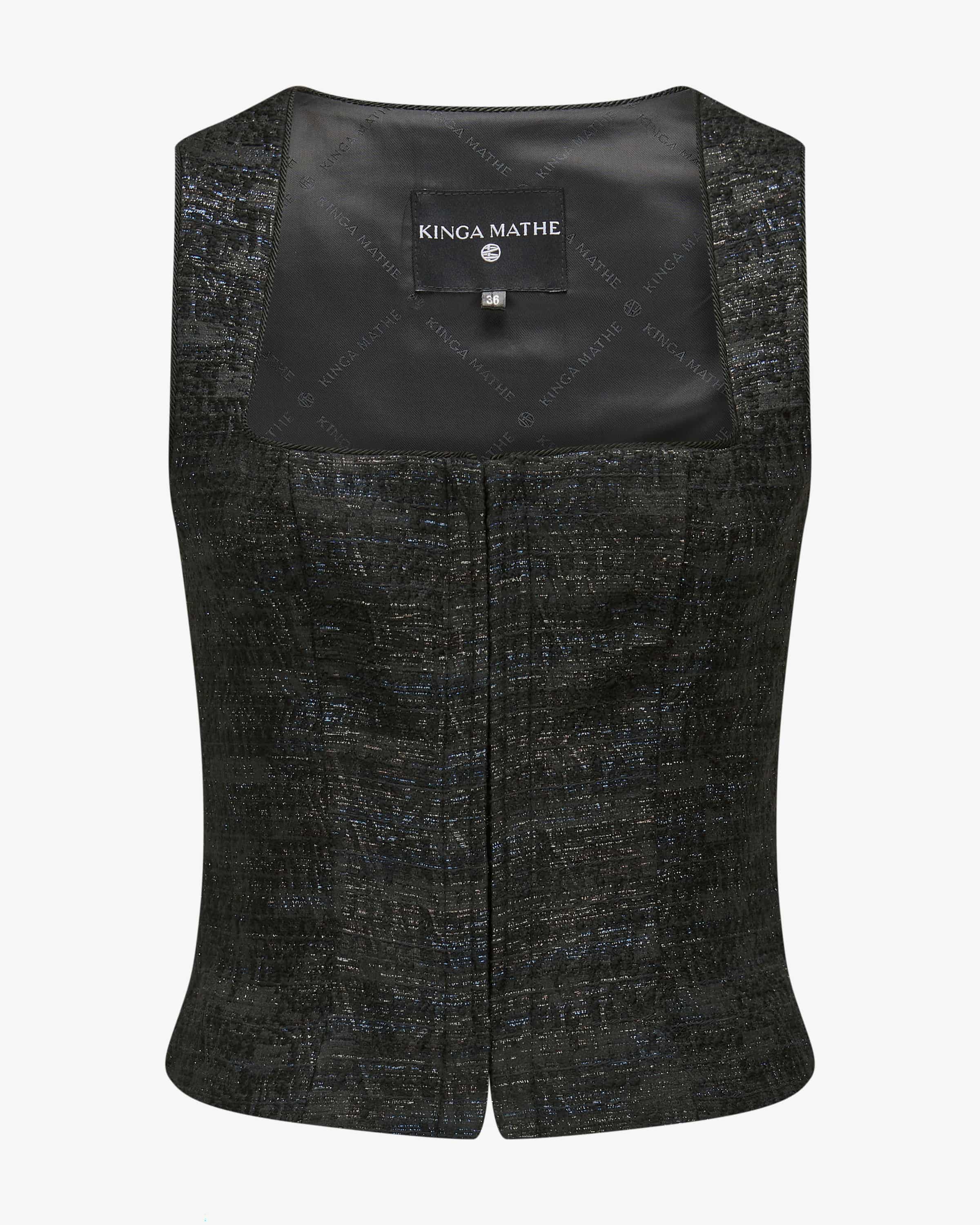 Alva Trachten-Mieder für Damen von Kinga Mathe in Schwarz, Silber und Blau. Mit diesem changierenden Spencer-Modell in Bouclé-Optik erhalten Sie einen modischen und dennoch traditionellen Eyecatcher für vielseitige Trachten-Looks – egal ob kombiniert zum femininen Rock oder zur rustikalen Lederhose.