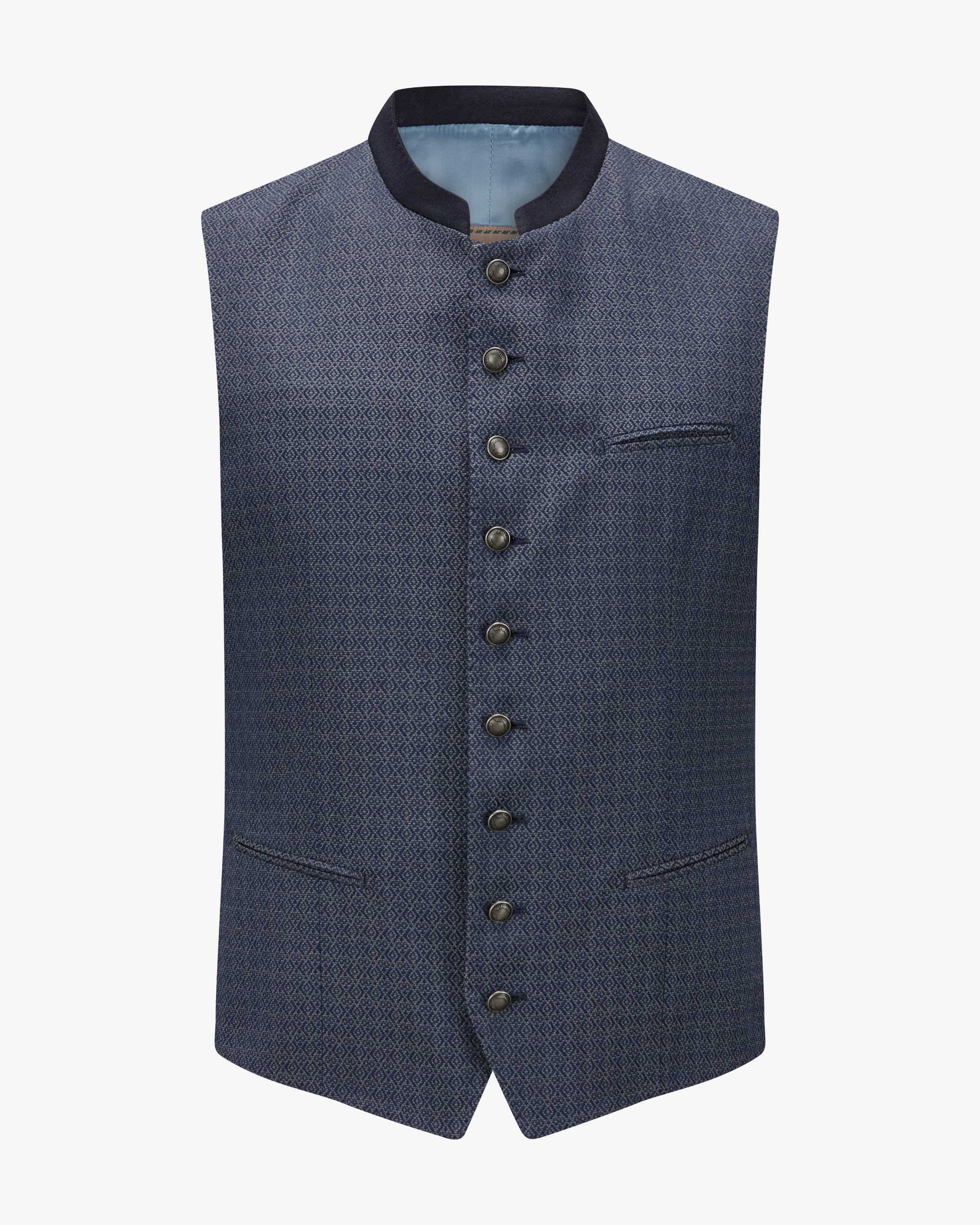 Ammersee Trachtenweste für Herren von Windsor in Dunkelblau und Blaugrau. Das Modell begeistert mit einem edlen Jacquard-Muster in moderner Interpretation, während der hochwertige Material-Mix dem traditionellen Gesamtbild eine außergewöhnlich stilvolle und zugleich spürbar hochwertige Note verleiht.