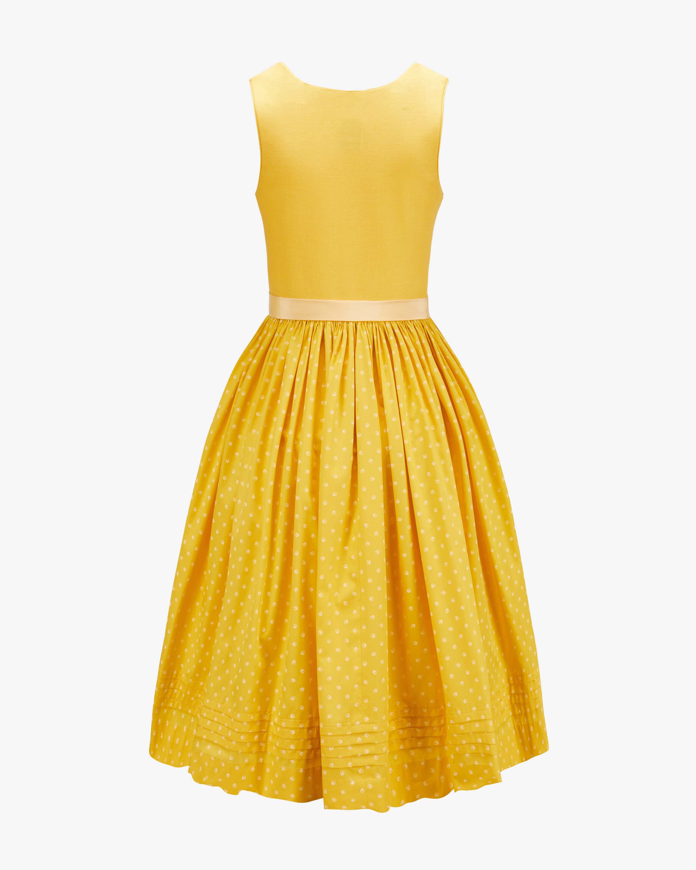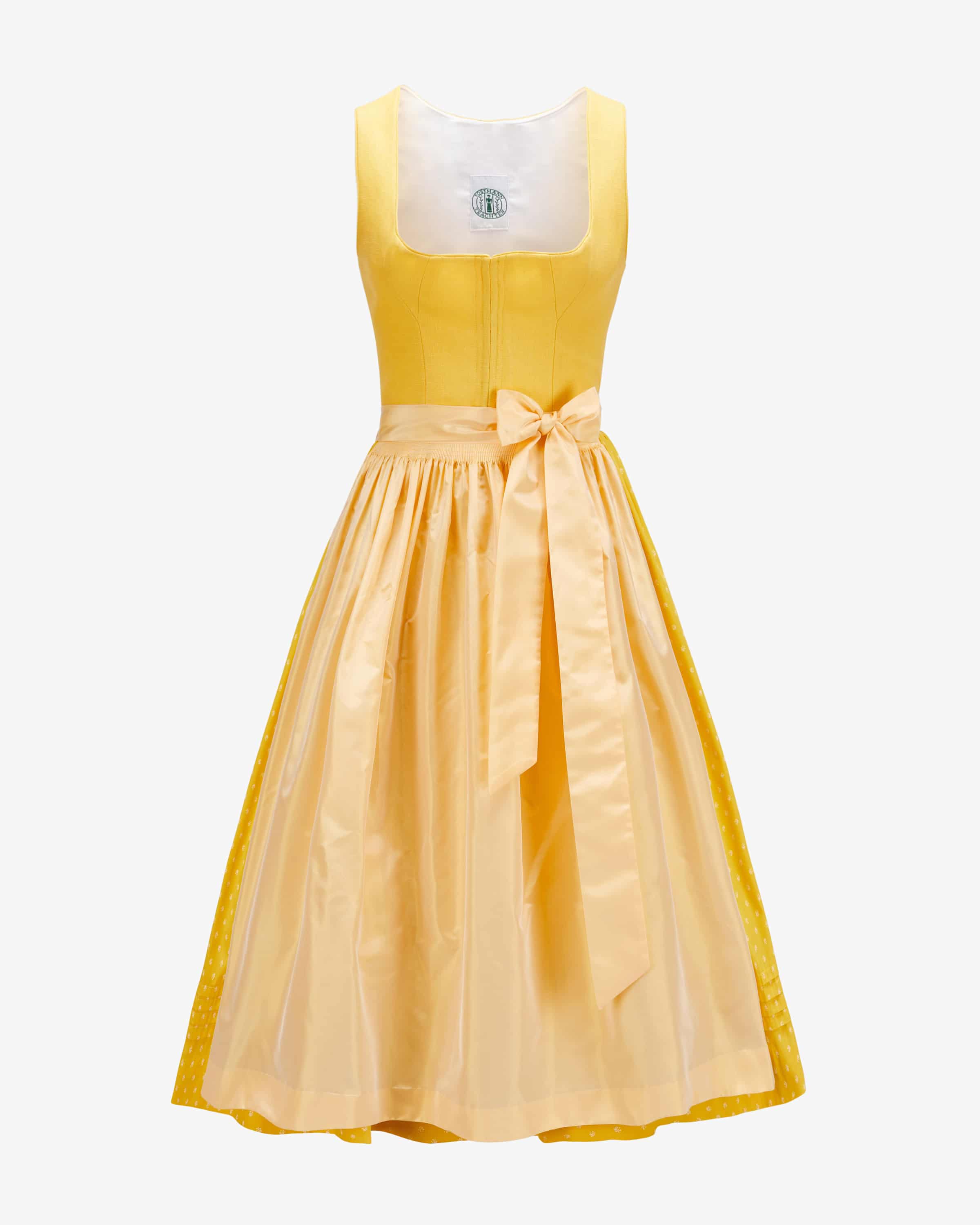 Bette Midi-Dirndl mit Seidenschürze für Damen von Tostmann in Gelb. Trachten- Handwerk aus Österreich - Das tradtitionelle Modell überzeugt durch den mit floralem Print gemusterten Rock und klassischen Details, während die strukturierte Leinen-Qualität im Mieder für angenehmen Tragekomfort sorgt. Die changierende Seiden-Schürze rundet den Trachten-Look feminin ab.