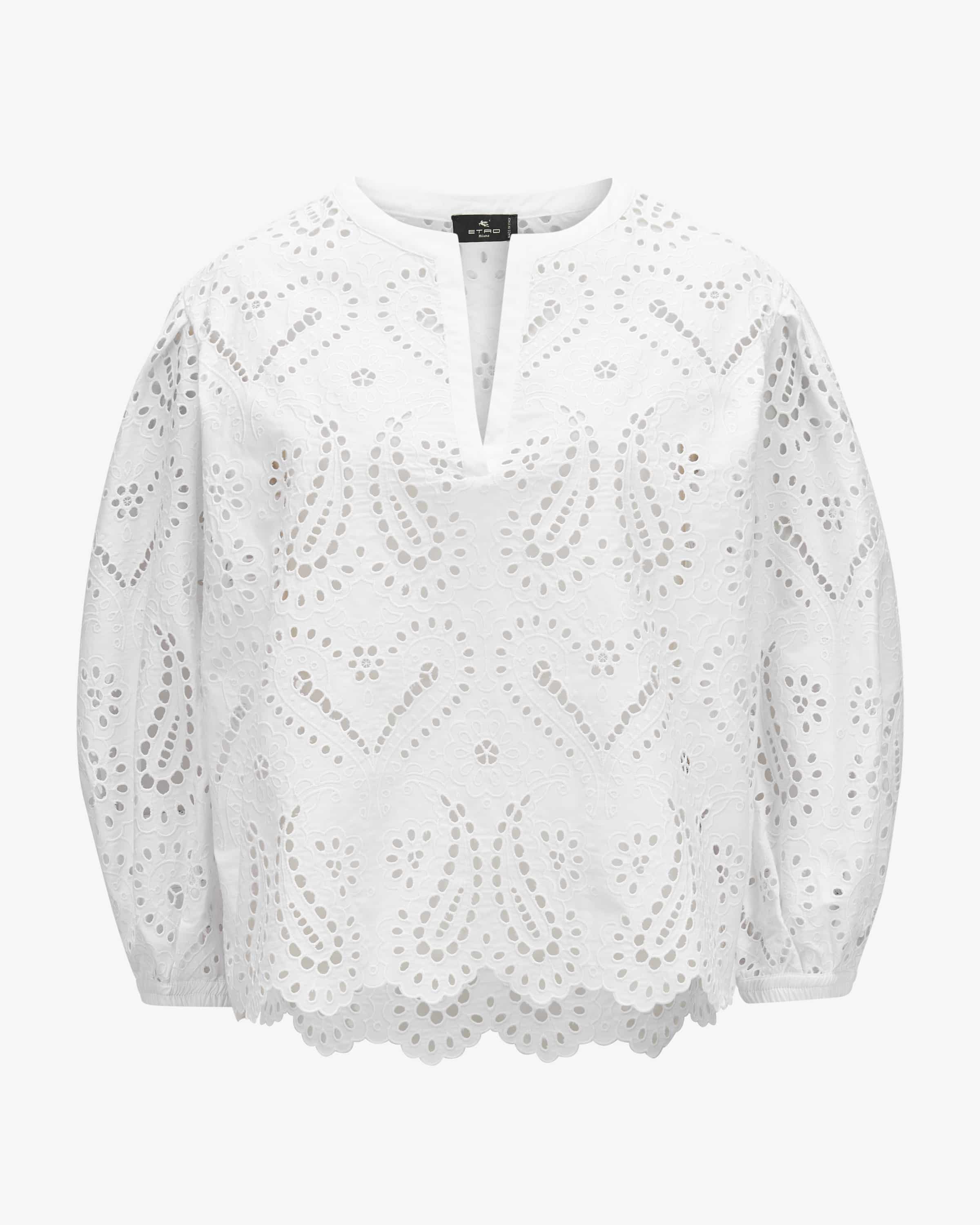Bluse für Damen von Etro in Weiß. Die italienische Traditionsmarke ist bekannt für ihre opulenten Paisley-Muster und ethnischen Prints. Auch dieses weit geschnittene Modell überzeugt mit labeltypischem Paisley-Muster in semitransparentem Lochstick-Design, während der Tunika-Look durch die Ballonärmel feminin abgerundet wird.