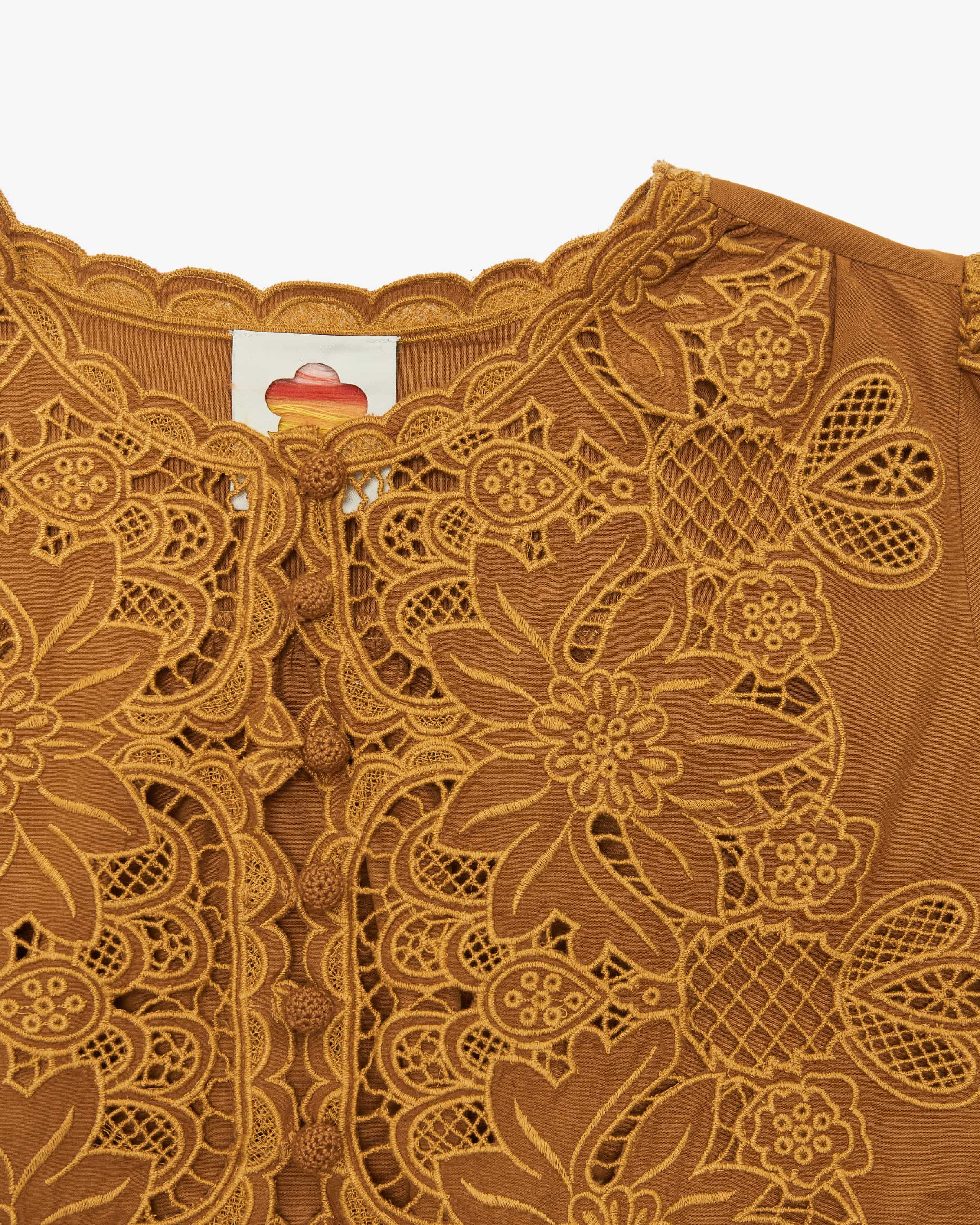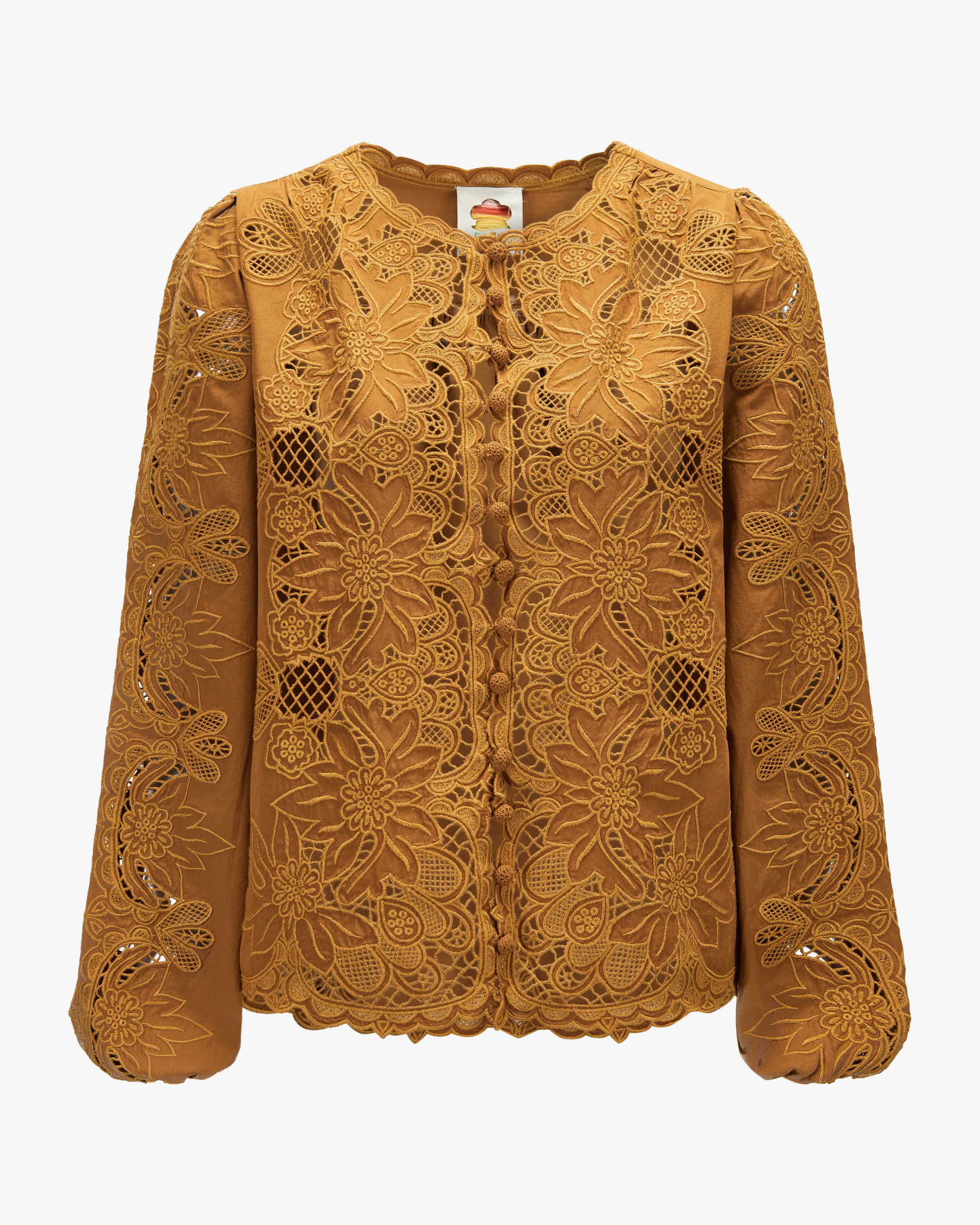 Bluse Camel Richelieu für Damen von Farm Rio in Cognac. Die brasilianische Marke ist voller Farben, Prints und Lebensfreude. Inspiriert vom tropischen Lebensgefühl bringt sie positive Energie in die Modewelt. Auch dieses Modell präsentiert sich mit toniger Lochspitze und floralen Stickereien, während raffinierte Häkel-Knöpfe und die romantische Silhouette einen femininen Boho- Look schaffen.