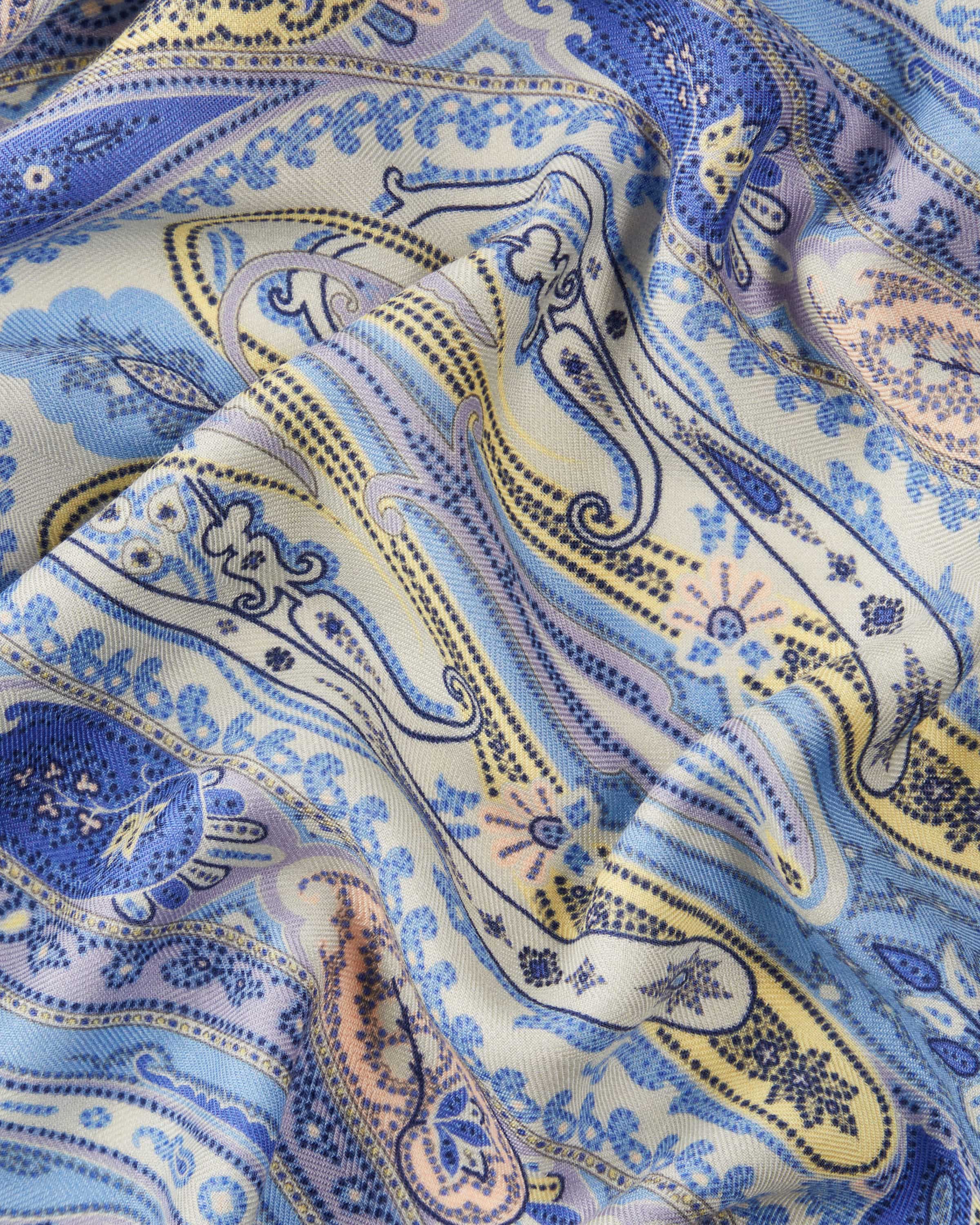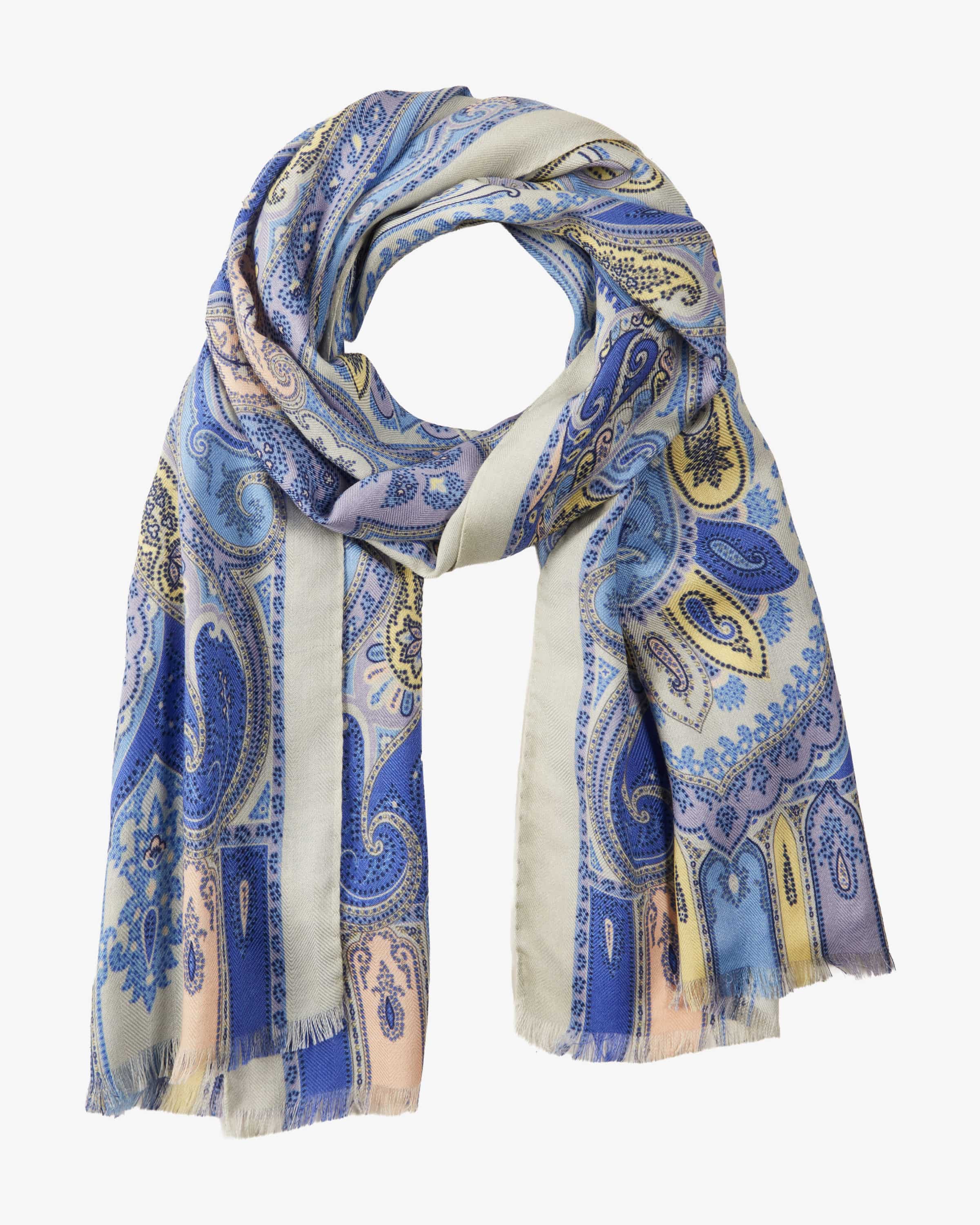 Cashmere-Seiden-Schal für Damen von Etro in Blau, Mint und Gelb. Während das farbenfrohe Paisley-Muster einen stilvollen Eyecatcher kreiert, schmiegt sich die hochwertige Cashmere-Seiden-Verarbeitung in leichter Haptik angenehm an Ihre Haut an.