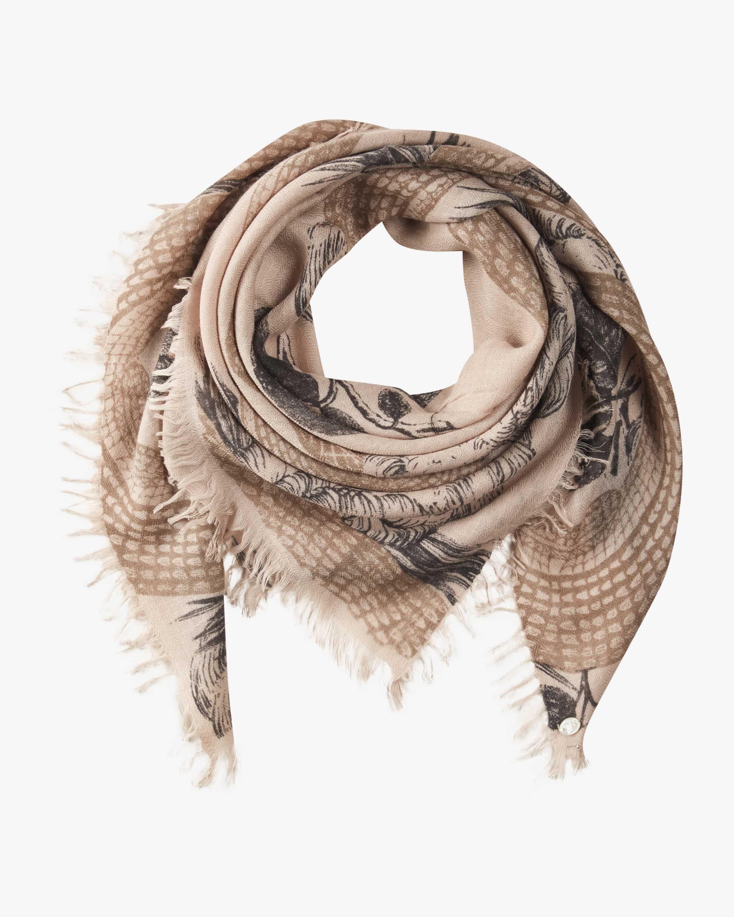 Cashmere-Tuch für Damen von Friendly Hunting in Beige, Taupe und Schwarz. Die deutsche Marke verbindet nachhaltige Materialien und luxuriöse Handarbeit. Aus hochwertiger Cashmere-Wolle handgefertigt, begeistert das leichte Modell mit besonders weichem Griff. Das charakteristische Allover-Muster mit Schlangen- Motiv verleiht dabei das gewisse Etwas.