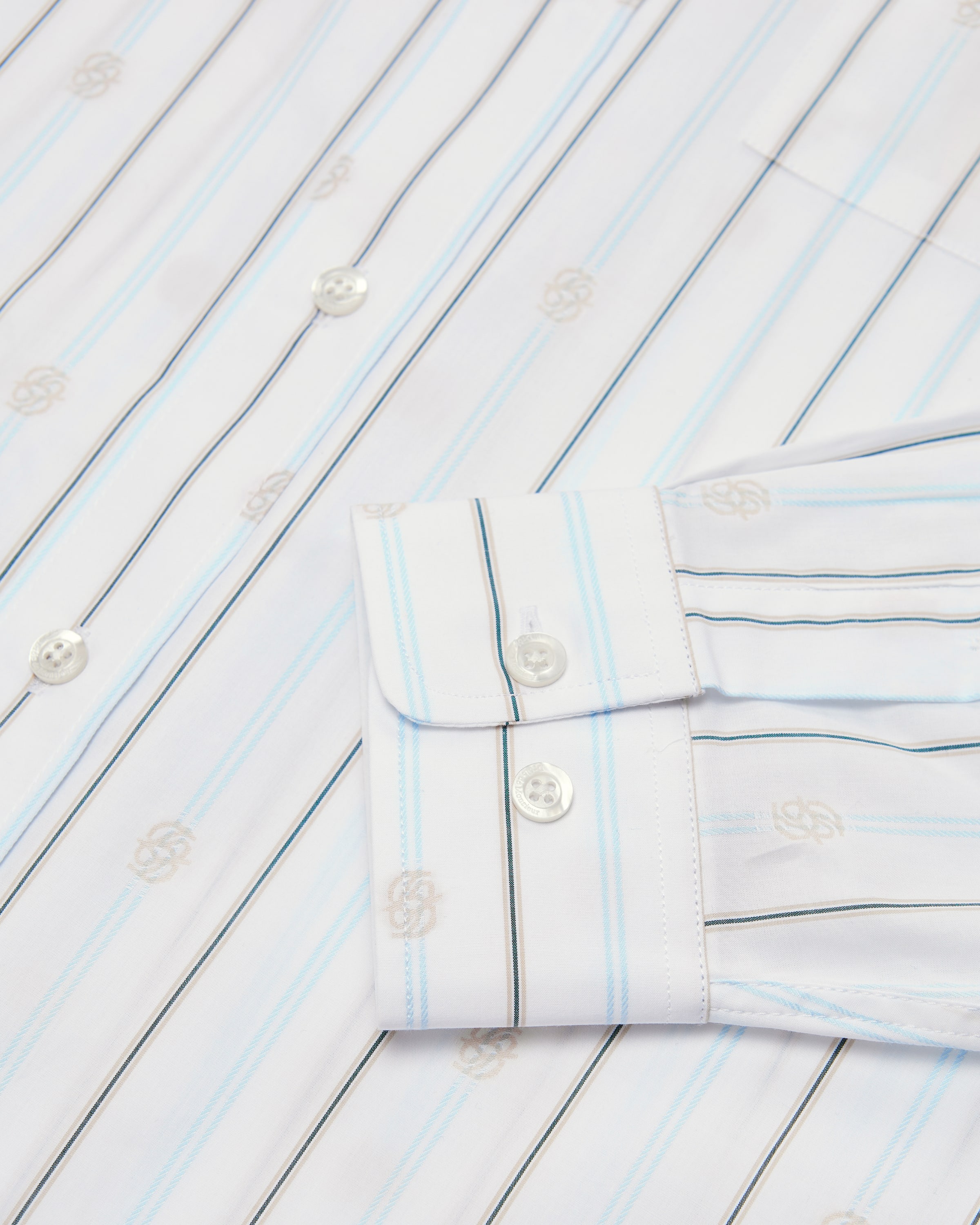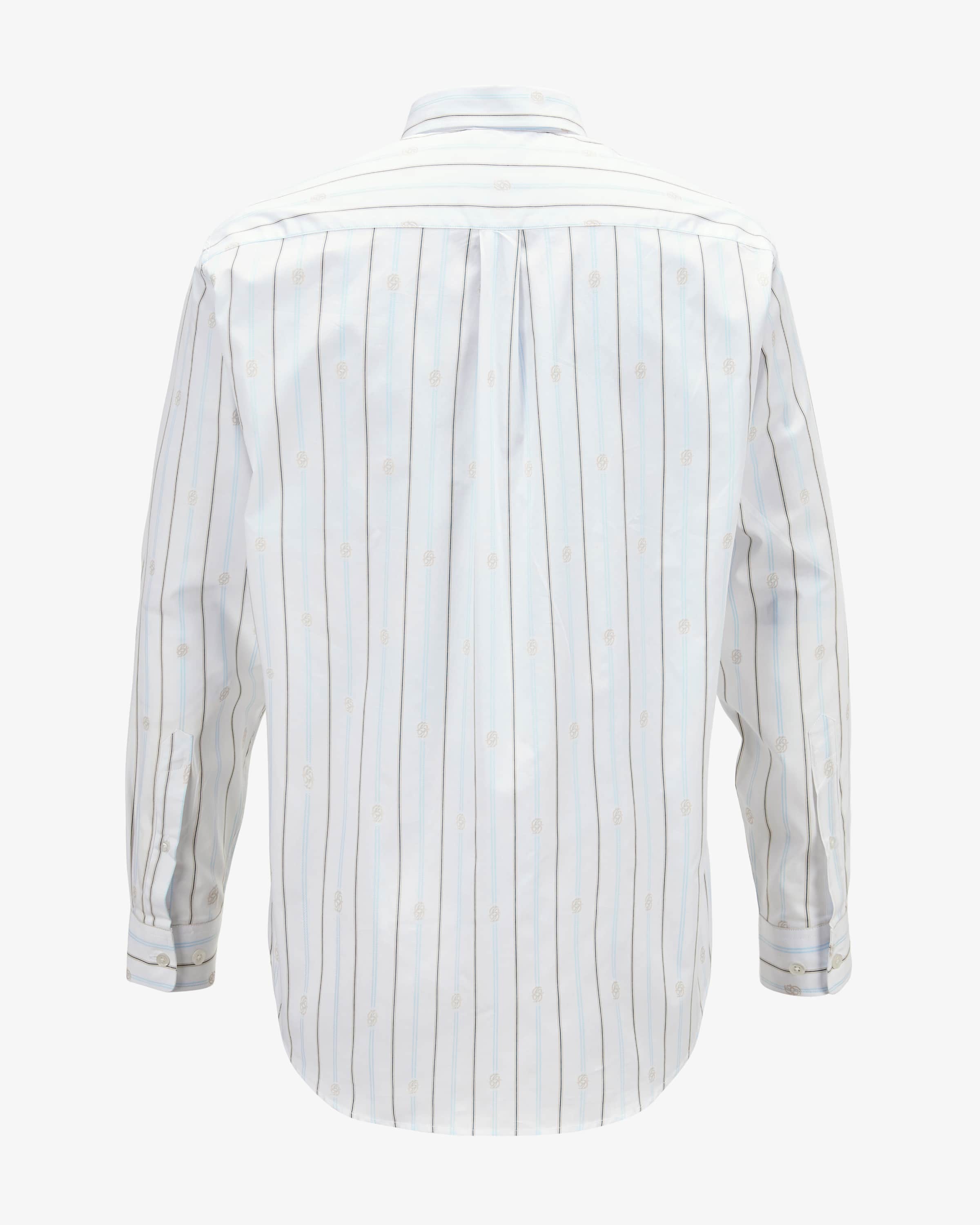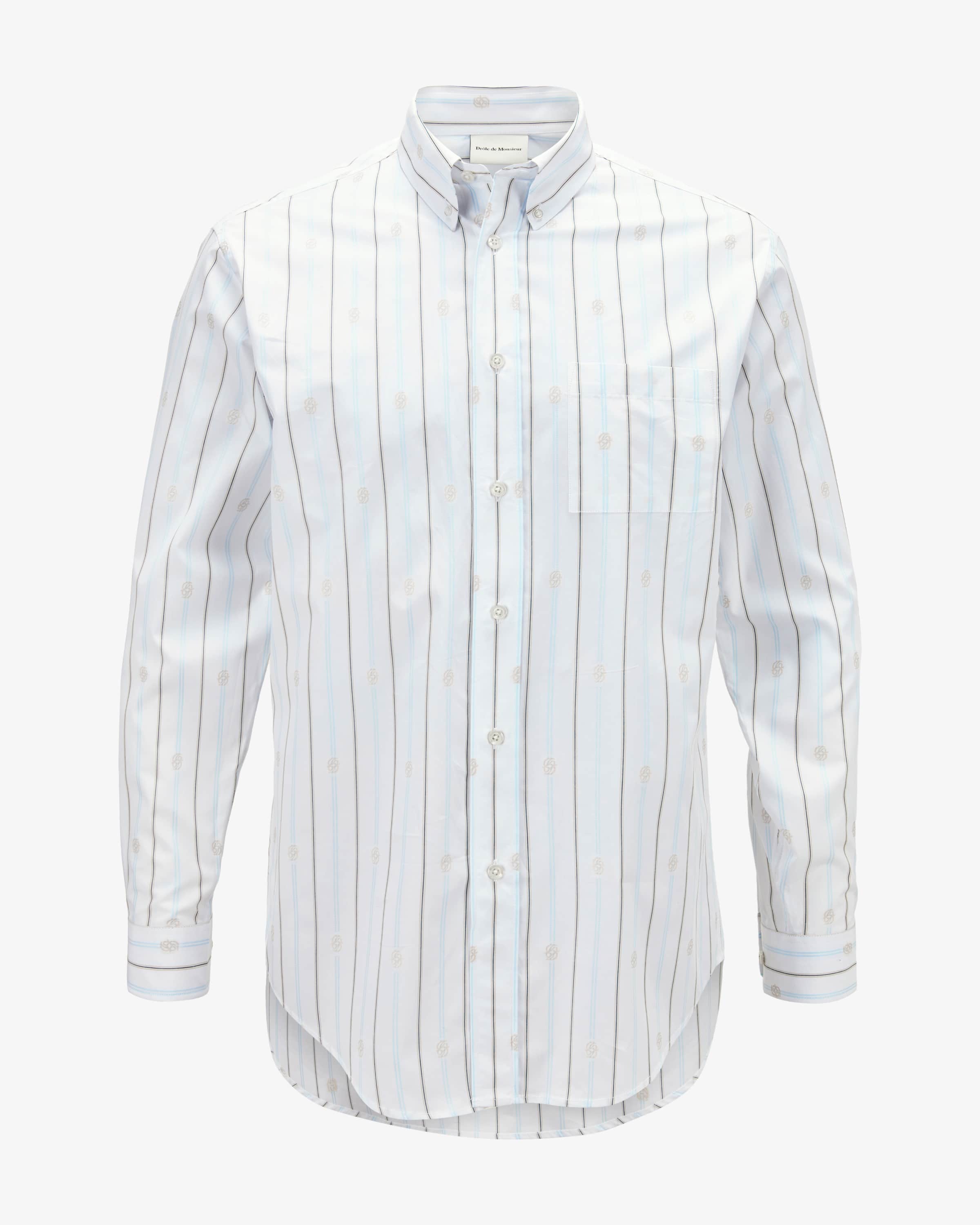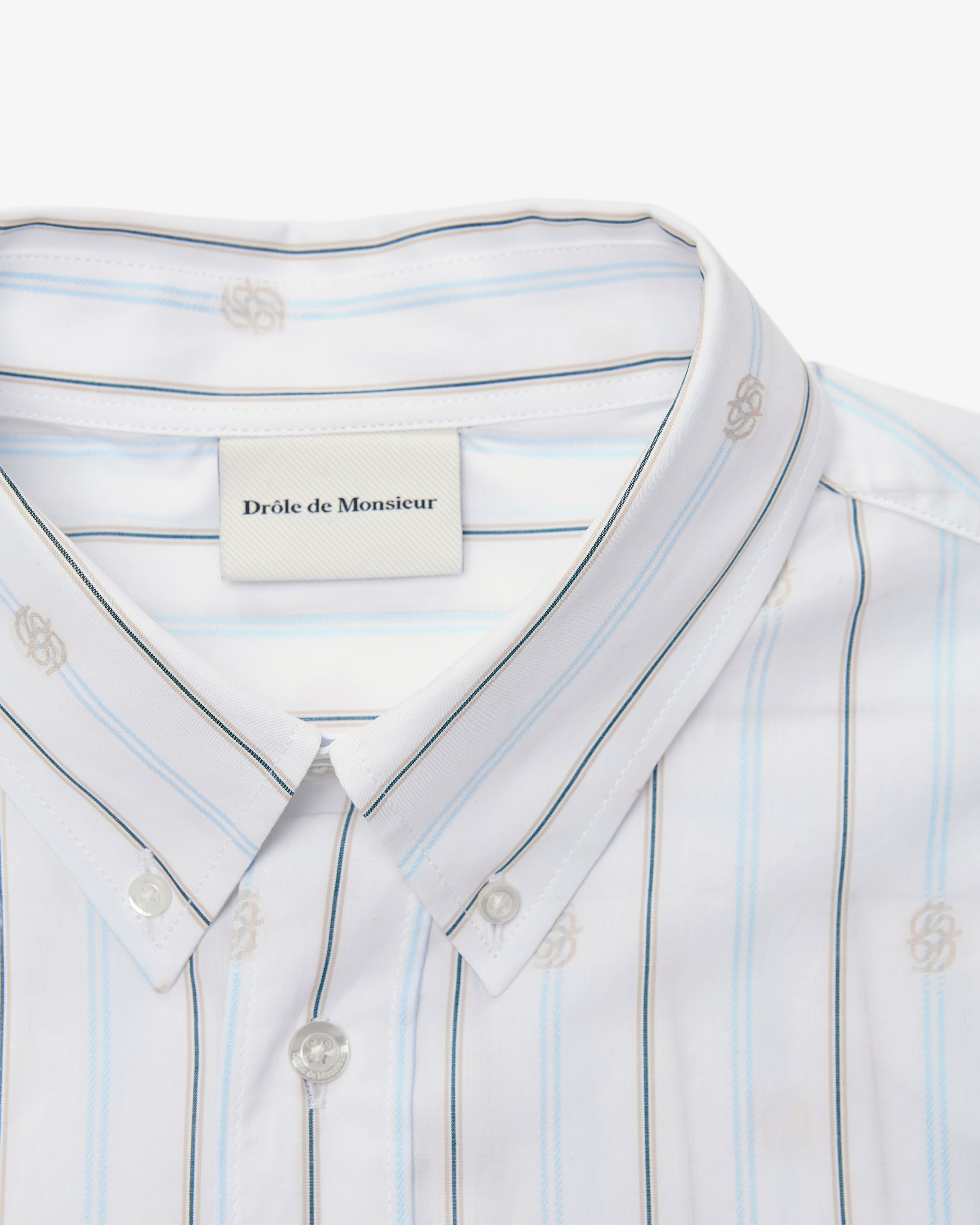 Casualhemd für Herren von Drole de Monsieur in Weiß, Hellblau und Beige. Das Label wurde 2014 in Dijon gegründet und steht für einzigartige, tragbare Designs mit retro-inspirierter Ästhetik. Das Modell präsentiert sich mit hochwertiger Baumwoll-Qualität, während klassische Details sowie das feine Streifenmuster mit eingewebtem Monogramm das maskuline Gesamtbild gekonnt abrunden.