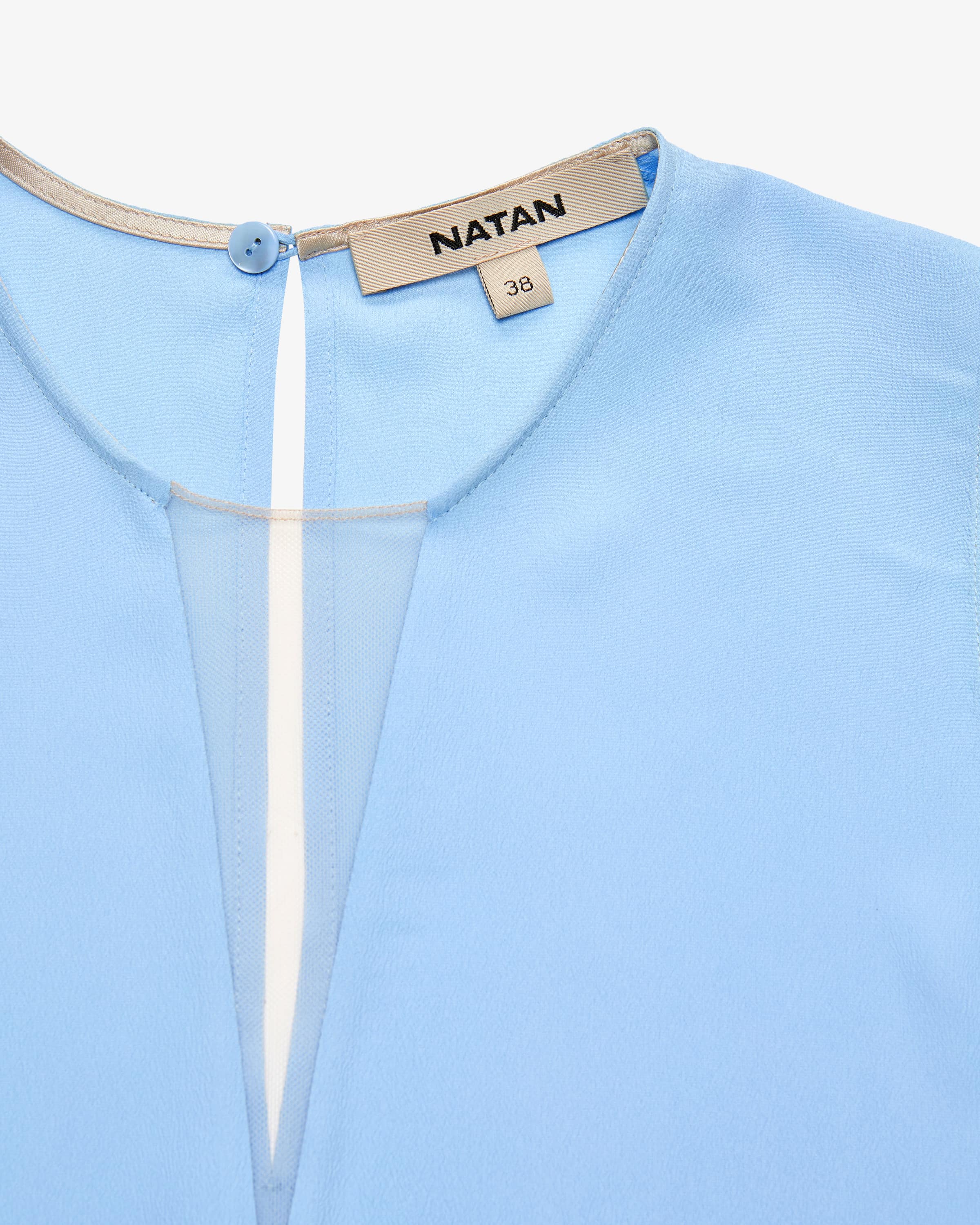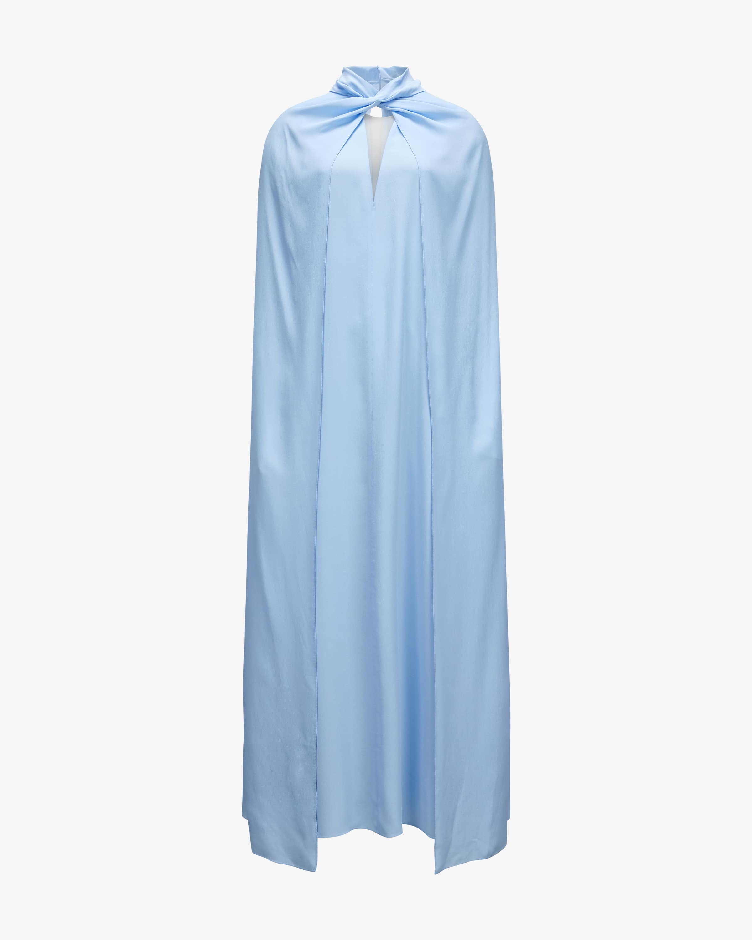 Daphi Kleid für Damen von Natan in Hellblau. Das Modell zeichnet sich durch die fließende Verarbeitung mit Seide aus, welche sowohl haptisch als auch optisch überzeugt. Das abnehmbare Cape mit Stehkragen und feinen Raffungen rundet den extravaganten Abend-Look gekonnt ab.