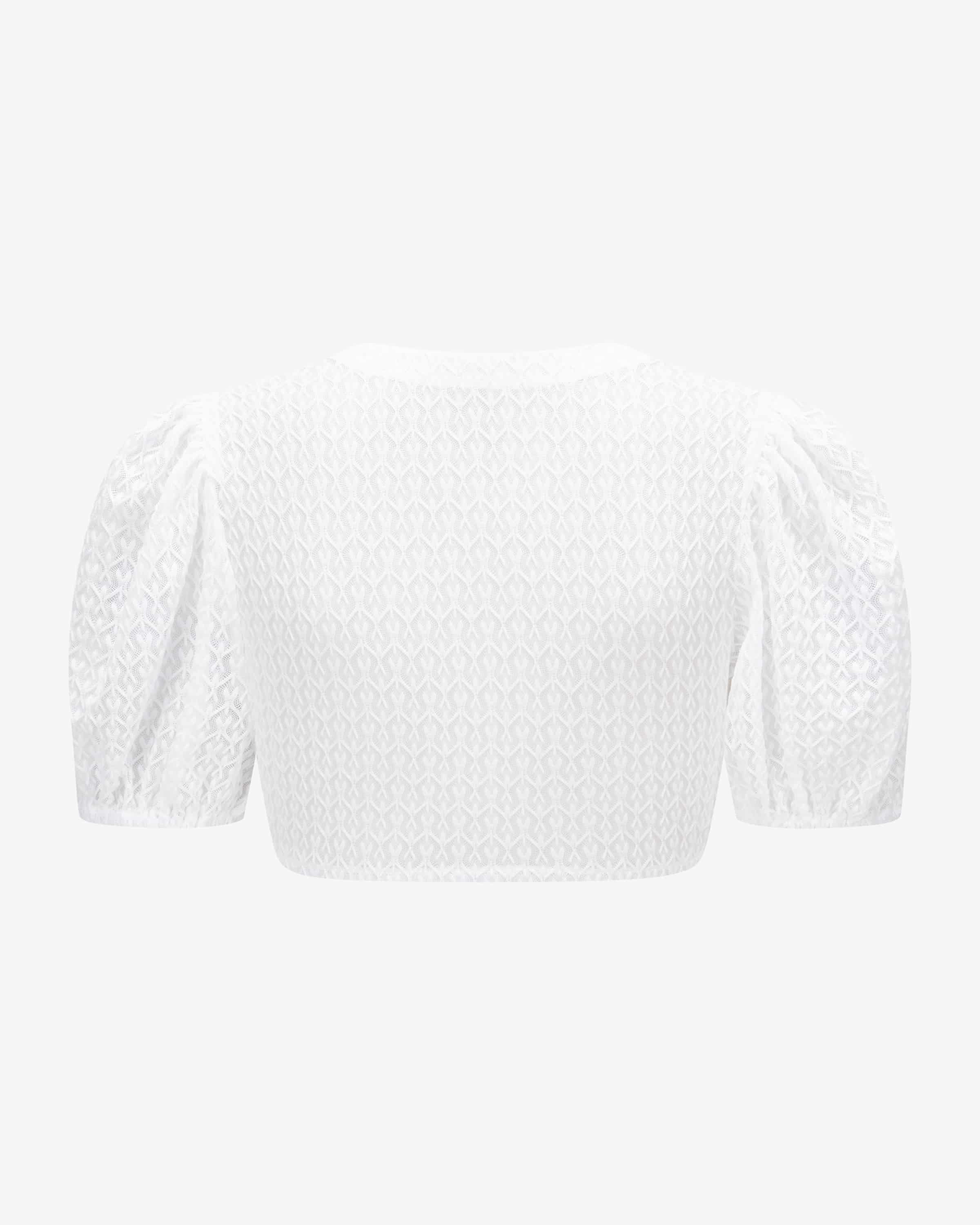 Dirndlbluse für Damen von LODENFREY in Weiß. Das Modell punktet dank der semi- transparenten, strukturierten Material-Qualität in modischer Aufmachung, während die femininen Puffärmel das traditionelle Gesamtbild stilvoll inszenieren.