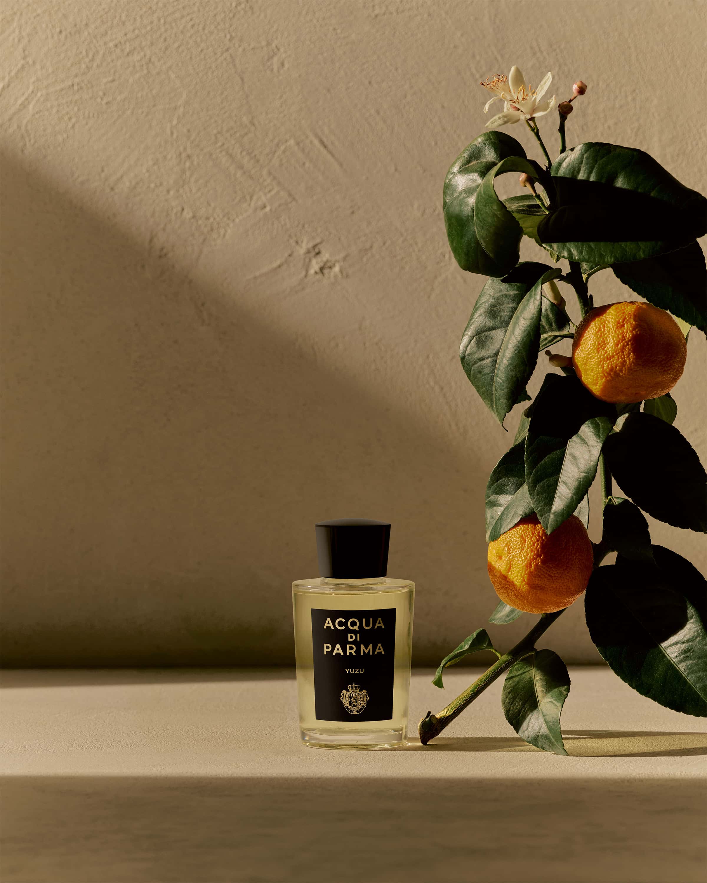 Eau de Parfum Yuzu 180ml von Acqua di Parma. Die italienische Maison lebt voll und ganz im Moment, um die Düfte für die Ewigkeit einzufangen. Die Yuzu Frucht, bekannt als die kostbarste Frucht Japans, ist nun das neueste Mitglied der Acqua di Parma "Frutti d'Oro" Familie. Der Duft verbindet das bittersüße Aroma Yuzus mit den bekannten zitrischen Noten. Der spritzige und vitalisierende Duft kombiniert die Frische Yuzus mit Noten von Bergamotte, Mimosa, Veilchenblättern und Jasmin.