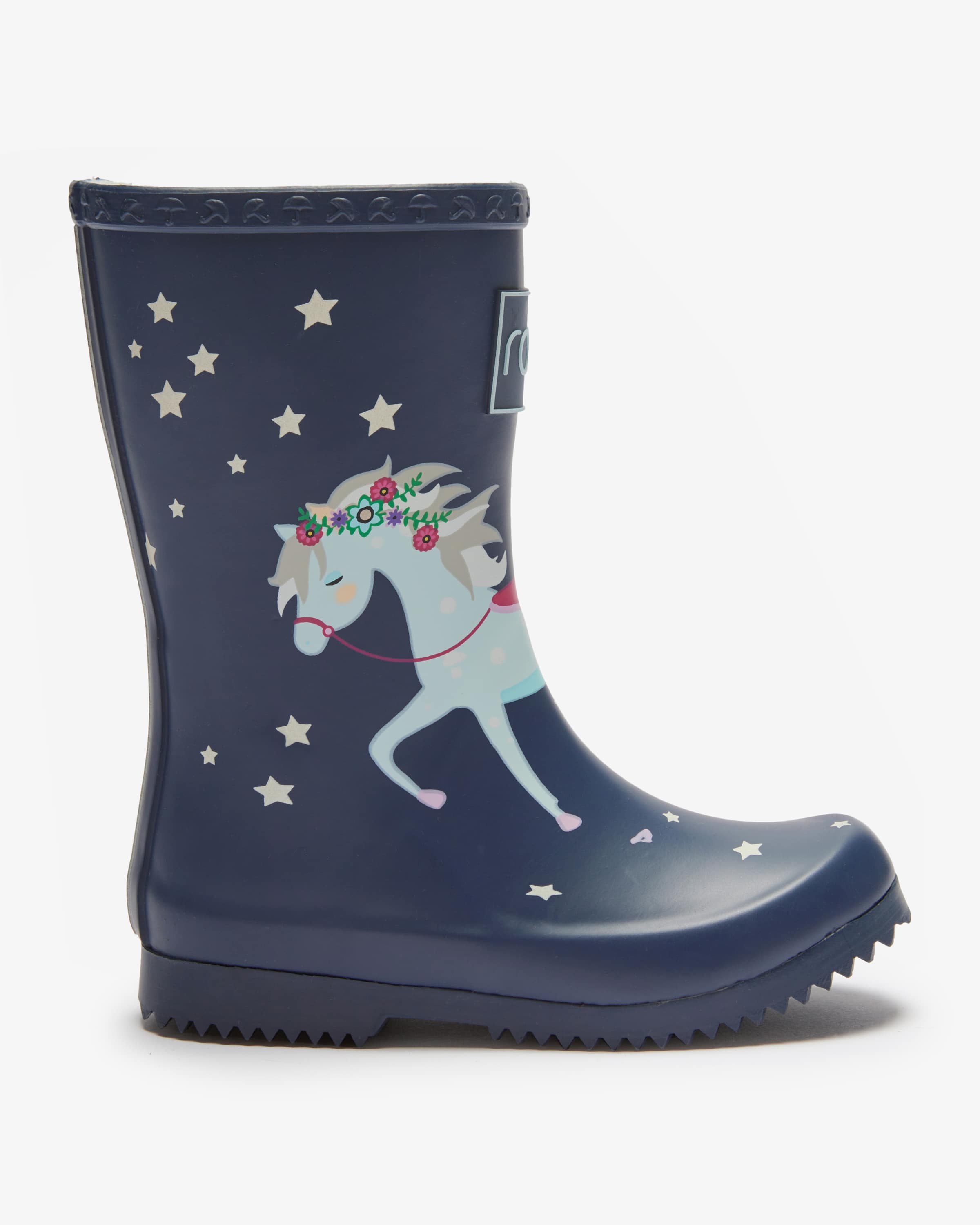 Gummistiefel für Mädchen von Rajn in Navy, Hellblau und Pink. Ein funktionaler Begleiter mit niedlichem Charakter – Dieses Modell wappnet Ihr Kleines optimal vor Kälte und Nässe, während das verspielte Pferde-Motiv im Sterne-Himmel süße Akzente setzt.