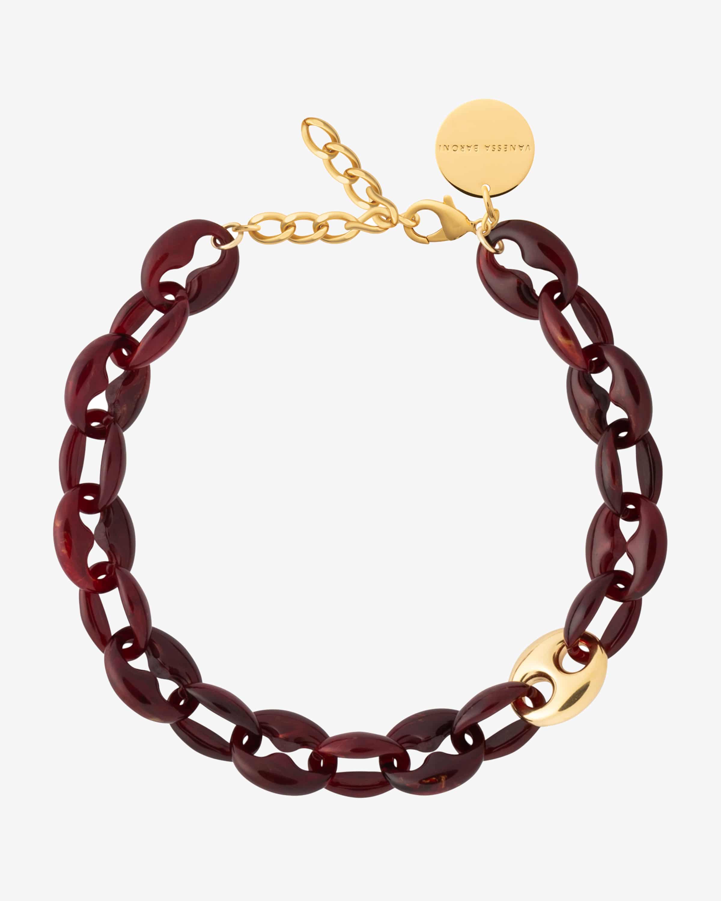 Halskette Small Turtle Short Marble für Damen von Vanessa Baroni in Bordeaux und Gold. Das im Jahr 2009 gegründete Label Vanessa Baroni wurde von der gleichnamigen Designerin gegründet mit dem Ziel, markante Accessoires für angesagte Looks schaffen. Dabei stammt die Inspiration von Reisen, Kunst sowie der aktuellen Mode. Auch diese Halskette mit dezent marmorierten Gliedern überzeugt durch ihr stilvolles Design und verleiht jedem Look eine edle Note.