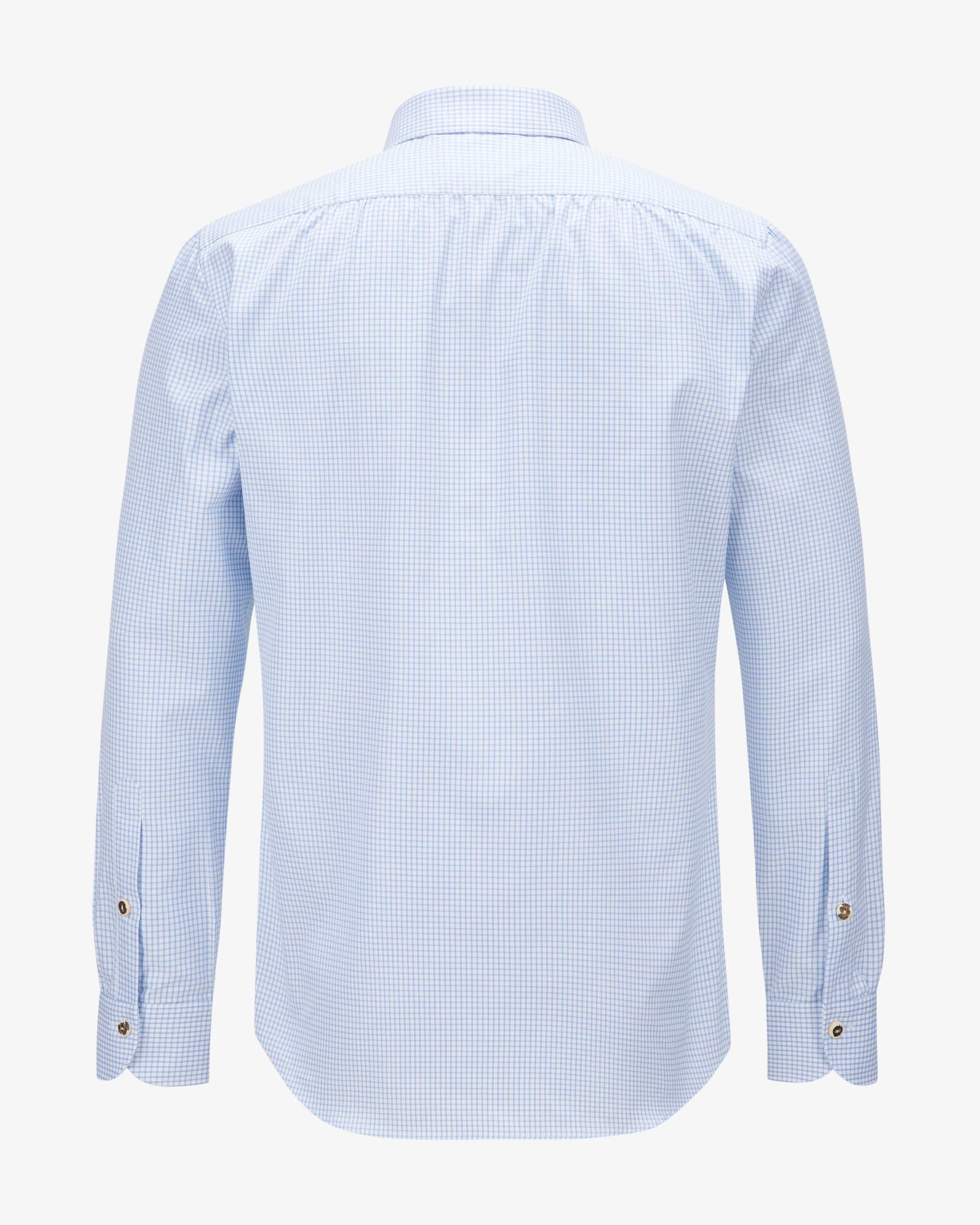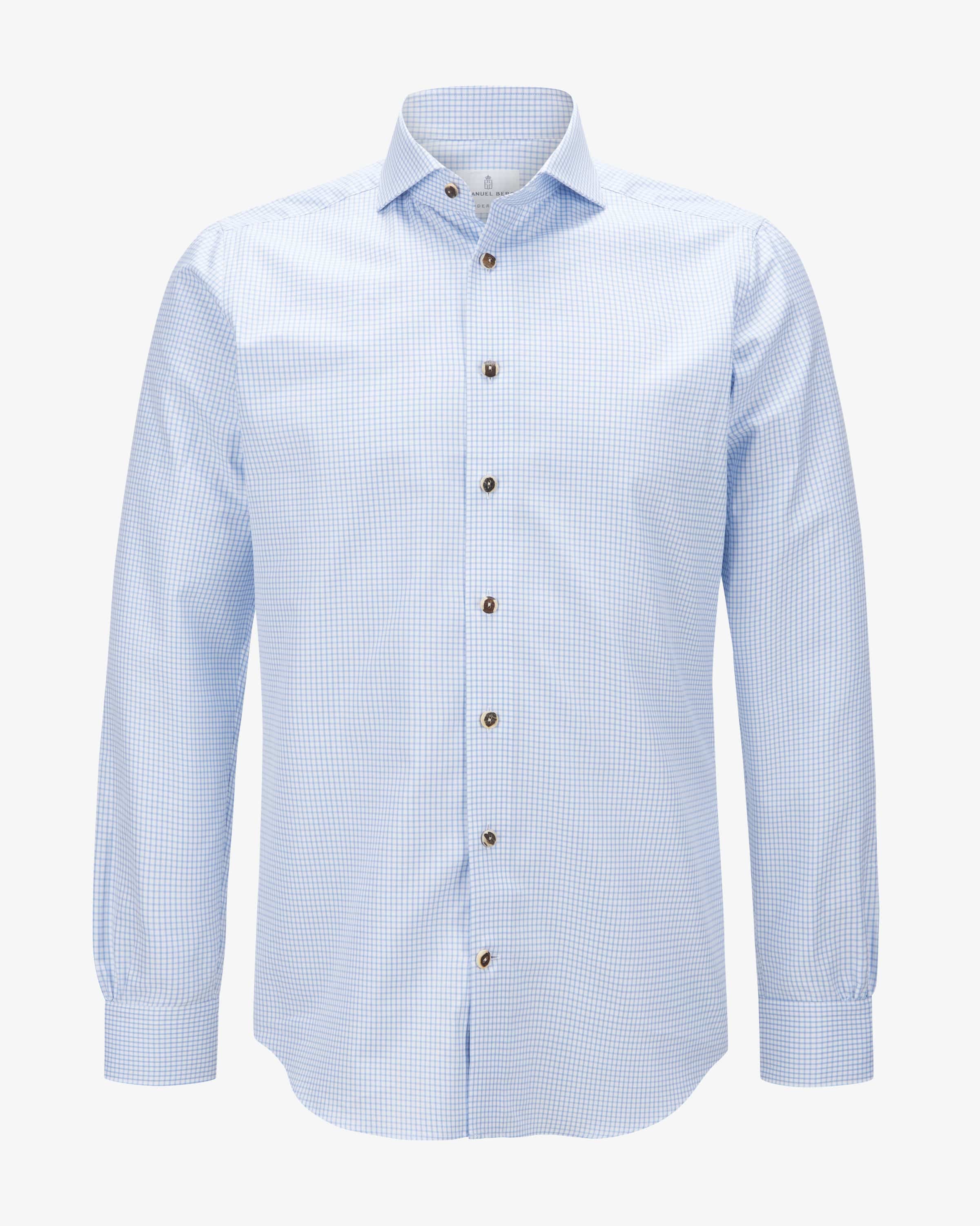 Harvard Trachtenhemd für Herren von Emanuel Berg in Hellblau und Weiß. Das Modell überzeugt durch die schmale Passform und die feine Webqualität aus angenehmer Baumwolle, während rustikale Knöpfe besondere Akzente setzen.