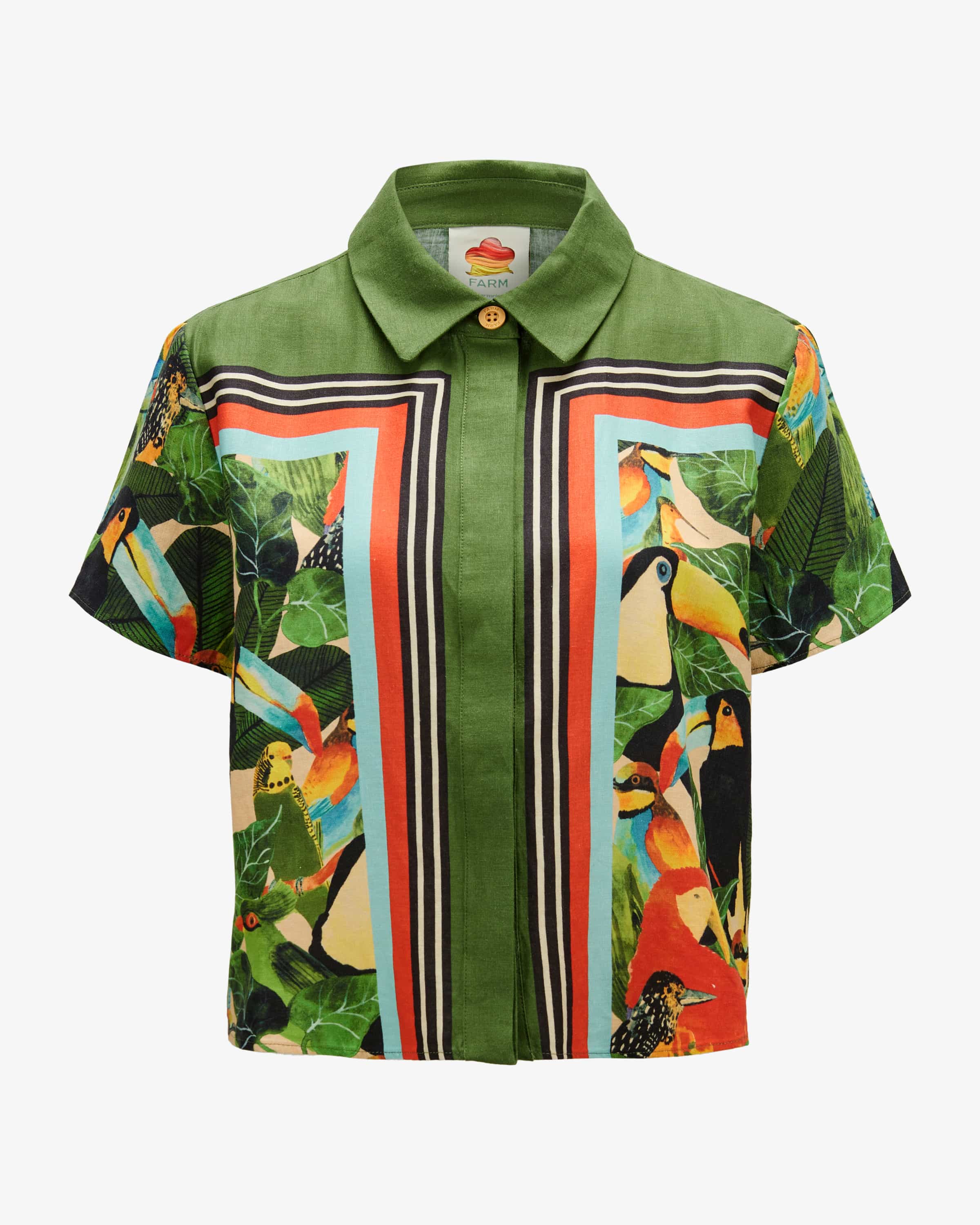 Hemdbluse Bird Leaf für Damen von Farm Rio in Grün und Bunt. Die brasilianische