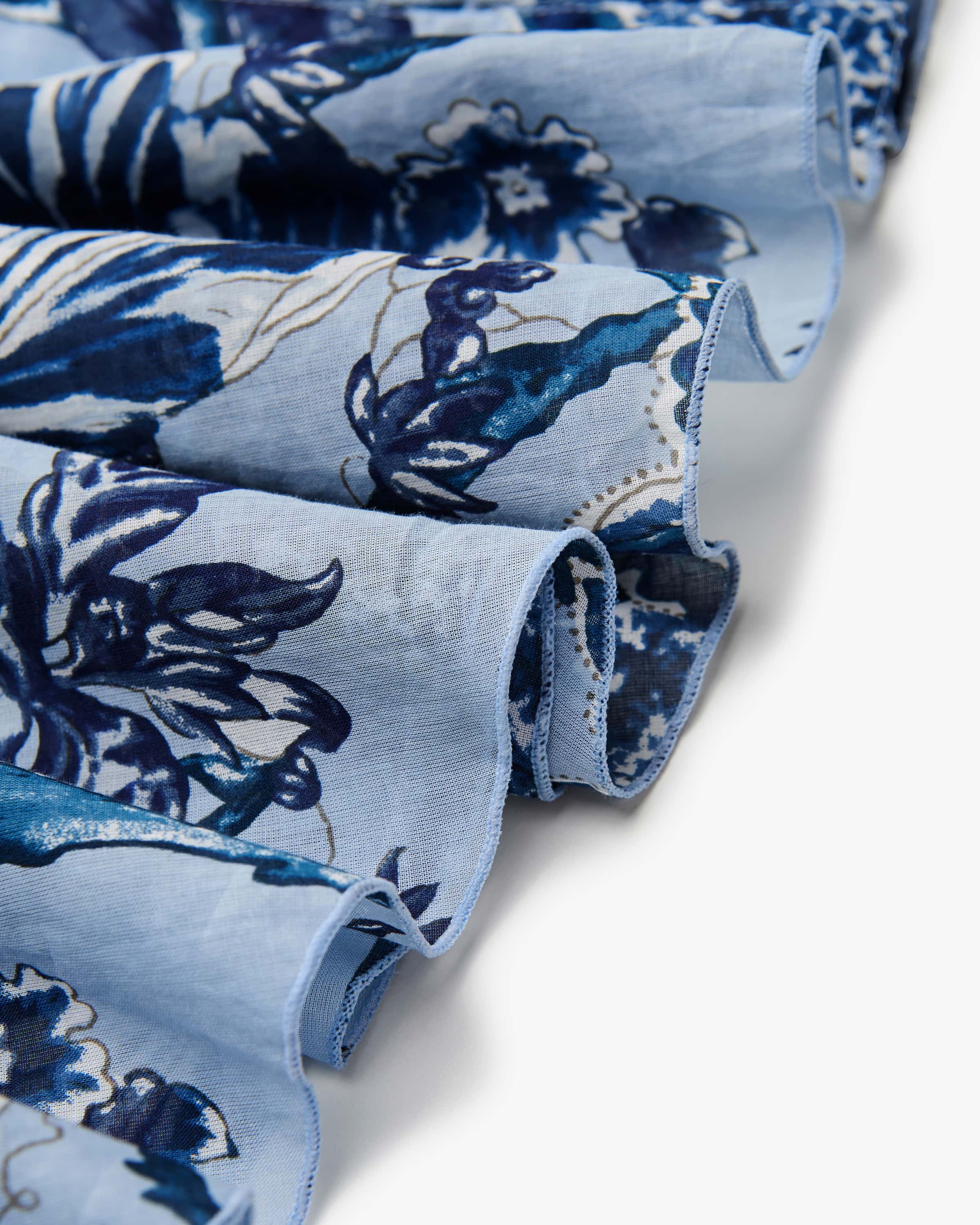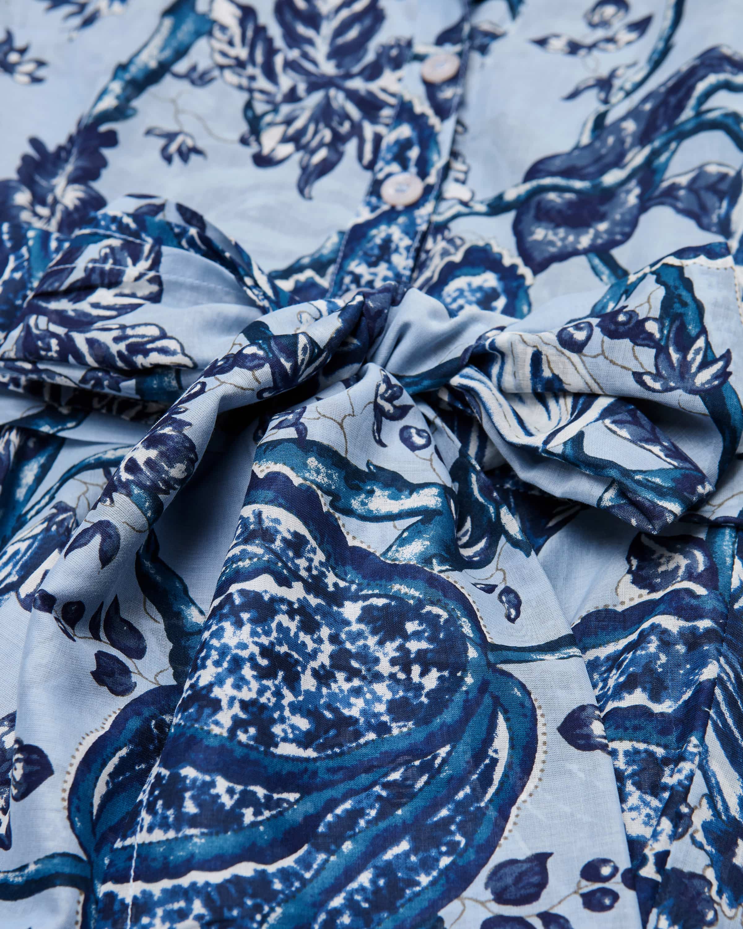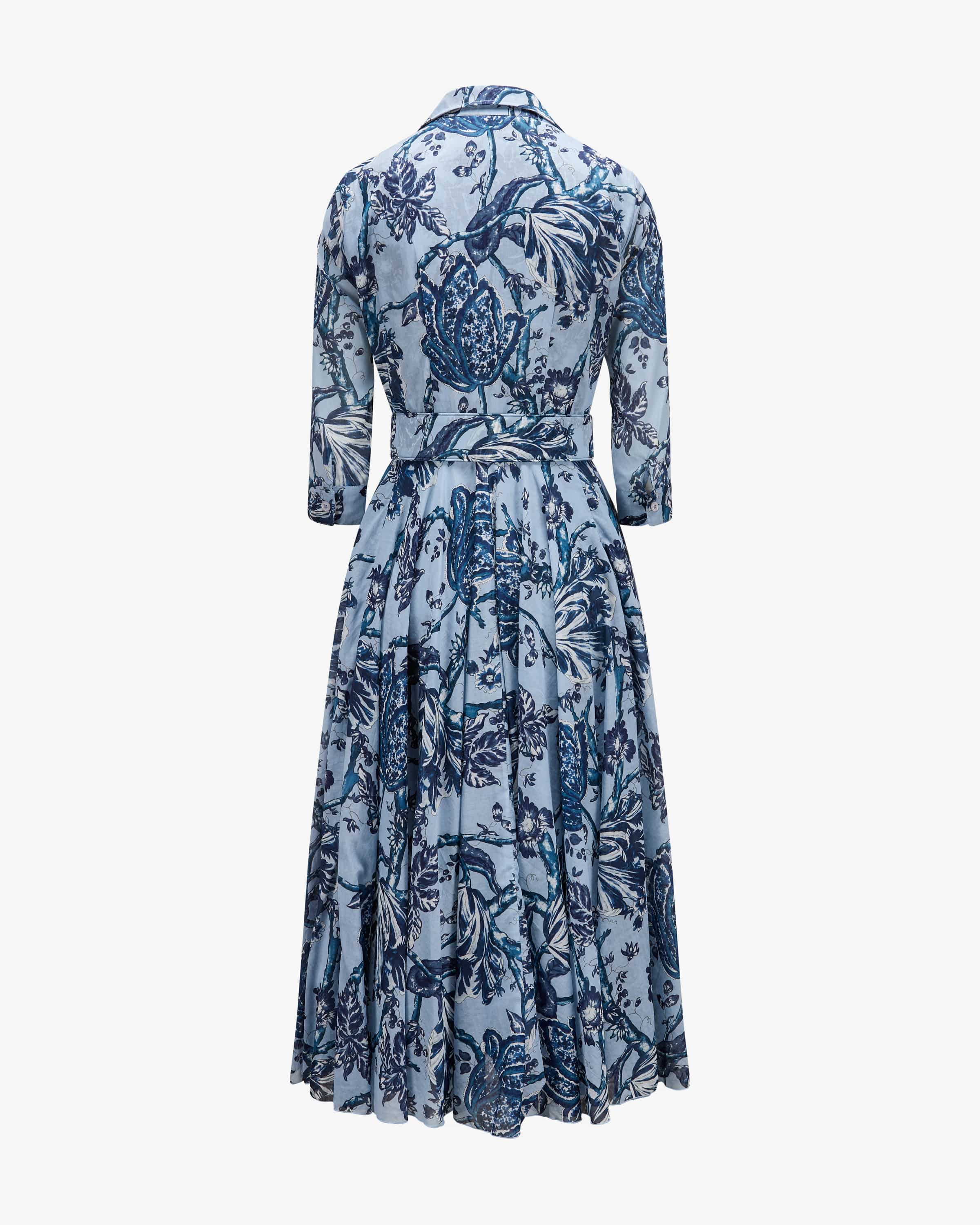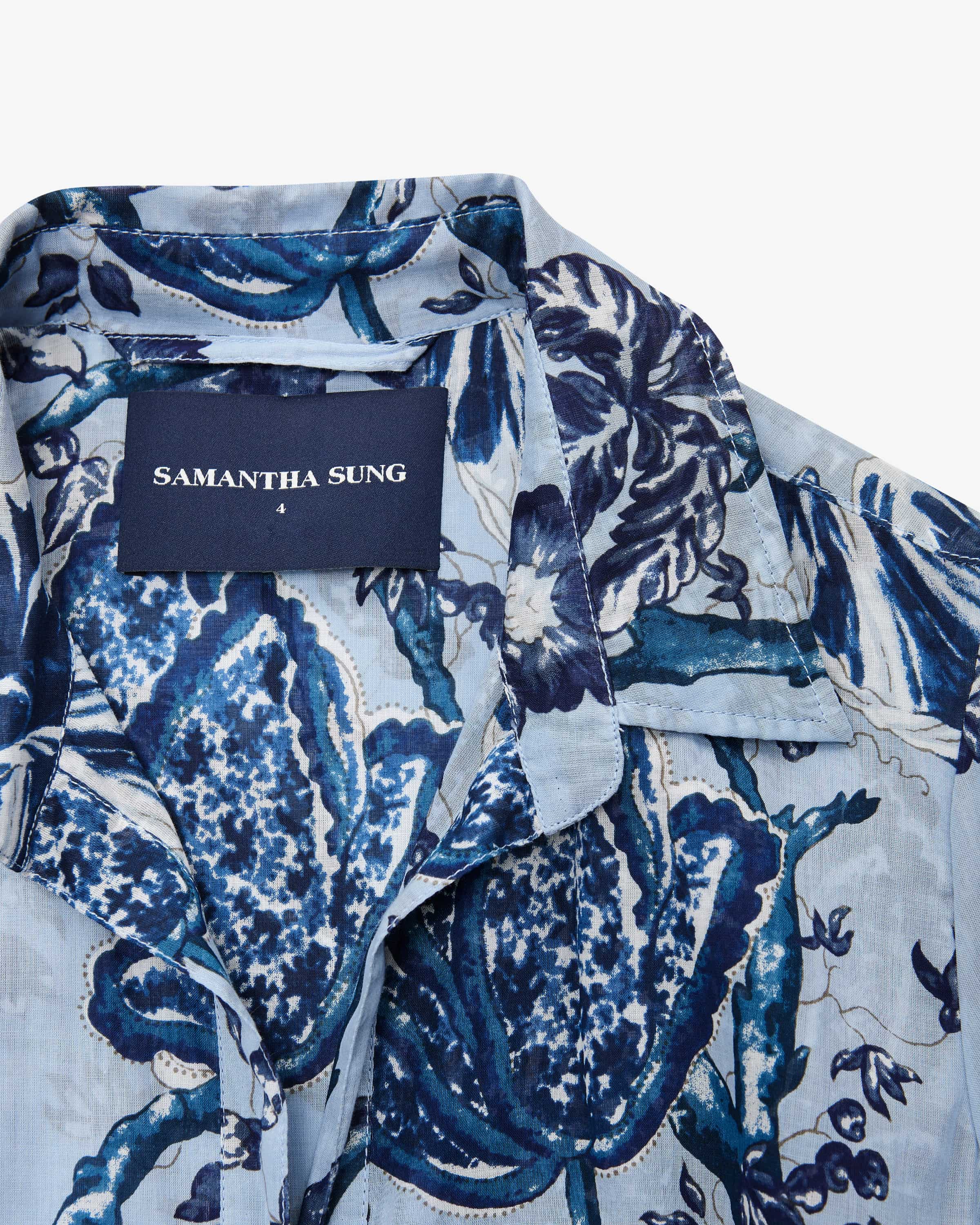 Hemdblusenkleid Aster Lillie Toile Pastel für Damen von Samantha Sung in Hellblau, Dunkelblau und Weiß. Die in New York lebende Designerin ist bekannt für strukturierte Hemdblusenkleider mit opulenten Mustern und Taillenbetonung. Auch dieses weit ausgestellte Modell präsentiert sich dank des floralen Toile- Prints als stilvoller Favorit, während die doppellagige Aufmachung der leichten Baumwoll-Batist-Qualität zusammen mit den zwei Gürtel-Optionen sommerlich- feminine Looks kreiert.