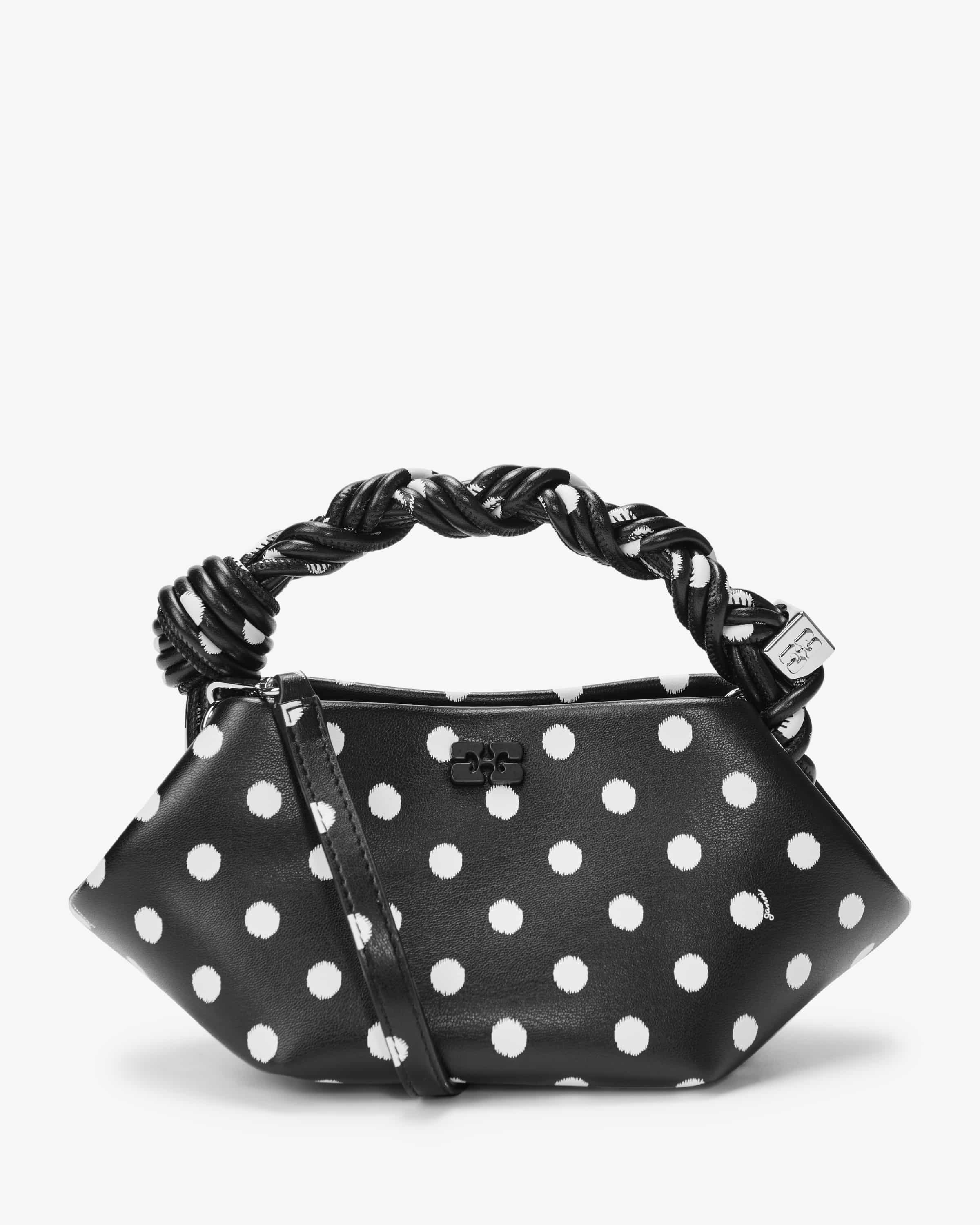 Henkeltasche Bou Mini für Damen von Ganni in Schwarz und Weiß. Die dänische Contemporary-Marke aus Kopenhagen definiert verspielte Prints, lässige Schnitte und Scandi-Coolness neu – unkompliziert, kreativ und voller Persönlichkeit. Während die recycelte Glattleder-Verarbeitung für ein hochwertiges Gesamtbild sorgt, setzen das Polkadot-Dessin zusammen mit silberfarbenen Logo-Elementen modische Akzente. Die organische Form sowie der extravagante Henkel in geflochtener Aufmachung kreieren einen kombistarken und zugleich stilsicheren Begleiter.