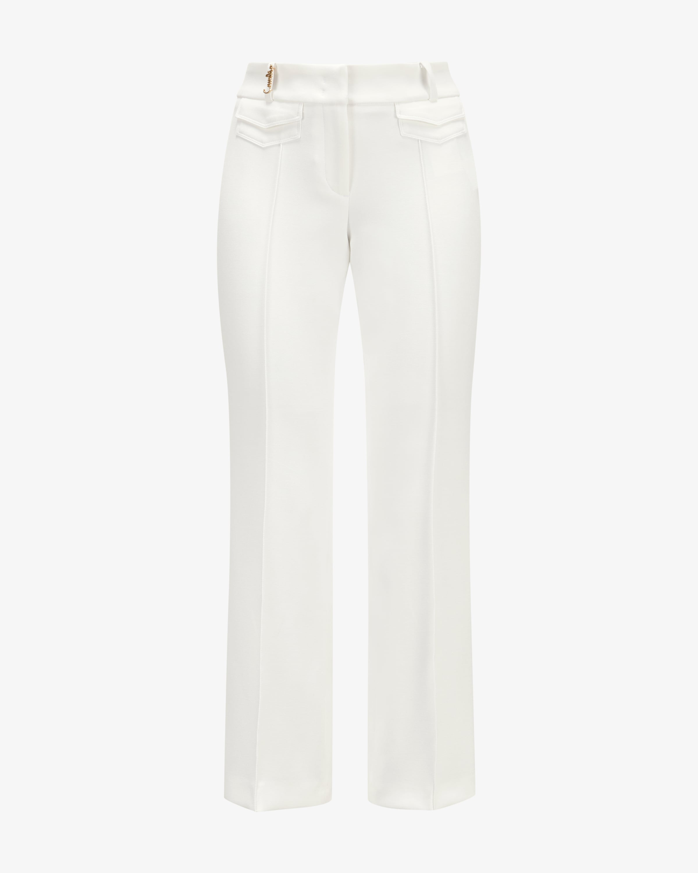 Hose Farrah Flap Pocket für Damen von Cambio in Weiß. Das Premium-Hosenlabel aus Deutschland ist bekannt für perfekte Passformen, modische Schnitte und hohe Qualität. Auch dieses Modell besticht dank der femininen Silhouette und der abgenähten Bügelfalten in eleganter Aufmachung, während die kleinen Taschen sowie das goldfarbene Logo-Detail an der Gürtelschlaufe den Look mit besonderer Note komplettieren.