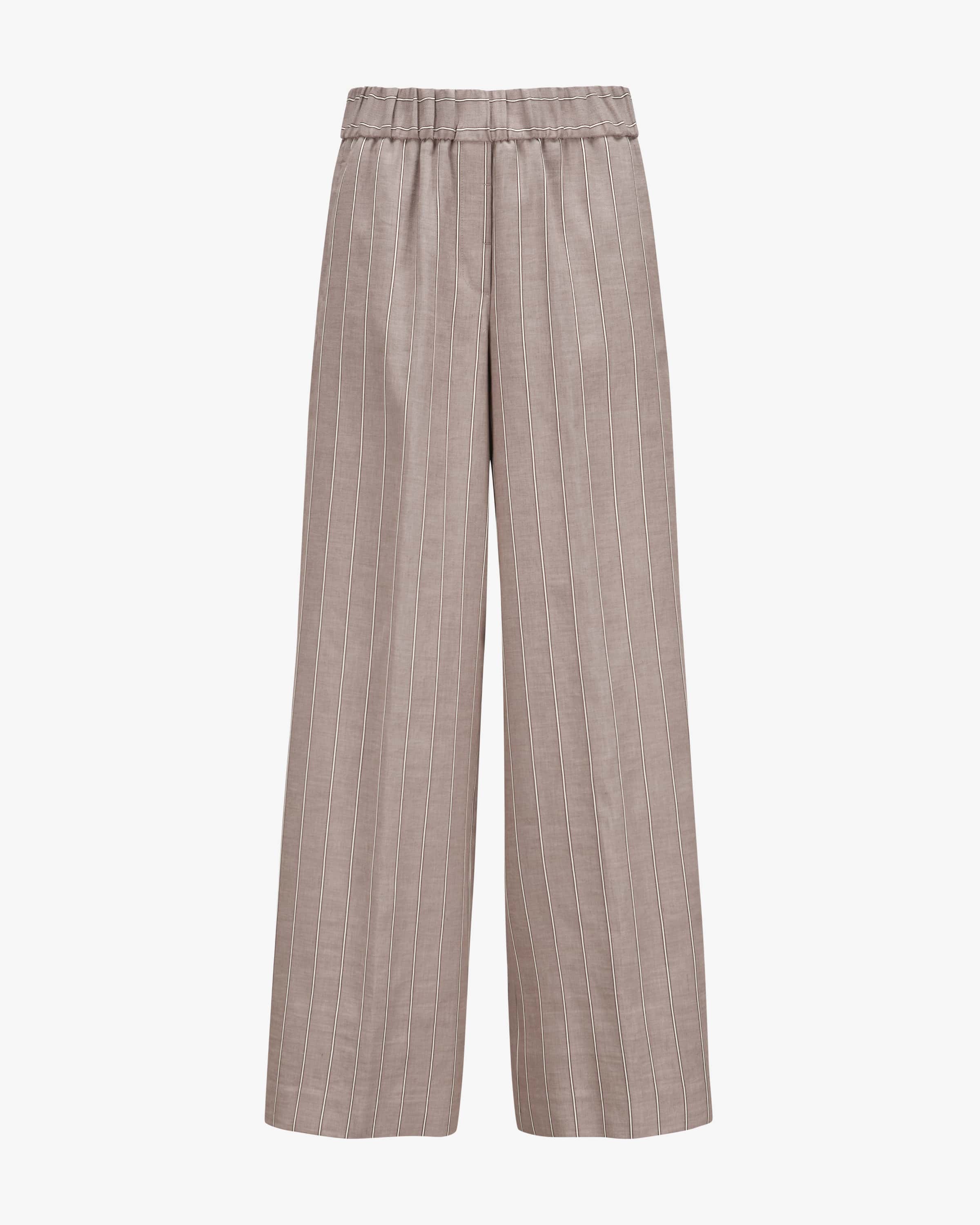 Hose für Damen von Peserico in Taupe und Weiß. Die italienische Marke steht für feine Damenmode mit Fokus auf Materialien, Passform und Handwerkskunst. Auch dieses weite Modell präsentiert sich mit kühlenden Leinen-Baumwoll-Mix, der angenehmen Tragekomfort garantiert. Das edle Streifenmuster rundet den feminin- legeren Skandi-Look harmonisch ab.