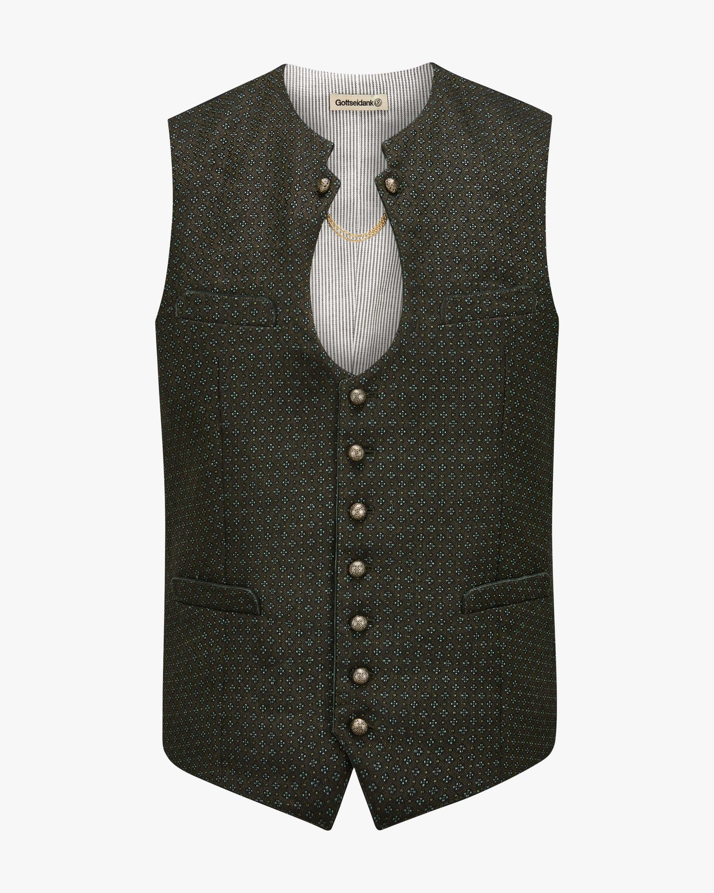 Ignaz Trachtenweste für Herren von Gottseidank in Bronzegrün, Türkis und Schwarz. Das edle Modell besticht durch die traditionelle Aufmachung mit Ketten- Detail, welche dank verzierter Kugelknöpfe und Samt-Paspeln stilvoll unterstrichen wird. Zugleich setzt das strukturierte vorderseitige Muster den Trachten-Look modern in Szene.