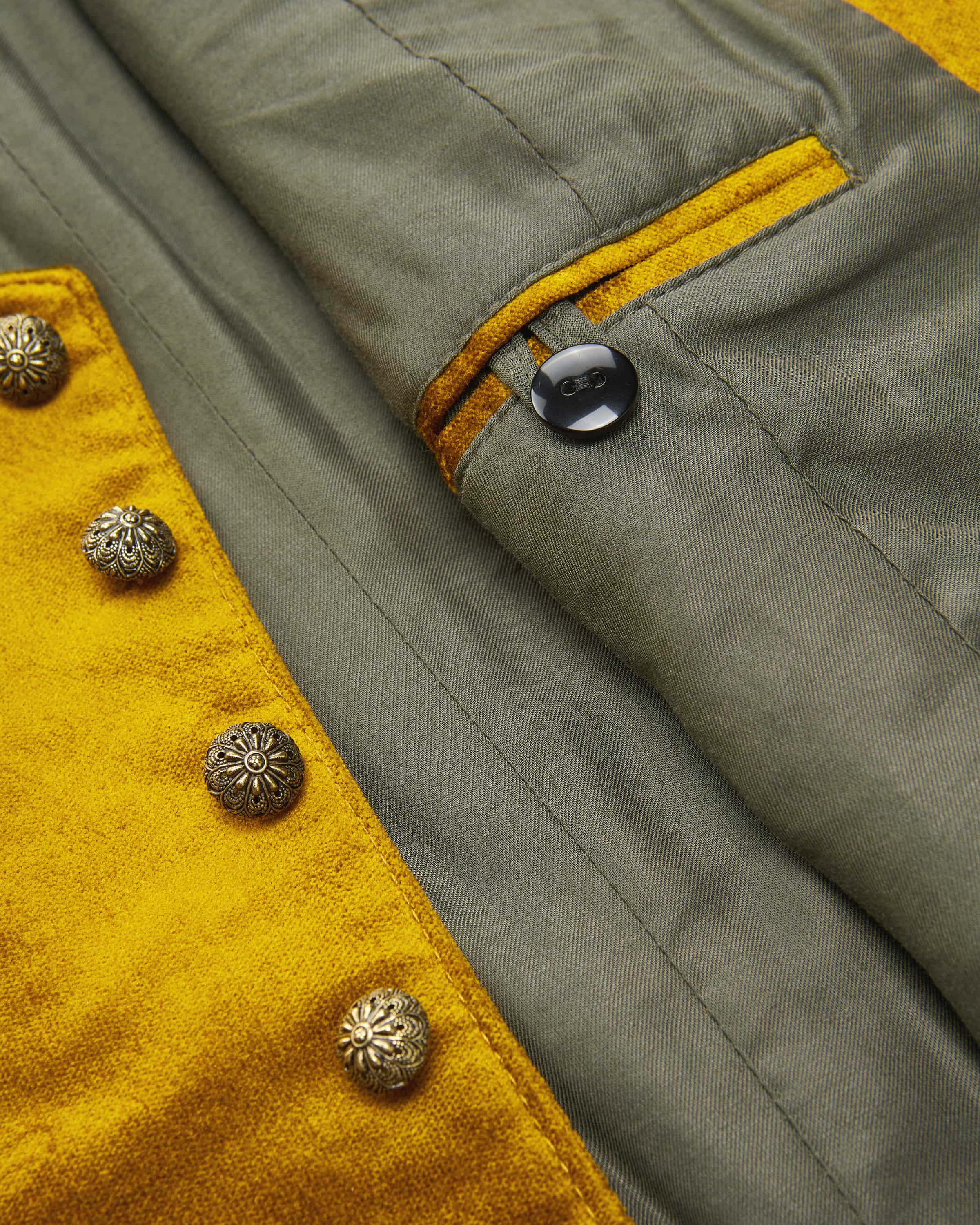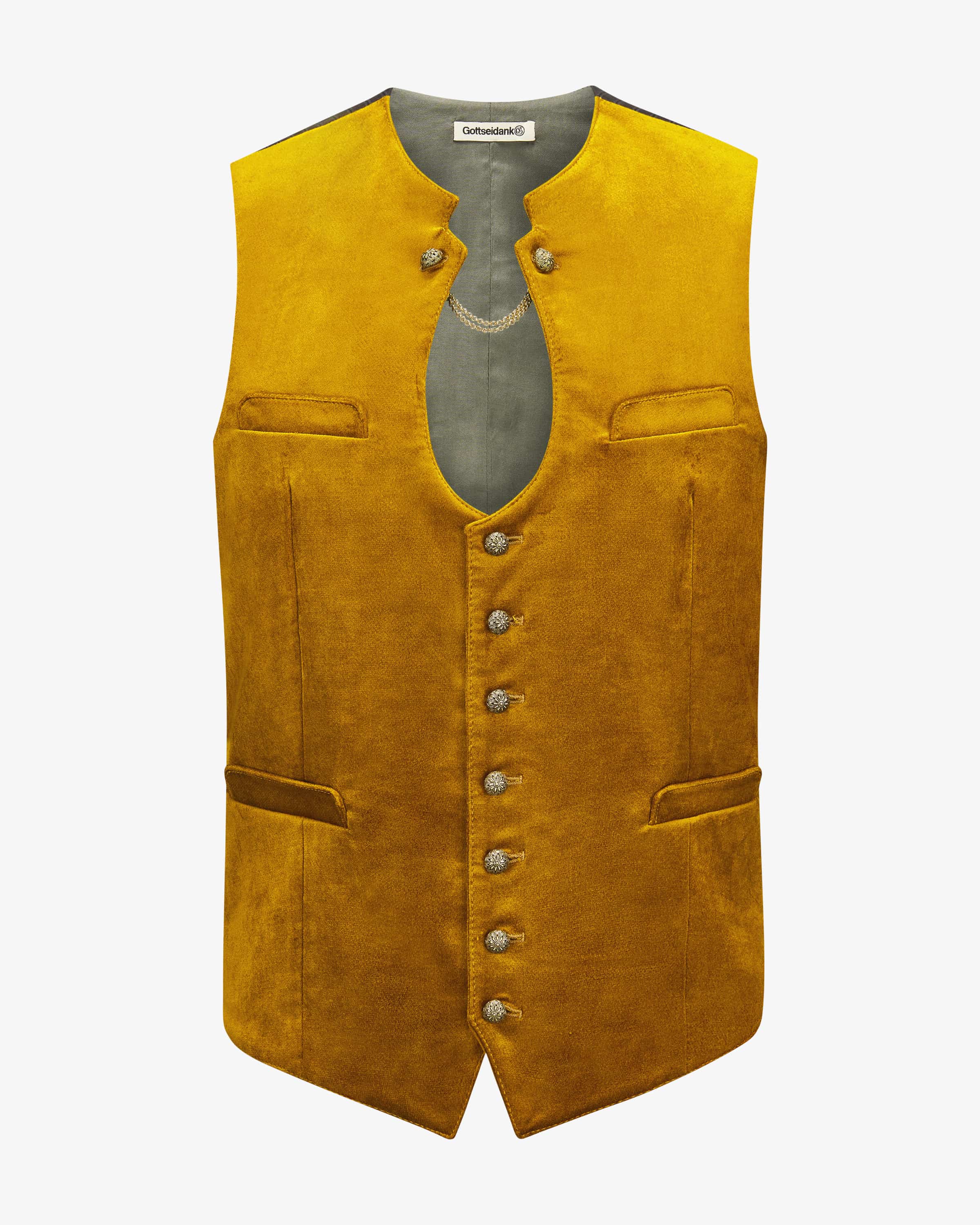 Ignaz Trachtenweste für Herren von Gottseidank in Antikgold, Anthrazit und Schwarz. Das edle Modell besticht durch die besondere Samt-Aufmachung mit traditionellem Ketten-Detail, welche dank verzierter Kugelknöpfe stilvoll unterstrichen wird. Zugleich sorgt die gestreifte Rückseite für einen modernen Akzent.