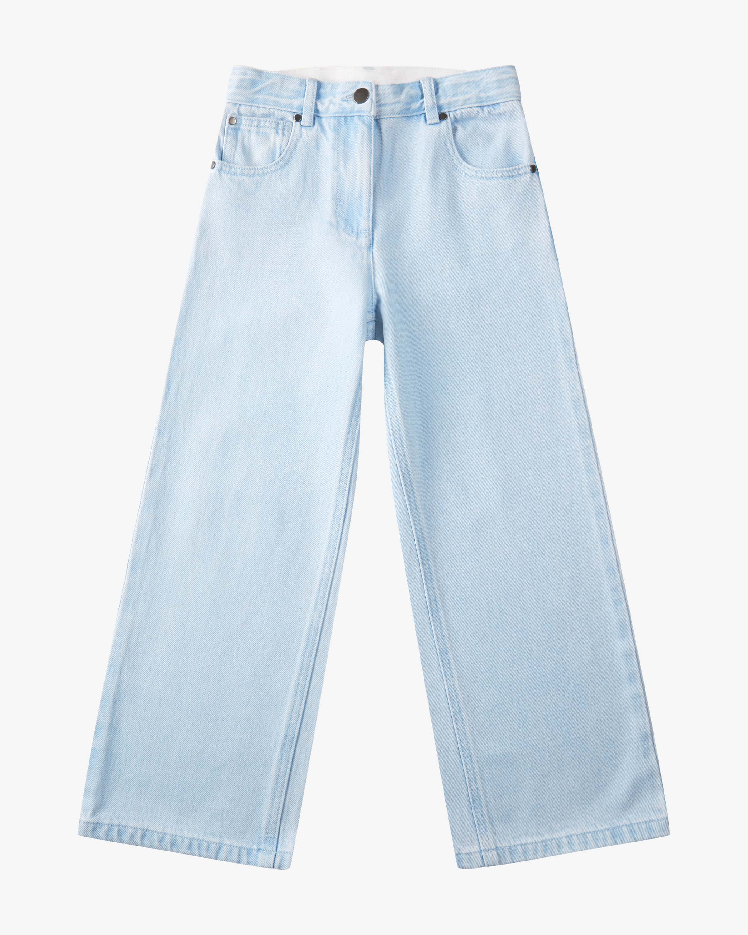 Jeans für Mädchen von Stella McCartney Kids in Hellblau. Mode mit Verantwortung – farbenfroh, frech und aus nachhaltigen Materialien. Das Modell in robuster Denim-Qualität punktet mit weiter Passform mit geradem Bein und verstellbarem Bund, während die rückseitige Blumenranken-Stickerei einen verspielten Touch verleiht.