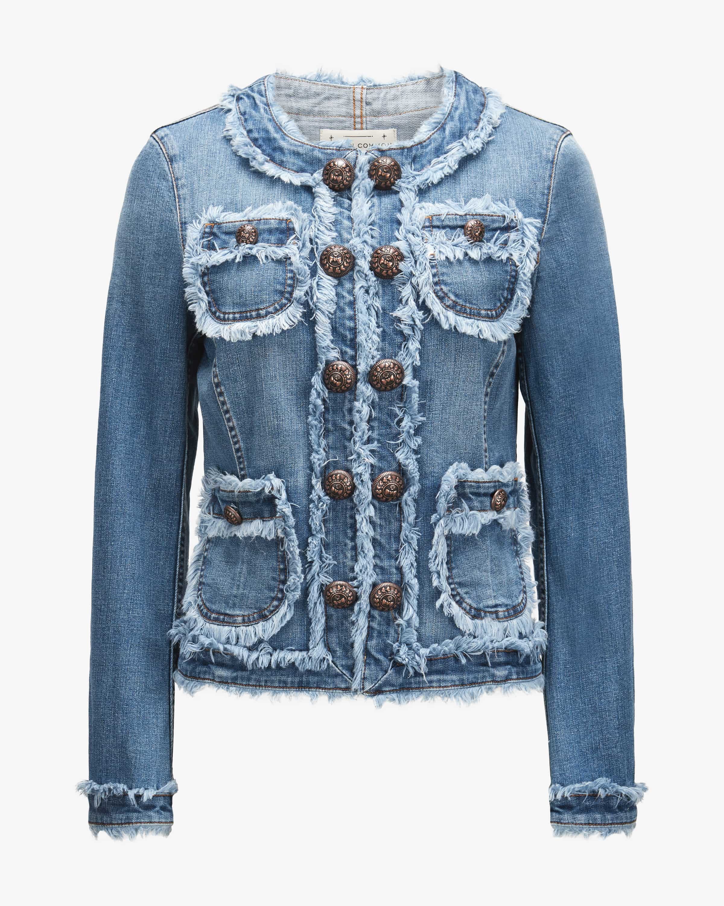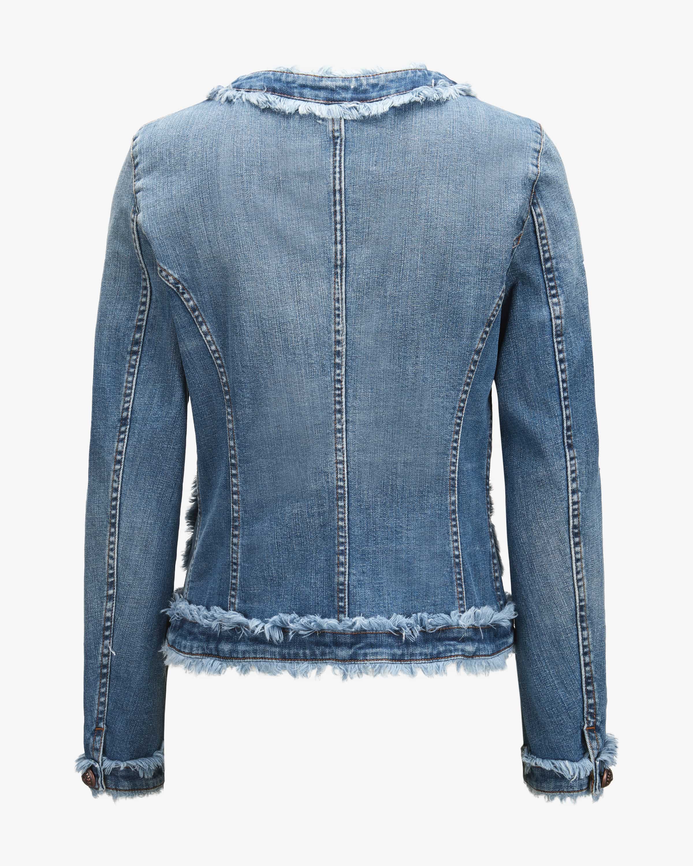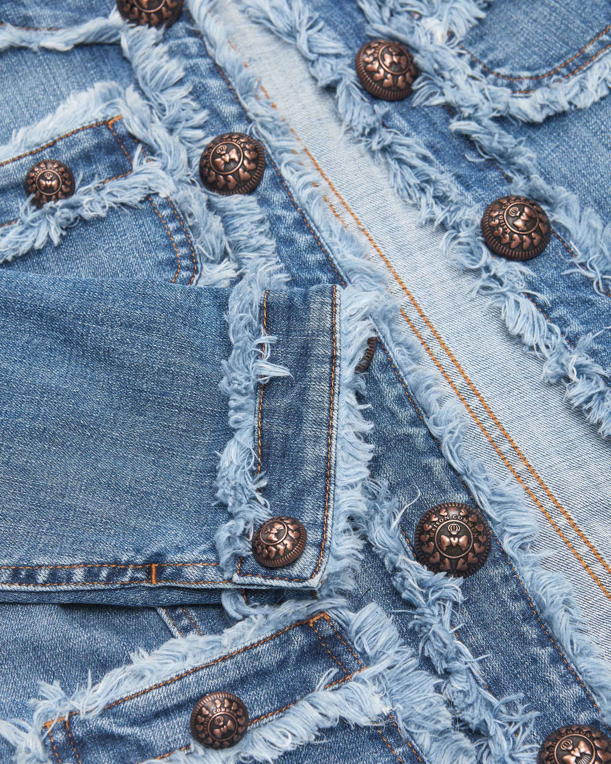 die dekorativen Logo-Knöpfe sowie ausgefransten Details einen extravaganten