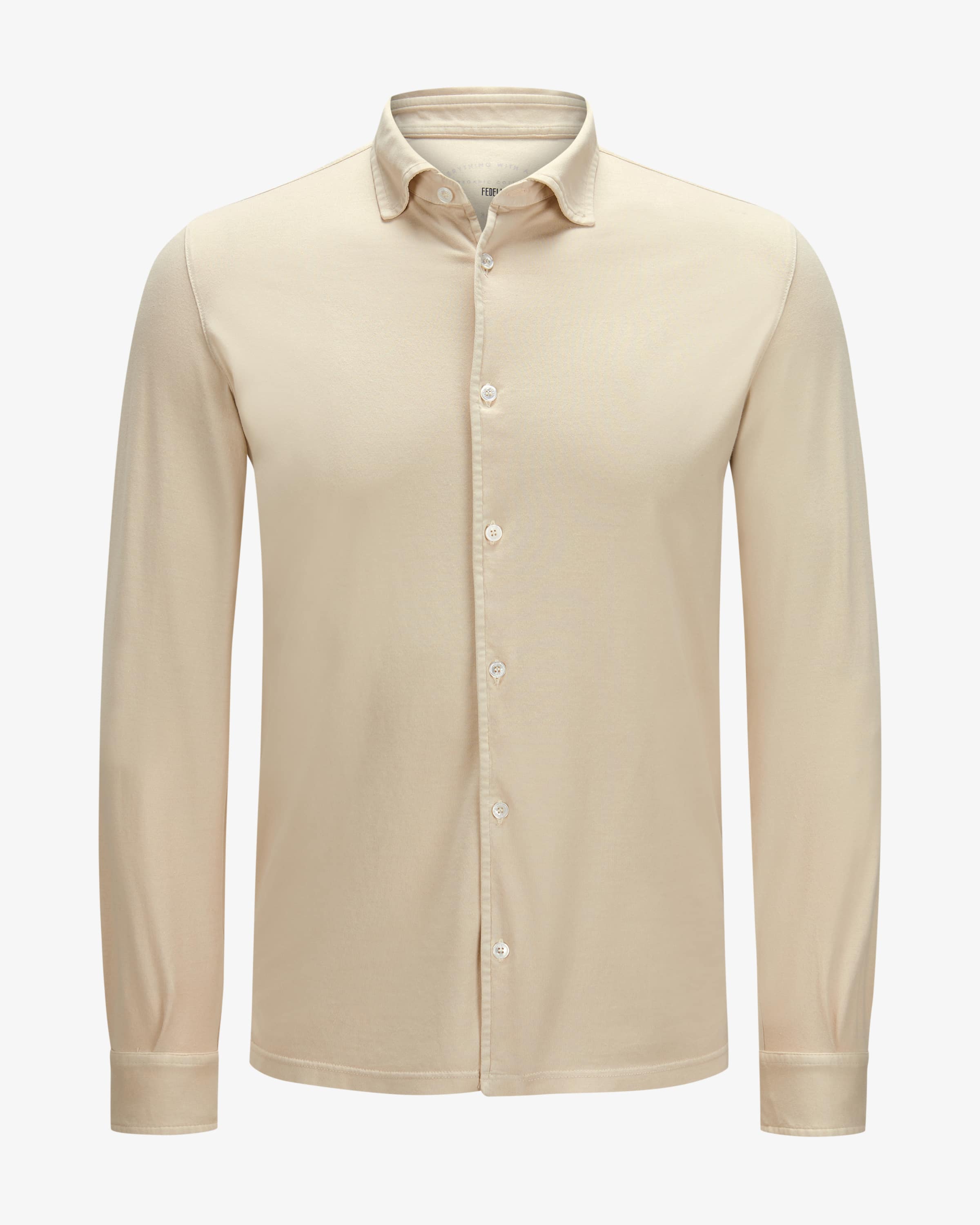 Jason ML Jerseyhemd für Herren von Fedeli in Creme. Dank der markanten Merkmale eines Poloshirts erhält das Freizeit-Hemd einen sportiven Charakter, während die nachhaltige Giza Baumwoll-Verarbeitung in angenehmer Jersey-Qualität hohen Tragekomfort garantiert.