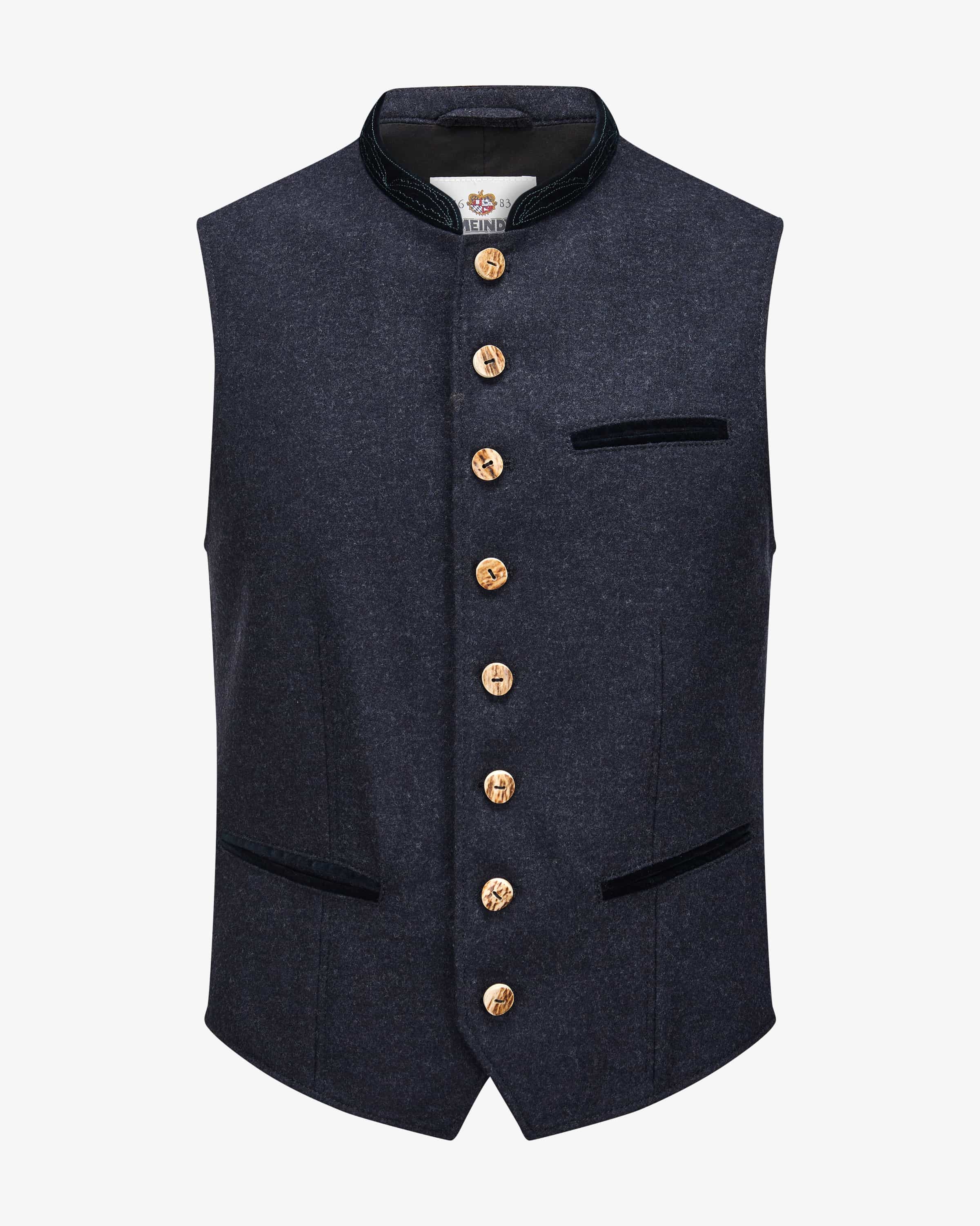 Karwendel Trachtenweste für Herren von Meindl in Navy und Schwarz. Das Modell begeistert dank hochwertiger, elastischer Schurwoll-Qualität mit angenehmen Tragemomenten und traditionellem Charme, welcher durch die Samt-Paspelierungen und Hornknöpfe harmonisch unterstrichen wird.
