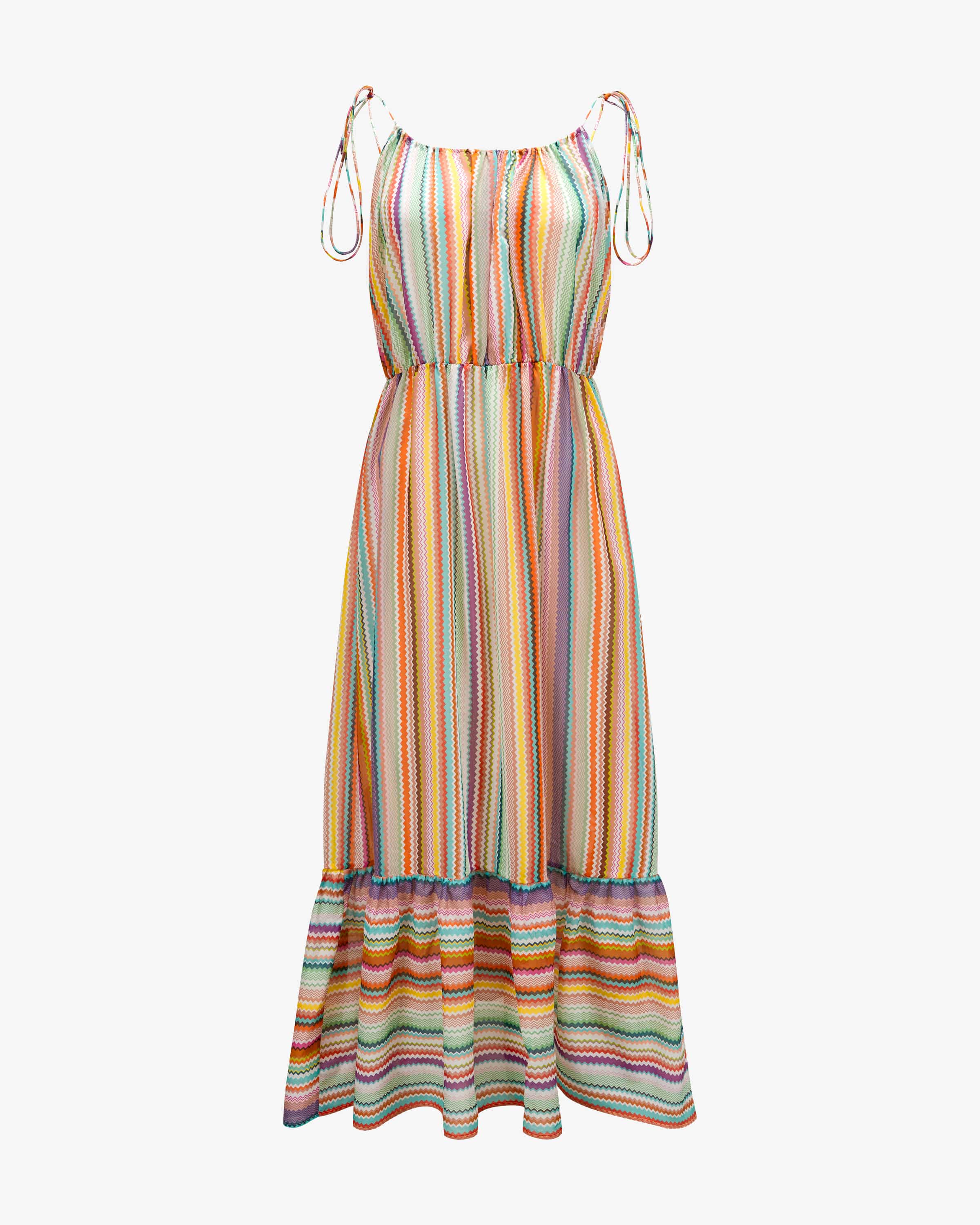 Kleid für Damen von Missoni in Bunt. Das italienische Modehaus ist bekannt für farbenfrohe Strickkunst & Zickzack-Muster. Auch dieses Modell präsentiert sich im labeltypischen Zick-Zack-Dessin, während die taillierte Silhouette mit romantischem Volant-Saum einen sommerlichen Look zaubert.