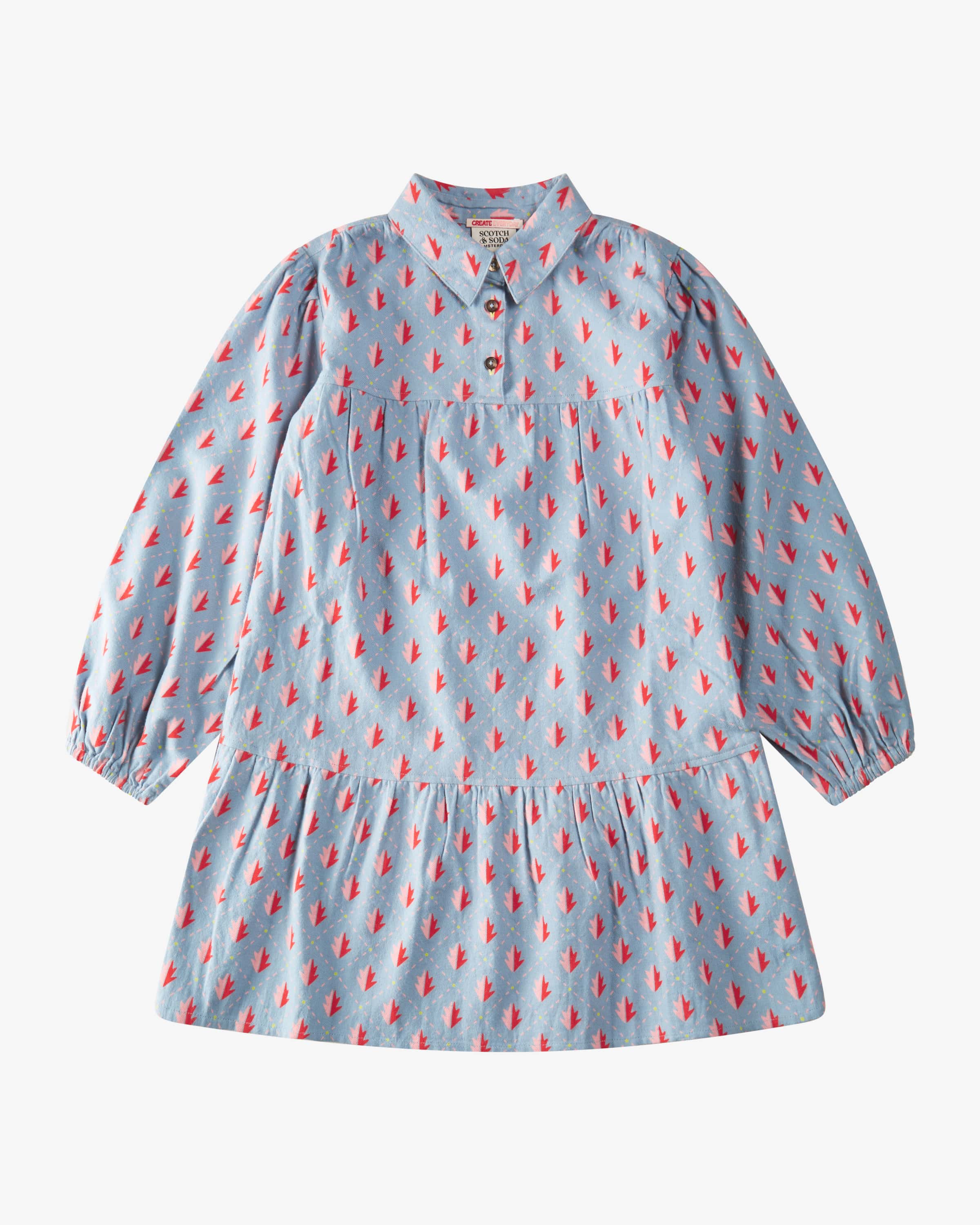 Kleid für Mädchen von Scotch & Soda in Hellblau, Rot und Rosa. Das Modell präsentiert sich mit ausgestellter Passform und gerafften Details, während der Hemdblusenkragen mit verkürzter Knopfleiste einen modischen Look schafft. Die weiche Baumwoll-Flanell-Verarbeitung und der grafische Blätter-Print runden den Look gekonnt ab.