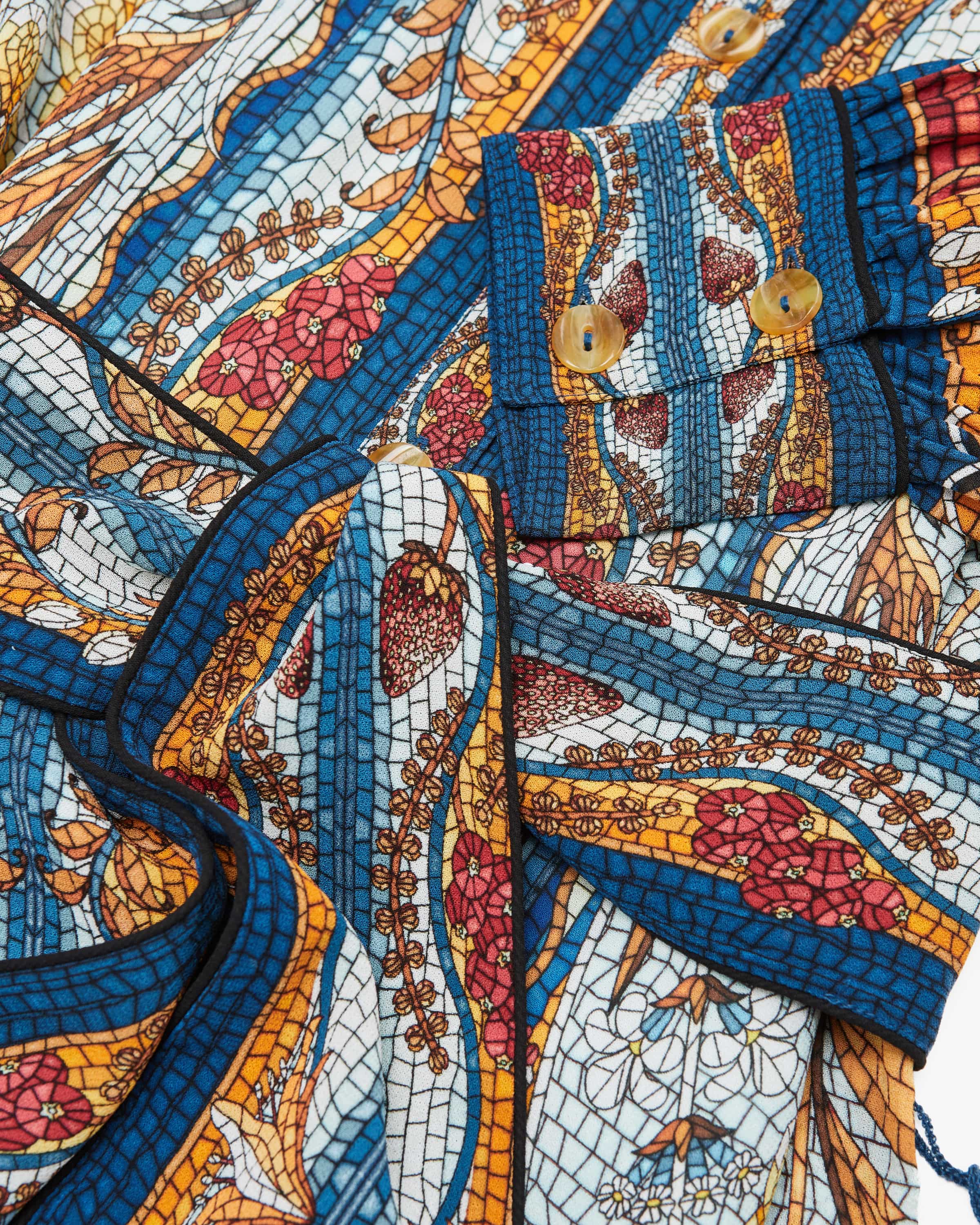 Mosaik-Optik einen sommerlichen Begleiter schafft. Klassische Hemdblusen-Details