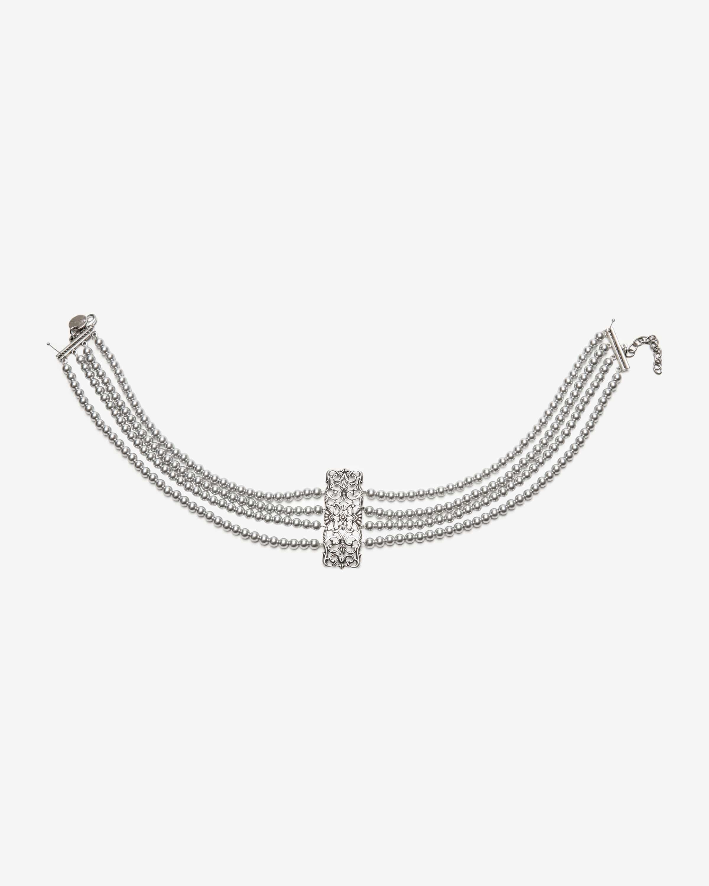 Kropfcollier für Damen von Seenberg Lifestyle in Silber und Hellgrau. Moderner Trachtenschmuck - Mit viel Liebe zum Detail wird jede Seenberg Kreation von Ingrid Aigner-Schatz designt. Dieses Halsschmuckstück mit vierreihiger Perlenkette und vergoldetem Ornament avanciert zum optischen Highlight jedes Trachten-Looks.