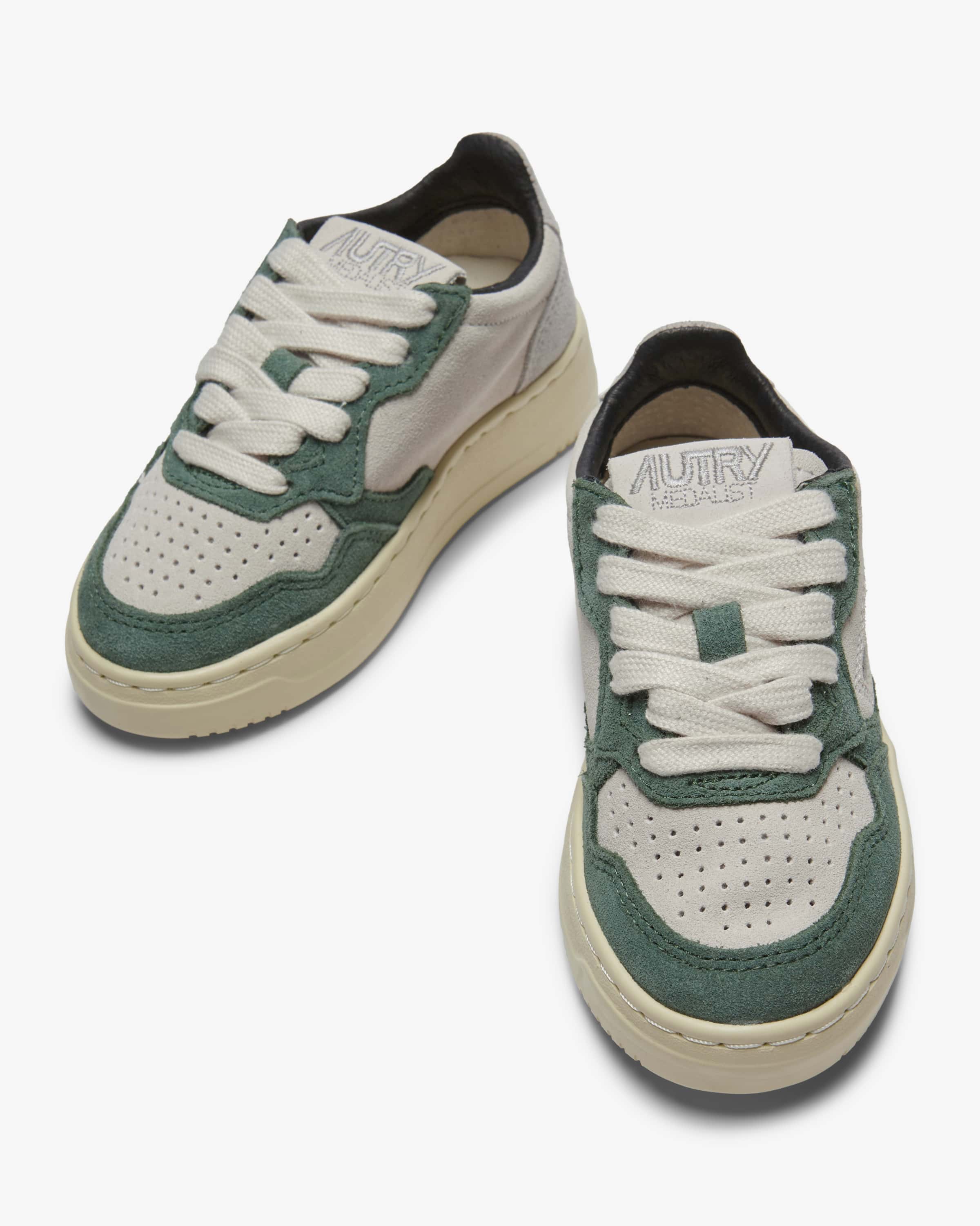 Kulk Low Kid Sneaker für Kinder von Autry in Hellgrau, Beige und Grün. Das 1982 in Dallas gegründete Label etablierte sich zu einem der beliebtesten Sneaker- Marken der 1980er Jahre und feierte 2019 sein Comeback. Auch dieses Modell aus hochwertigem Glatt- und Veloursleder präsentiert sich im sportiven Unisex-Look, während die Frottee-Innenseite und die dicke Gummisohle einen bequemen Alltagsbegleiter für Ihre Kleinen kreiert.