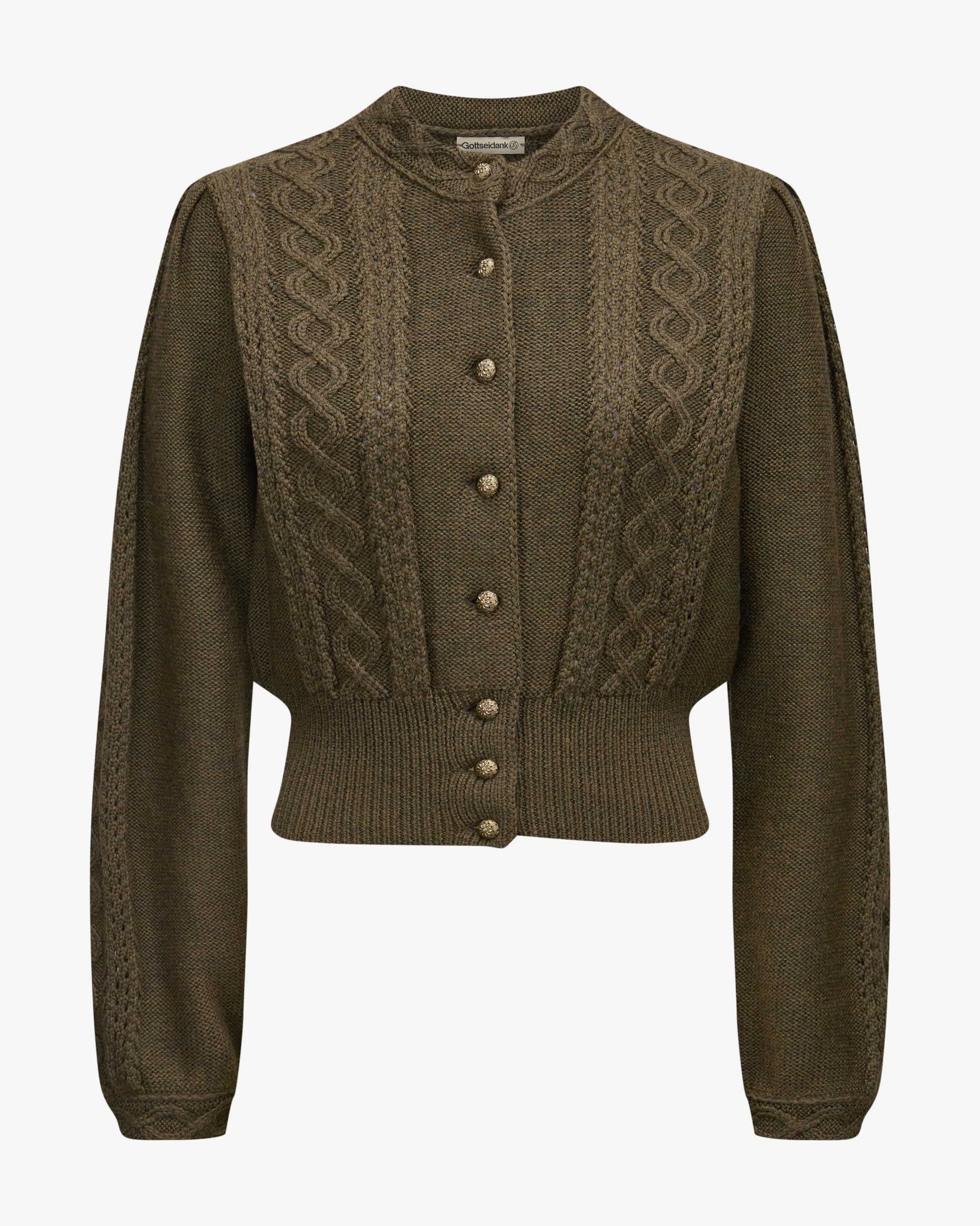 Lea Trachten-Strickjacke für Damen von Gottseidank in Oliv. Die feine Merinowolle in raffinierter Strick-Qualität punktet mit besonders angenehmem Tragekomfort, während stilvolle Kugelknöpfe sowie die Raffungen an den Schultern das traditionelle Modell feminin vollenden.