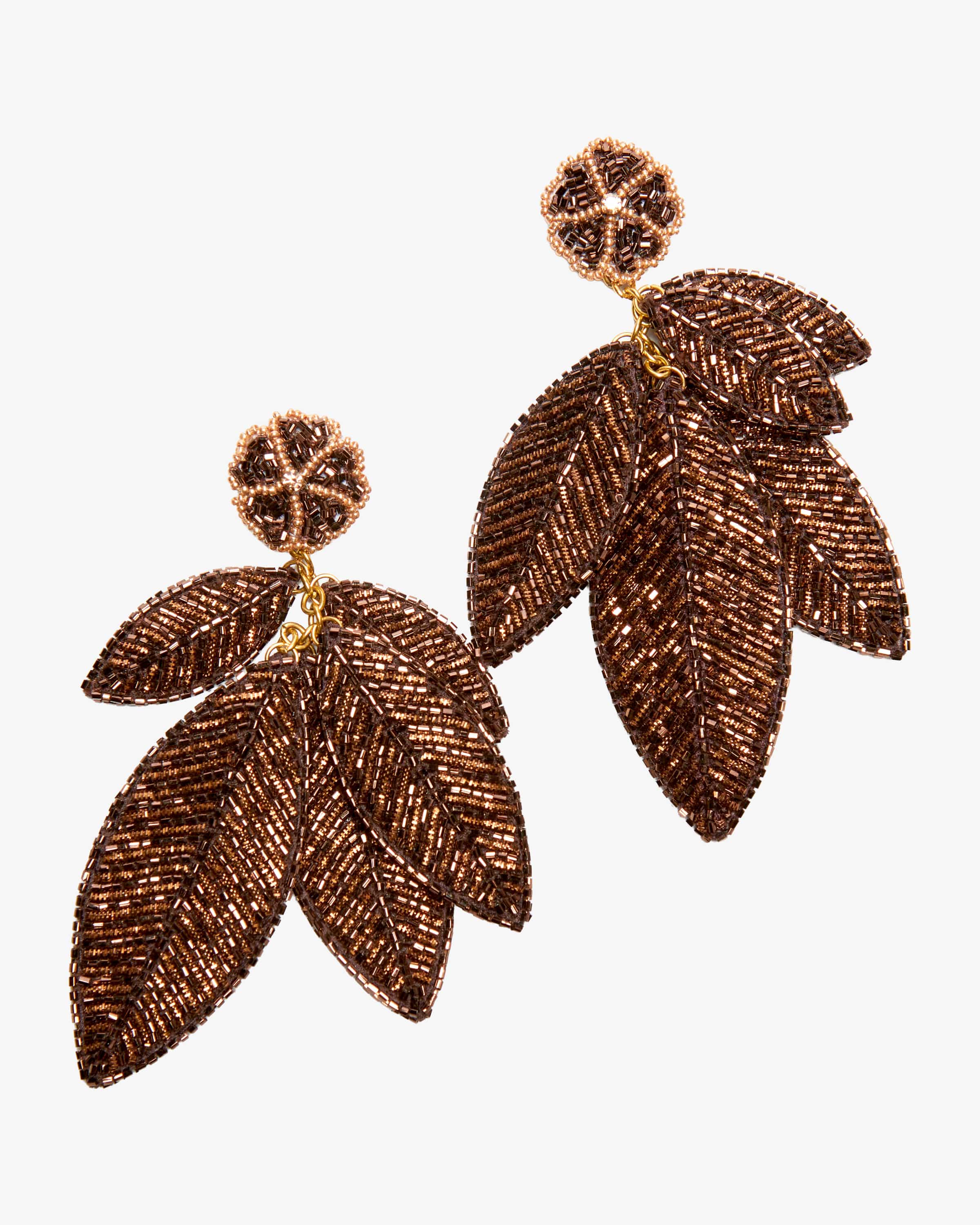 Leaf Clip-Ohrringe von Olivia Dar in Bronze. Verspielte Accessoires mit indischen Einflüssen – jedes Stück ein handgefertigtes Kunstwerk. Auch dieses extravagante Schmuckstück avanciert dank changierender Schmuckperlen-Applikationen zu einem besonderen Eyecatcher, der jedem Outfit einen Hauch Raffinesse verleiht.
