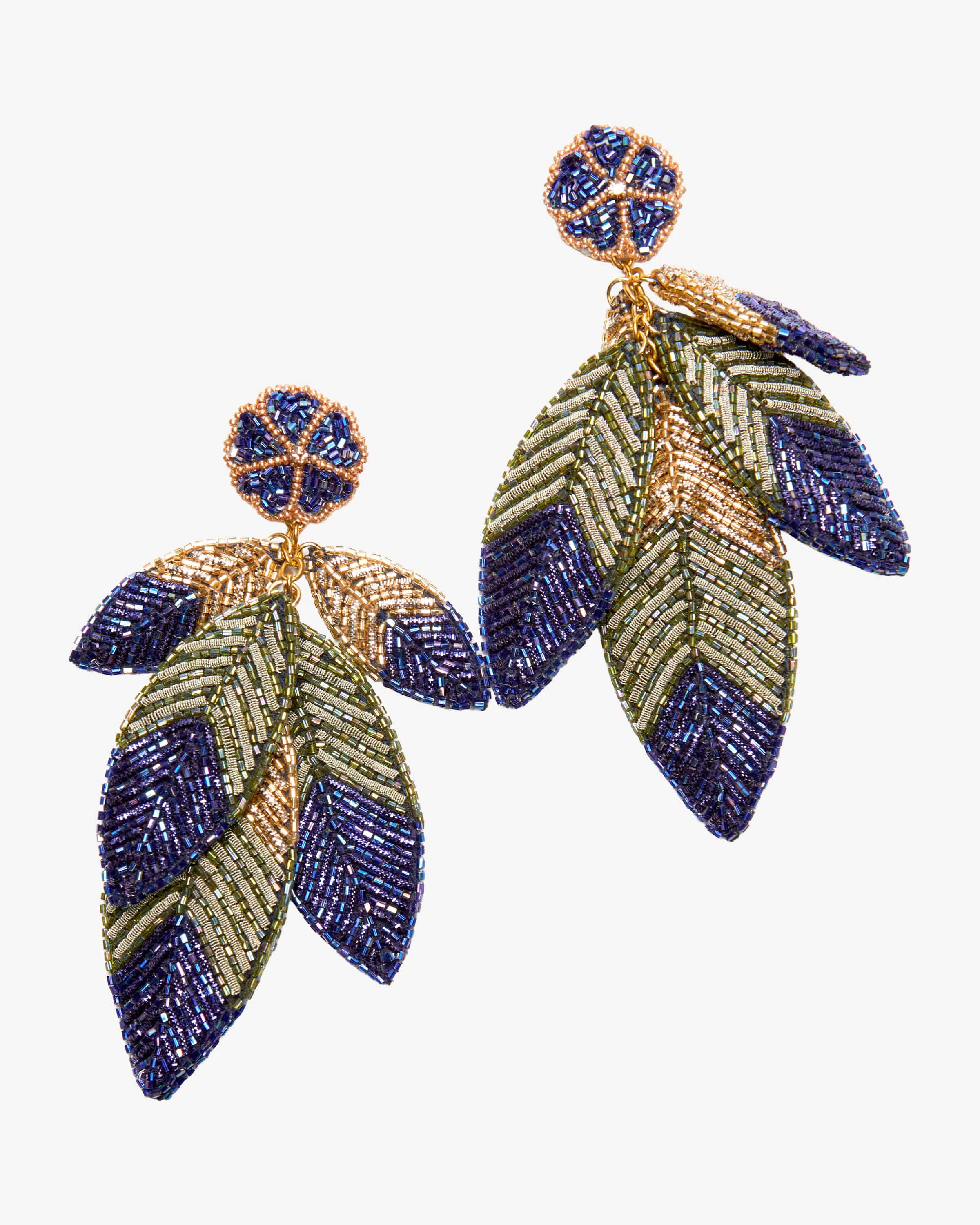 Leaf Clip-Ohrringe von Olivia Dar in Blau, Oliv und Gold. Verspielte Accessoires mit indischen Einflüssen – jedes Stück ein handgefertigtes Kunstwerk. Auch dieses extravagante Schmuckstück avanciert dank changierender Schmuckperlen-Applikationen zu einem besonderen Eyecatcher, der jedem Outfit einen Hauch Raffinesse verleiht.