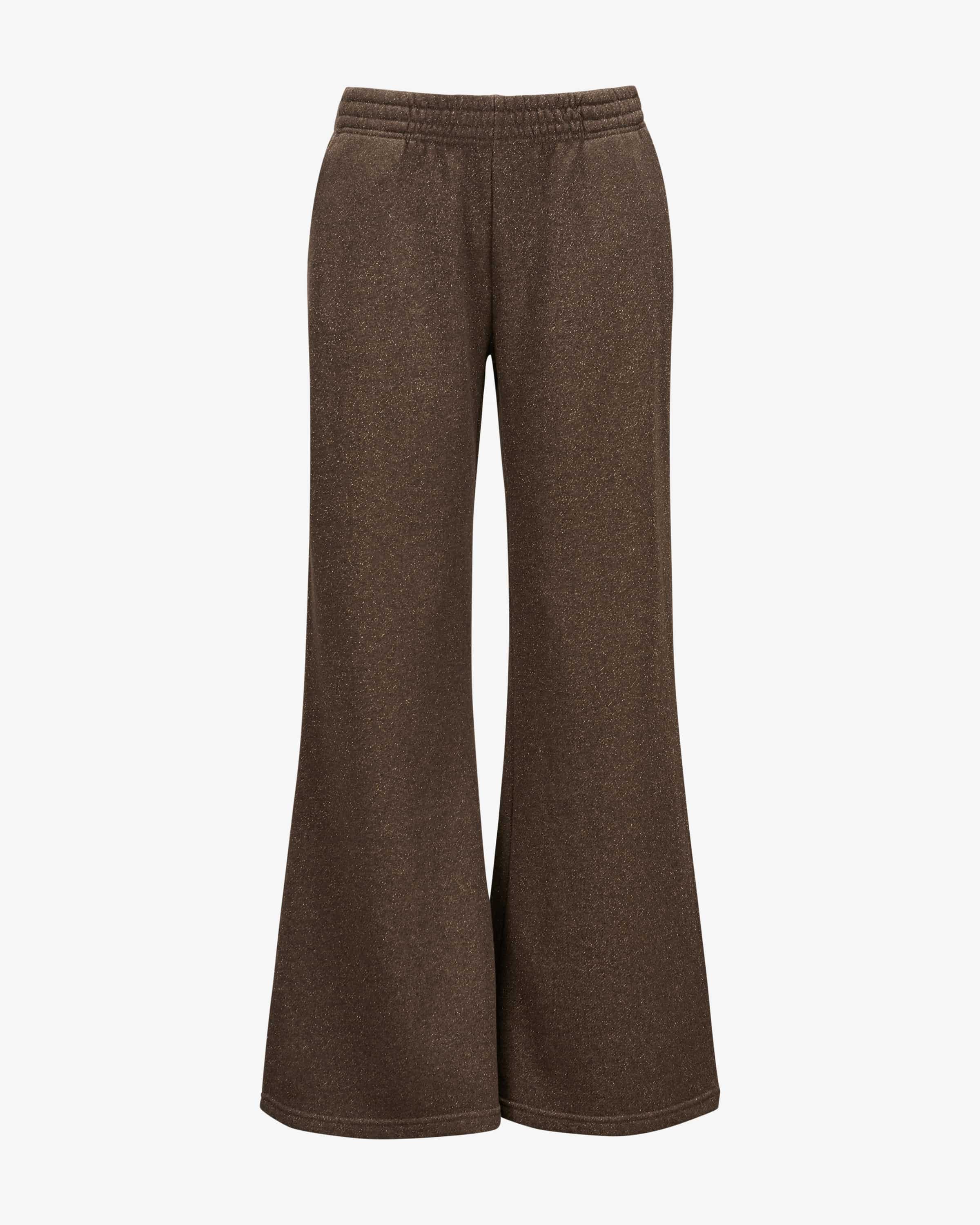 Lely Sweathose für Damen von Love Joy Victory in Braun und Gold. Eine Verbindung aus Designanspruch mit echtem Verantwortungsbewusstsein - Die Marke steht für nachhaltige Activewear und Casualmode. Dank der weiten Passform mit ausgestelltem Bein sowie der soften Sweat-Qualität überzeugt das Modell mit hohem Tragekomfort, während die goldfarbenen Glitzerfasern besondere Akzente setzen - Ein modisches Wohlfühl-Piece.