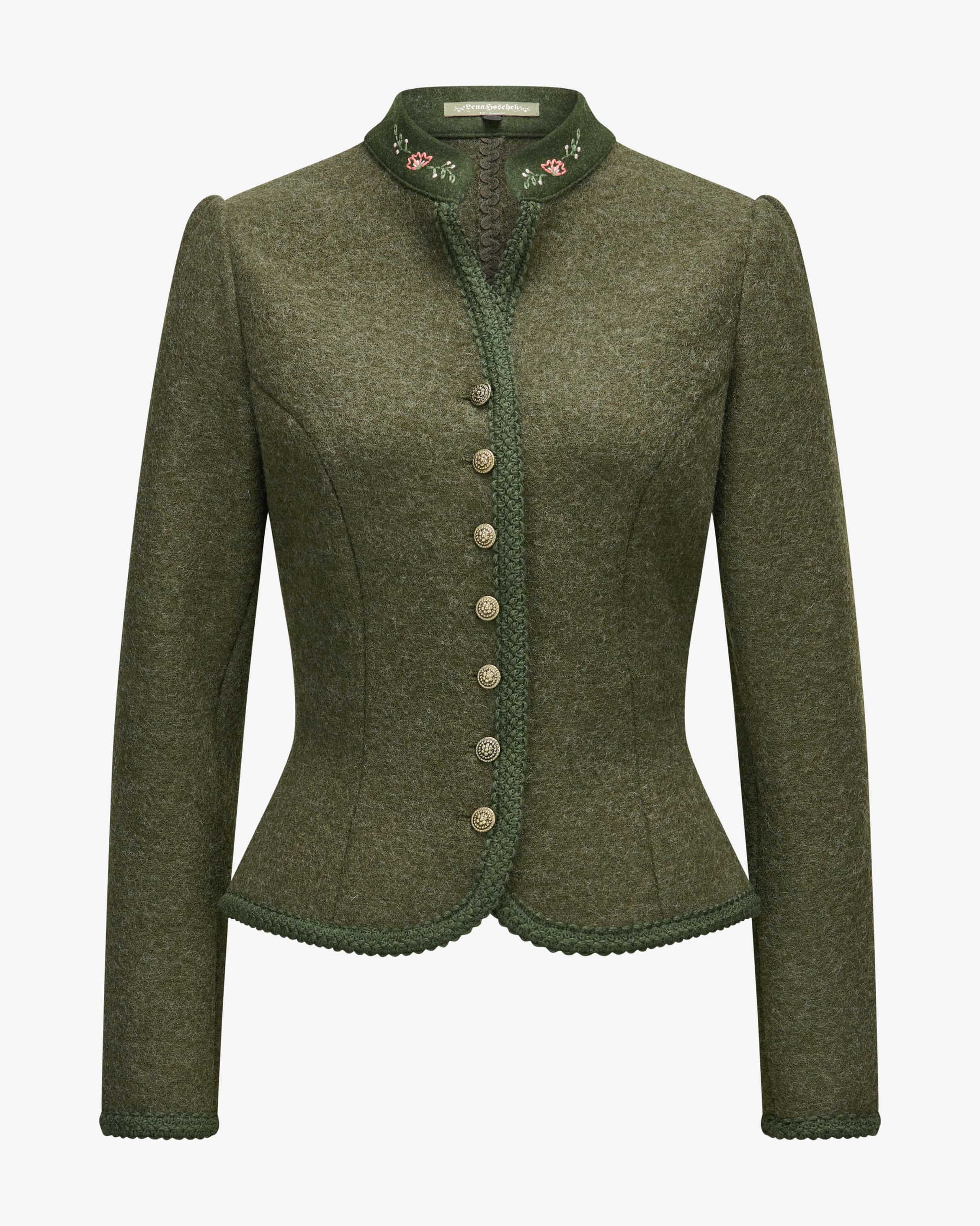 Leopold Trachtenjacke für Damen von Lena Hoschek in Oliv. Das taillierte Modell besticht in traditioneller Aufmachung, während die verspielten Borten-Abschlüsse und Stickereien dem Gesamtbild das gewisse Etwas verleiht – Der perfekte Begleiter für festliche Anlässe.