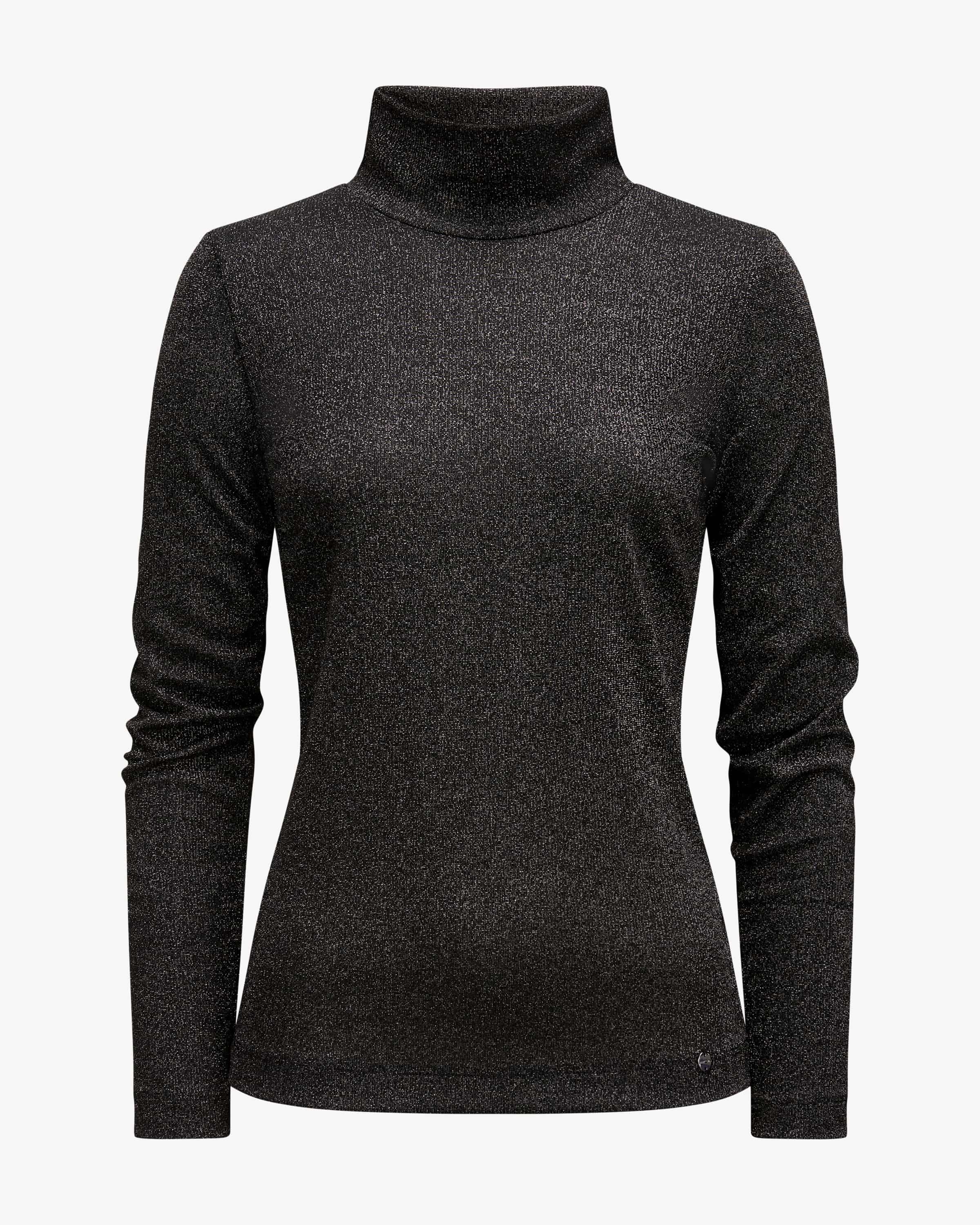 Longsleeve für Damen von Marc Cain in Schwarz. Das Modell präsentiert sich in femininer Silhouette, während die Rippstrick-Struktur in Kombination mit den metallisierten Fasern sowohl einen sportiven als auch eleganten Favoriten versprechen.