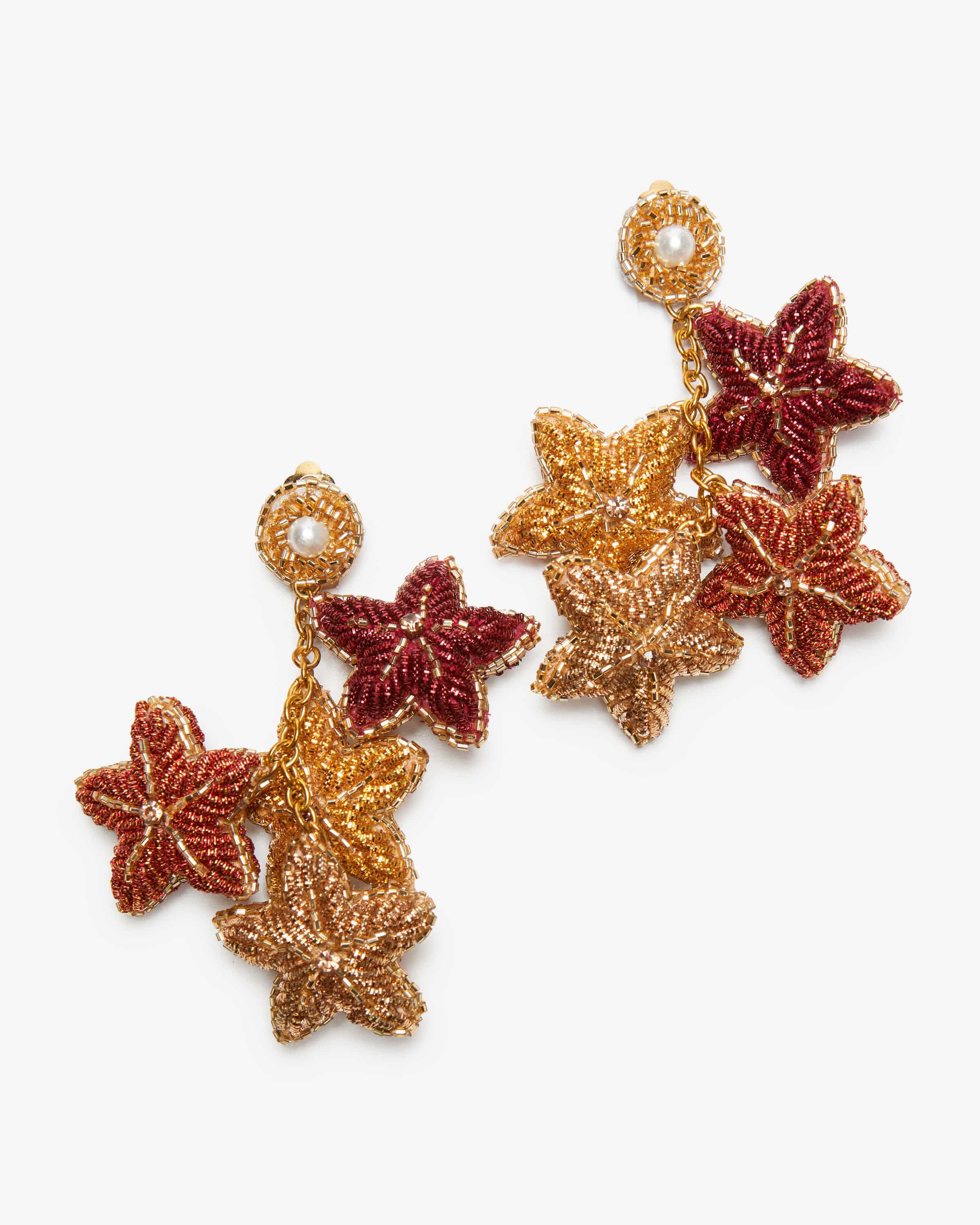 Multi Star Clip-Ohrringe von Olivia Dar in Orange, Bordeaux und Gold. Verspielte Accessoires mit indischen Einflüssen – jedes Stück ein handgefertigtes Kunstwerk. Auch dieses extravagante Schmuckstück avanciert dank changierender Schmuckperlen-Applikationen in Sternenform zu einem besonderen Eyecatcher, der jedem Outfit einen Hauch edle Raffinesse verleiht.