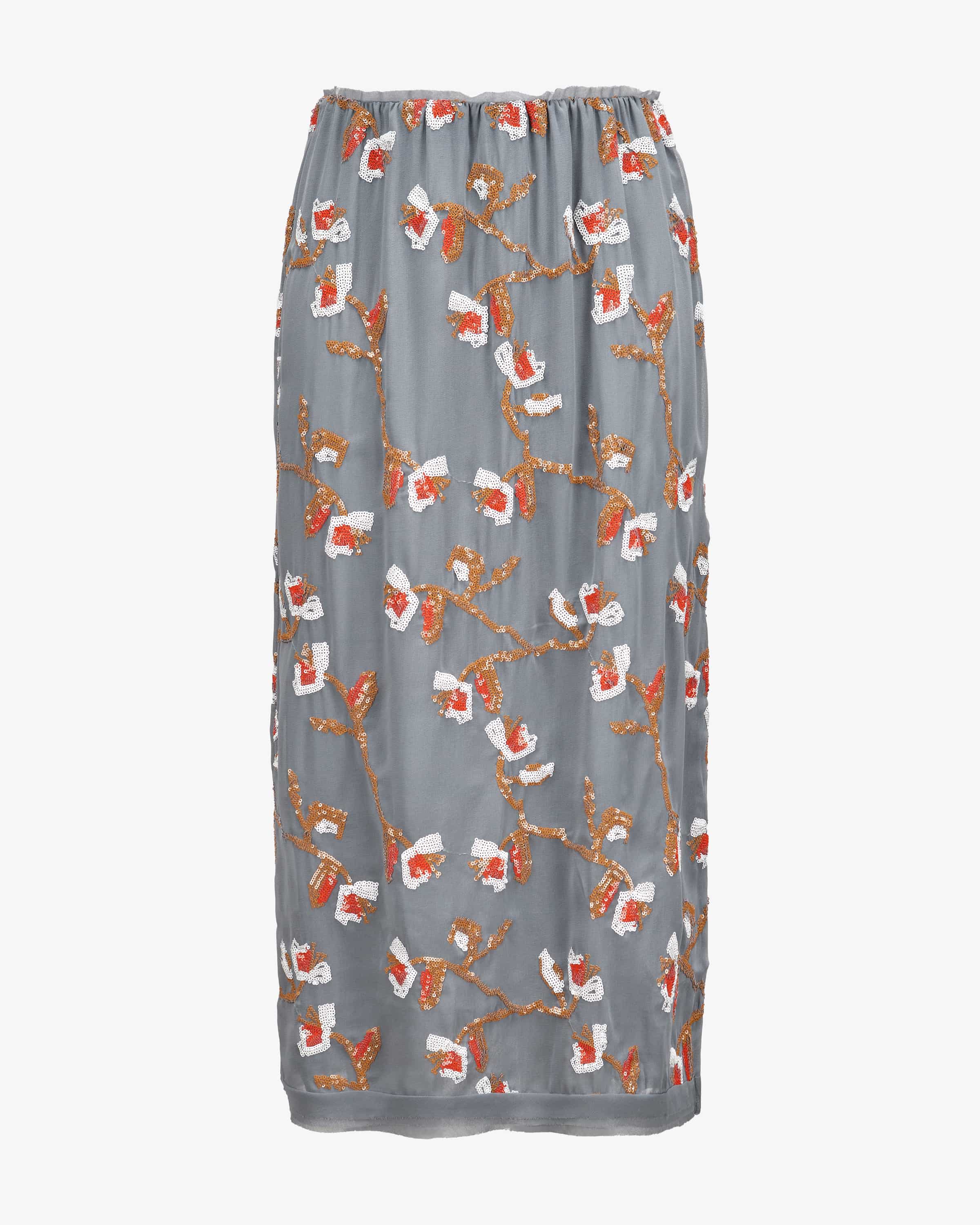 Omi Rock für Damen von Munthe in Grau, Orange und Weiß. Das Modell präsentiert sich dank der dezenten A-Linie sowie dem zweilagigen Mesh-Design in femininer Aufmachung, während die changierenden Pailletten-Applikationen in floralem Motiv dem Gesamtbild den letzten Schliff verleihen.