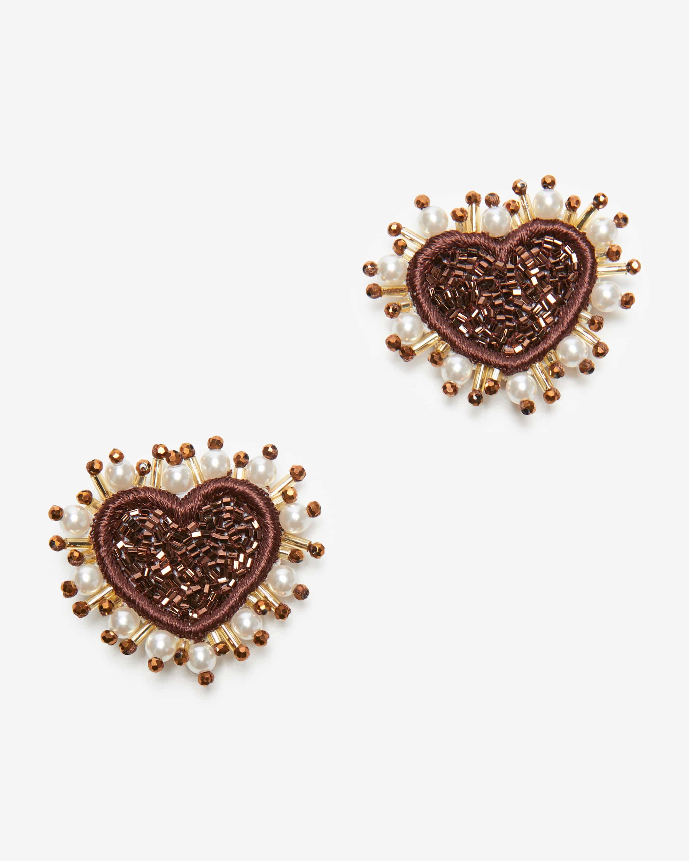 Pearl Heart Clip-Ohrringe von Olivia Dar in Bronze, Dunkelbraun und Creme. Verspielte Accessoires mit indischen Einflüssen – jedes Stück ein handgefertigtes Kunstwerk. Auch diese extravaganten Clip-Ohrringe in Herzform avancieren dank changierender Schmuckperlen-Applikationen zu einem besonderen Eyecatcher, der jedem Outfit einen Hauch edle Raffinesse verleiht.