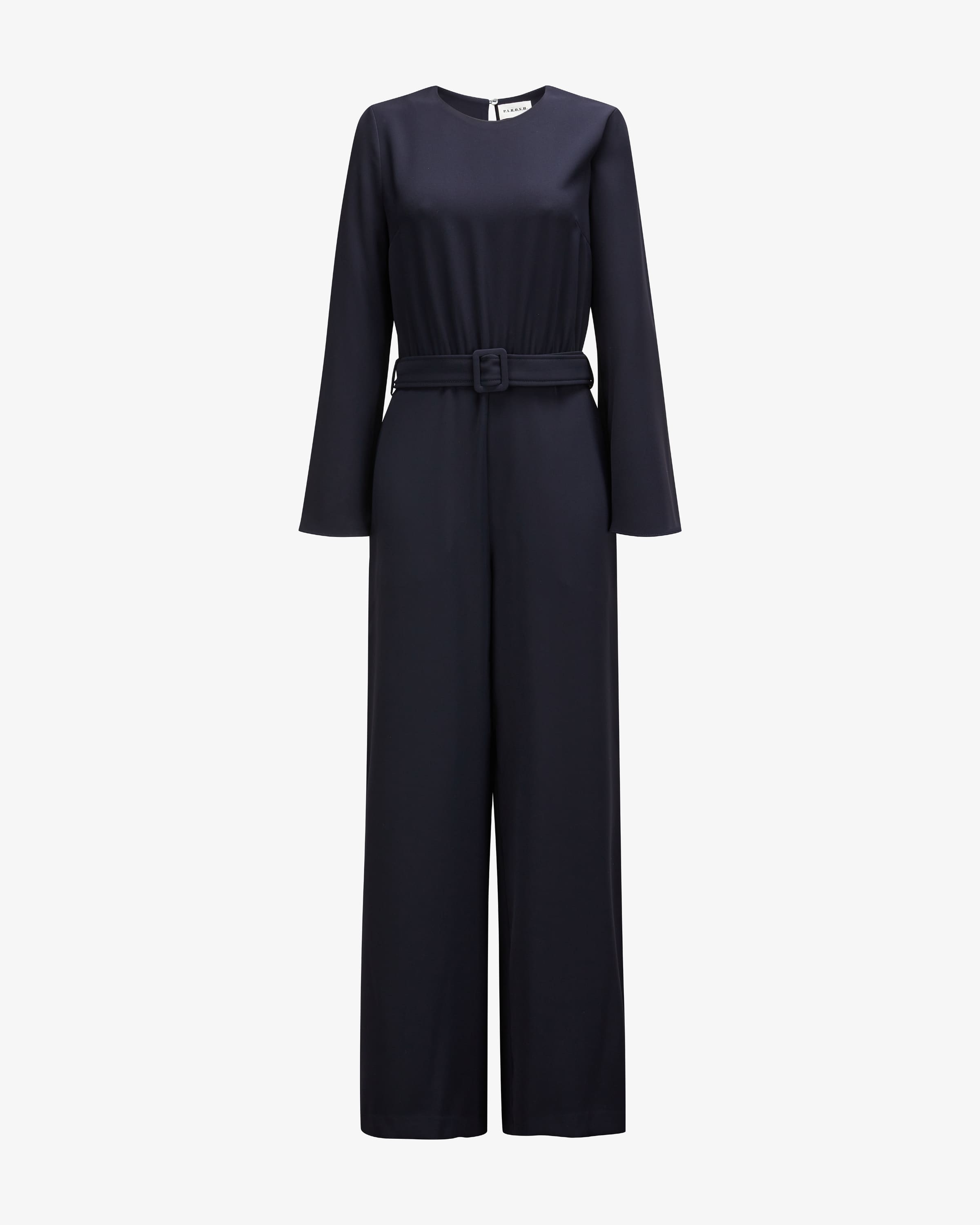 Poker25 Jumpsuit für Damen von Parosh in Marine. Das Modell besticht dank fließender Material-Qualität und weitem Bein mit angenehmem Tragekomfort, während das Taillenband sowie die Trompetenärmel einen femininen Look kreieren.