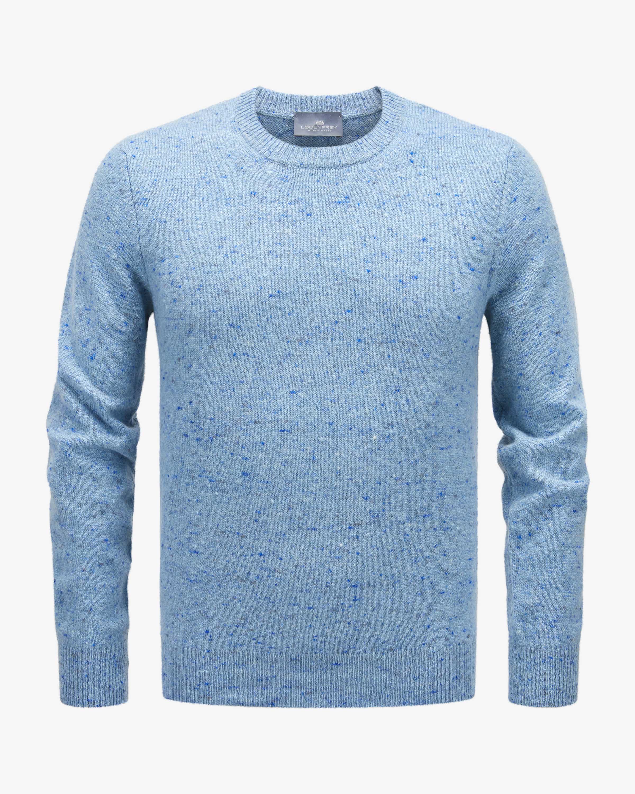 Pullover für Herren von LODENFREY in Hellblau und Azur. Das Casual Modell zeichnet sich durch seinen weichen Griff aus dank der hochwertigen Woll- Cashmere-Verarbeitung in Bouclé-Optik, während klassische Details den maskulinen Look unterstreichen.