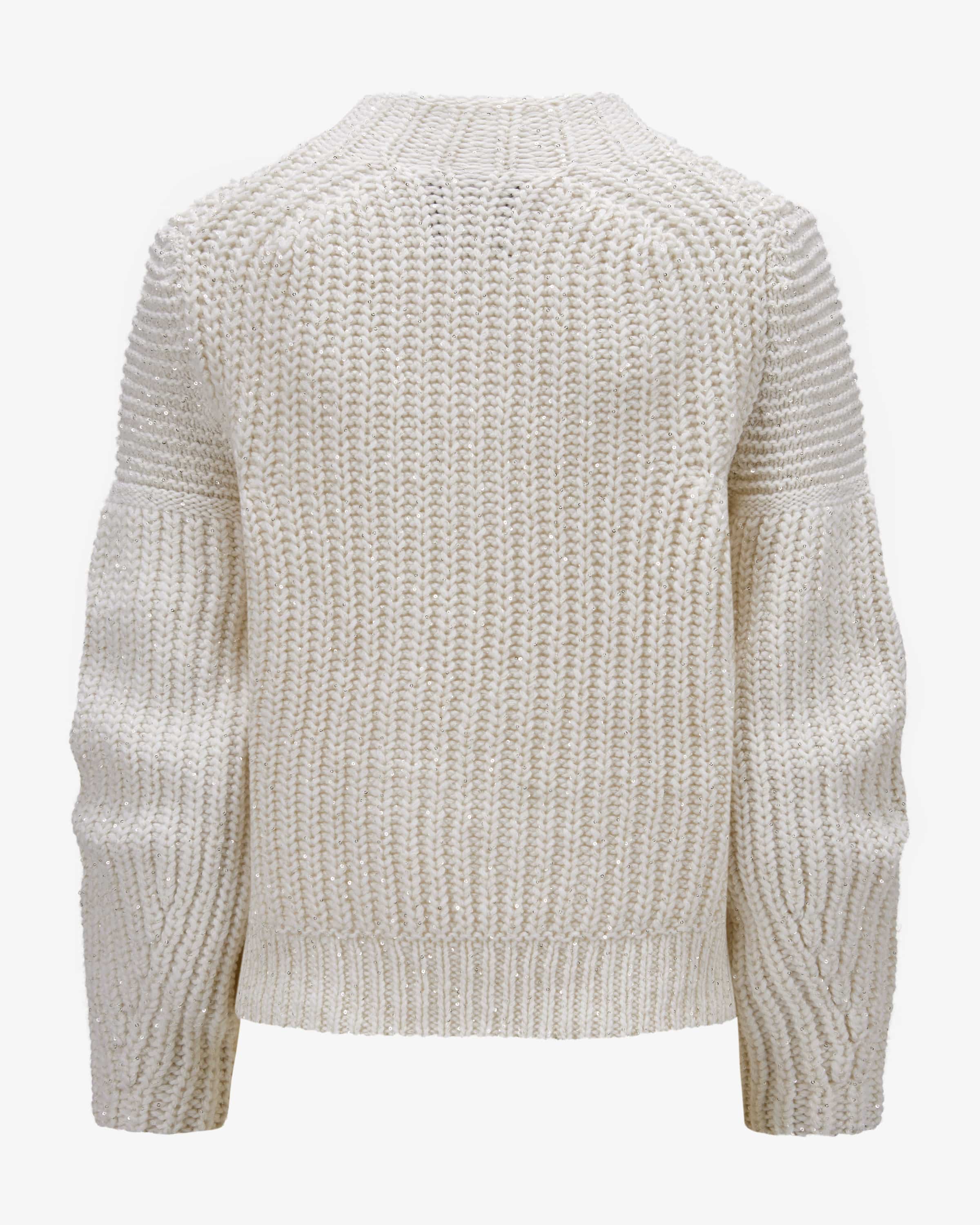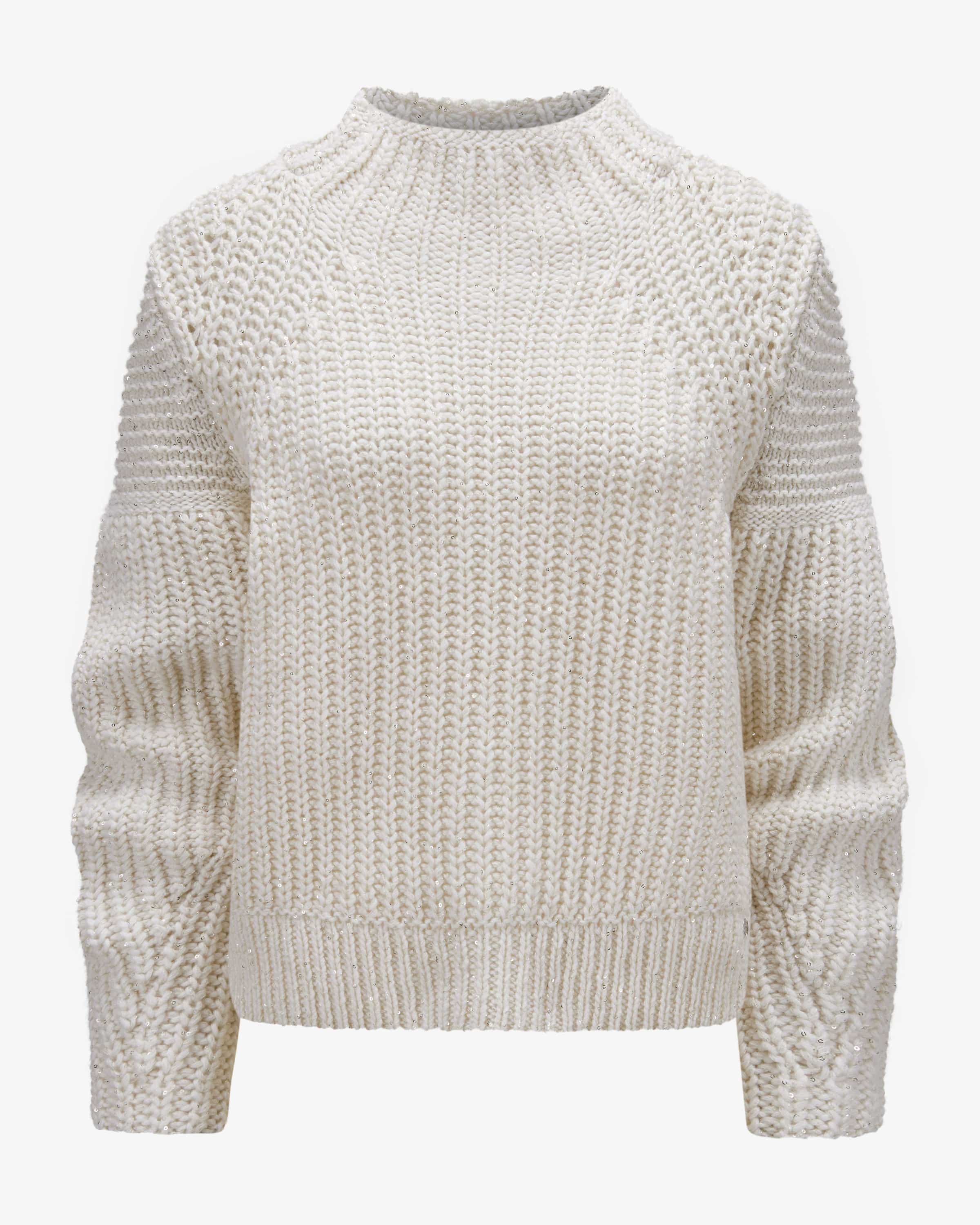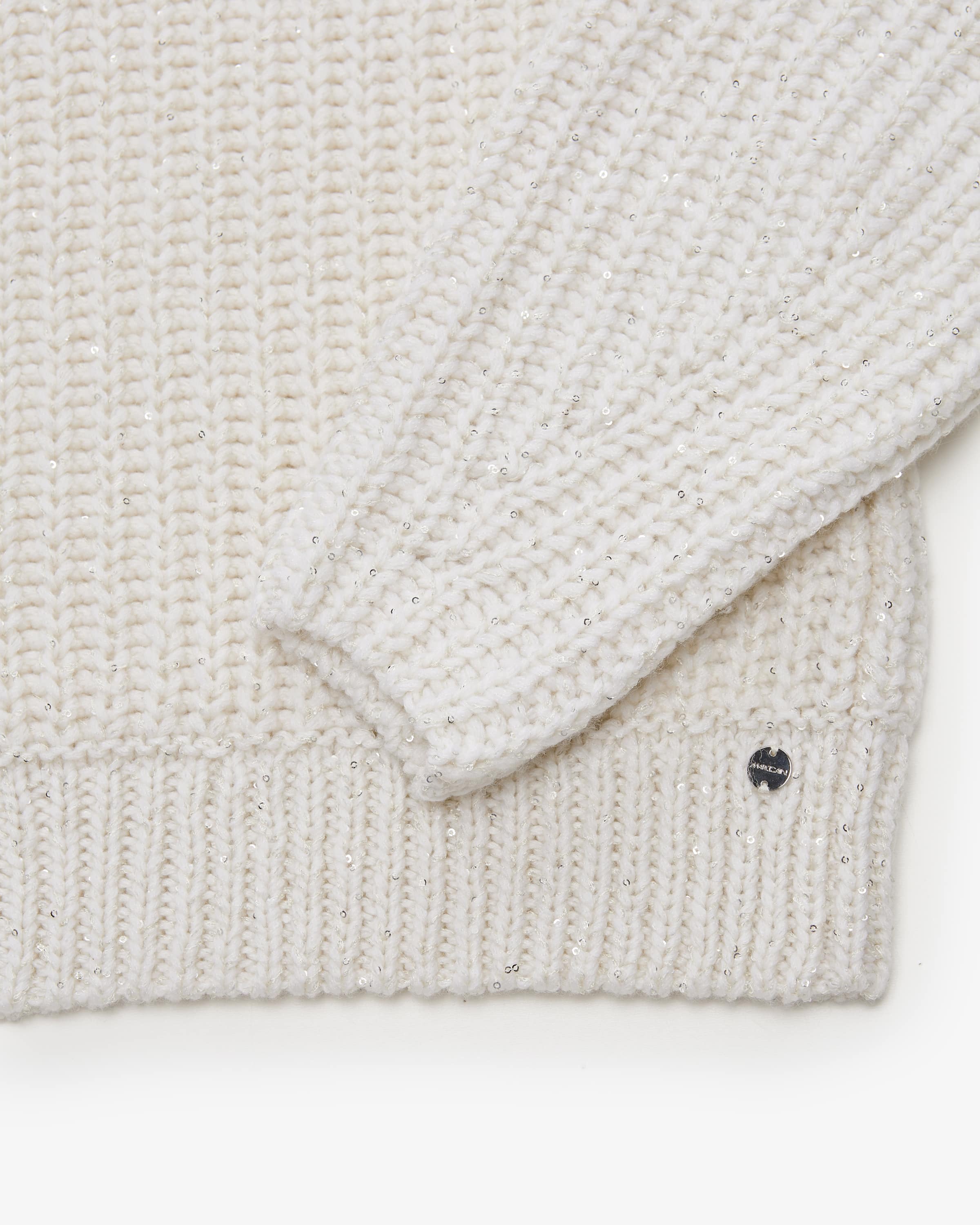 Pullover für Damen von Marc Cain in Off-White. Das in Deutschland gefertigte Modell besticht dank der hochwertigen Material-Verarbeitung in Rippstrick- Qualität mit einem besonders weichen Griff, während silberne Pailletten einen eleganten Touch verleihen.