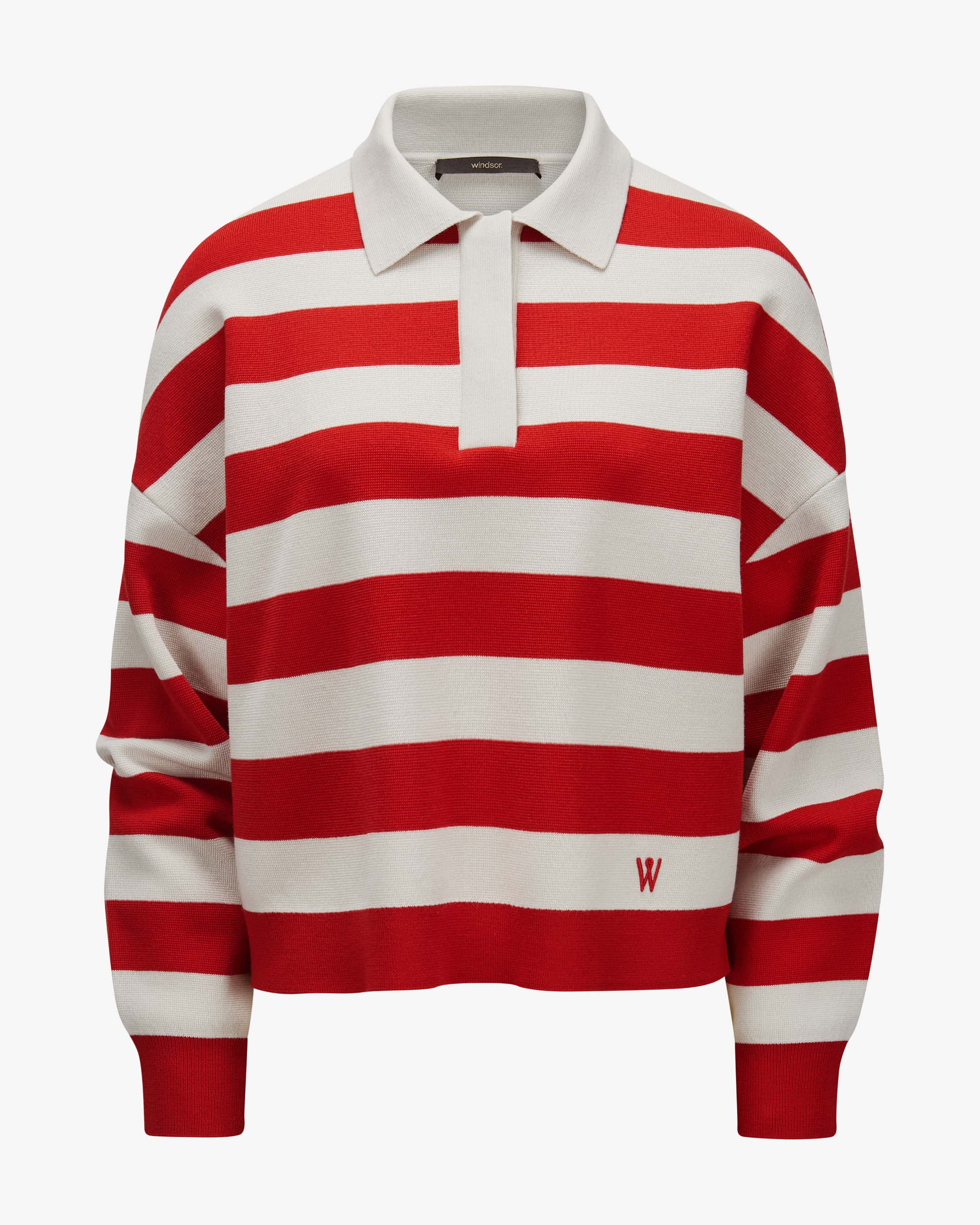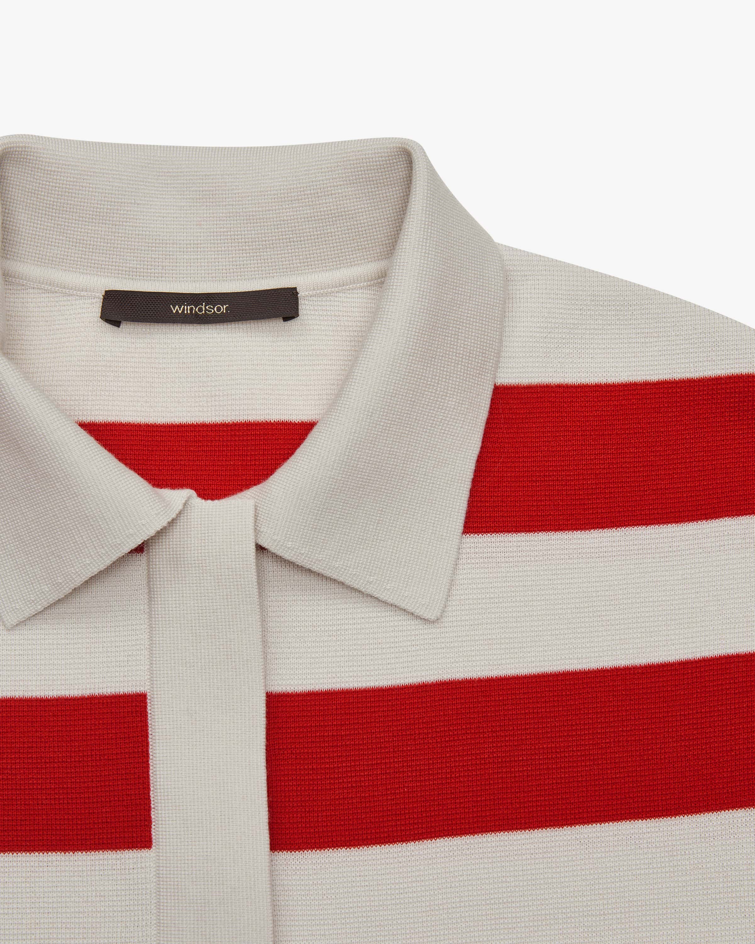 Pullover für Damen von Windsor in Rot und Stein. Während die elastische Schurwoll- Qualität sowie die Oversize-Silhouette einen komfortablen Look schafft, kreiert die Rugbyshirt-Aufmachung mit kontrastierendem Blockstreifen- Dessin einen modernen Casual-Favoriten mit sportivem Touch.