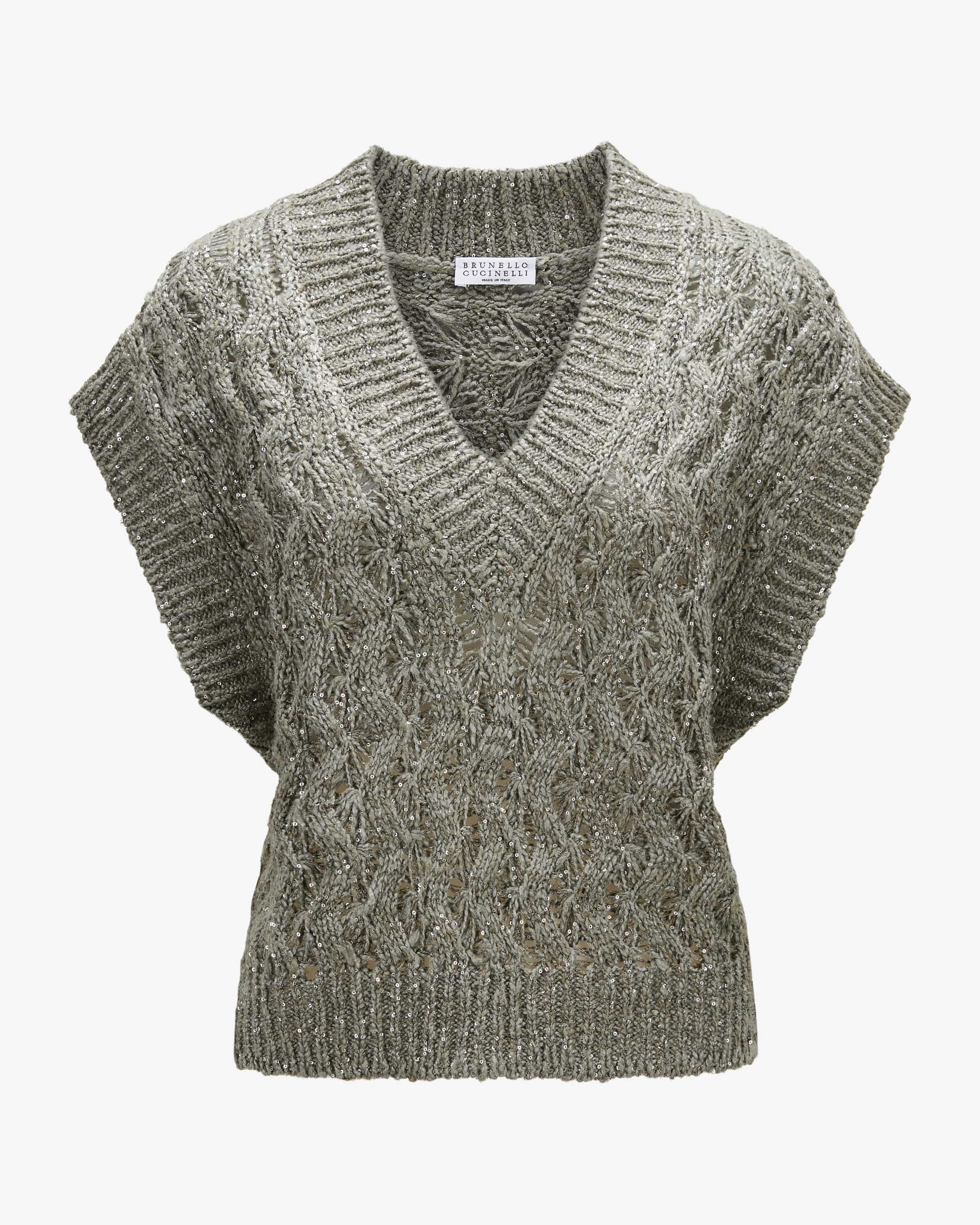 Pullunder für Damen von Brunello Cucinelli in Grau und Silber. Das italienisches Luxuslabel mit Sitz in Solomeo ist bekannt für luxuriöse, handveredelte Materialien. Auch dieses Modell überzeugt mit hochwertigem Seiden-Mix, während die zarten Pailletten und das semi-transparente Grobstrick-Design einen stilvollen Begleiter für vielseitige Layering-Styles kreieren.
