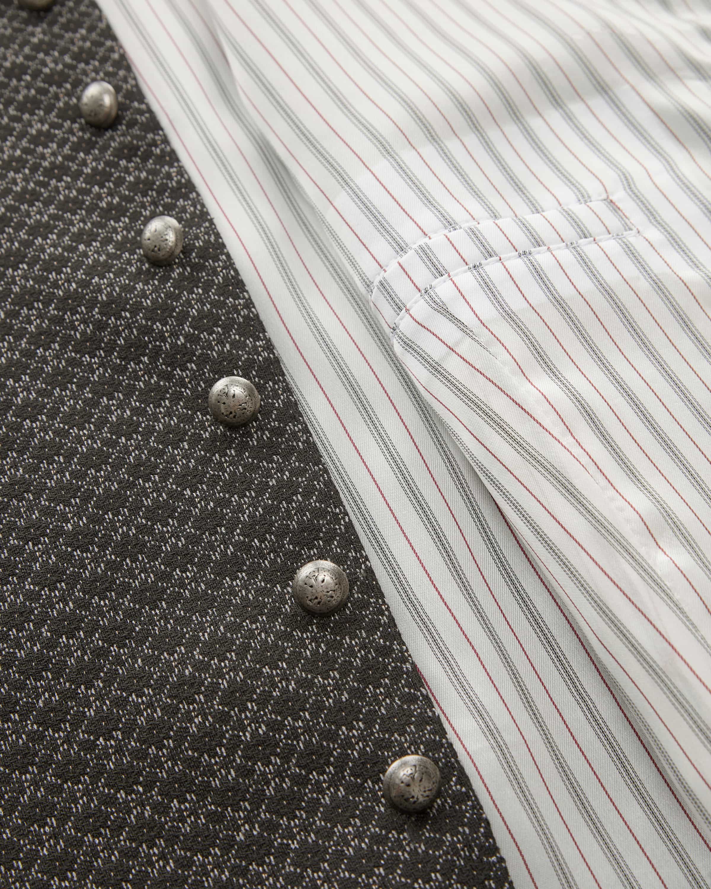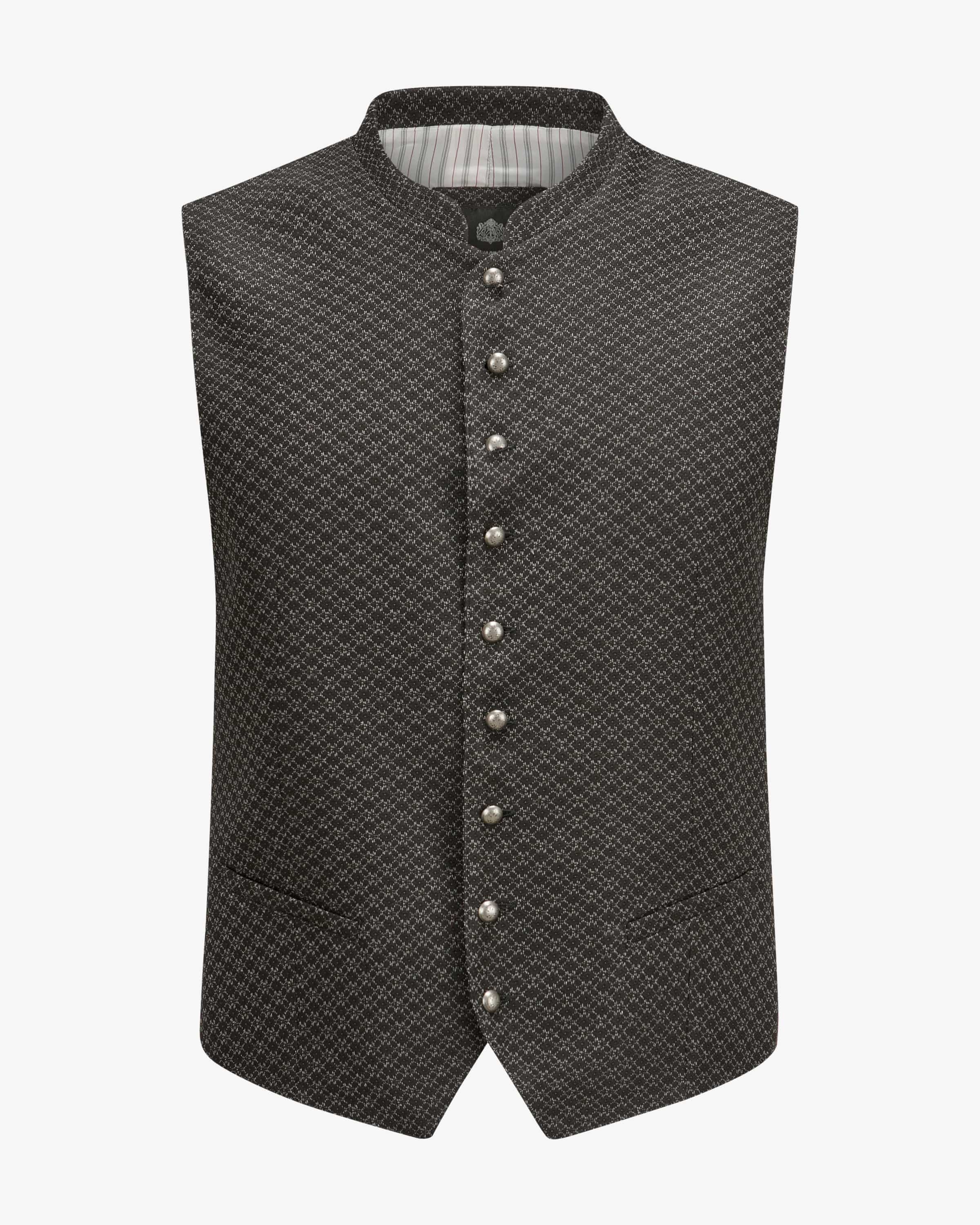 Robert Trachtenweste Slim Fit für Herren von Hammerschmid in Schwarz und Grau. Sportive Trachtenmode mit Stil - Das traditionelle Modell besticht dank der Stretch-Rückseite mit hohem Tragekomfort, während das feine Strukturmuster sowie die Metallknöpfe den letzten Schliff verleihen.