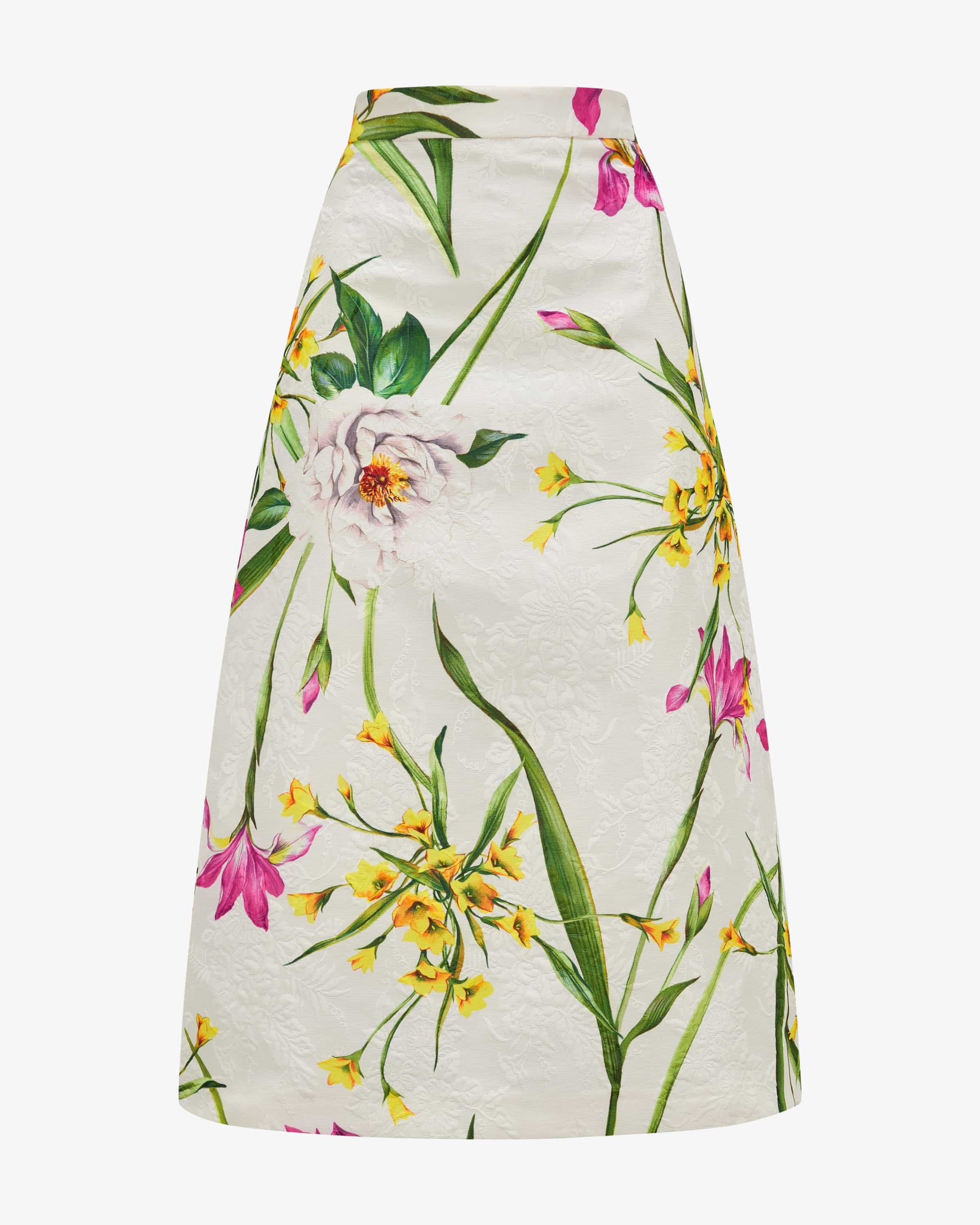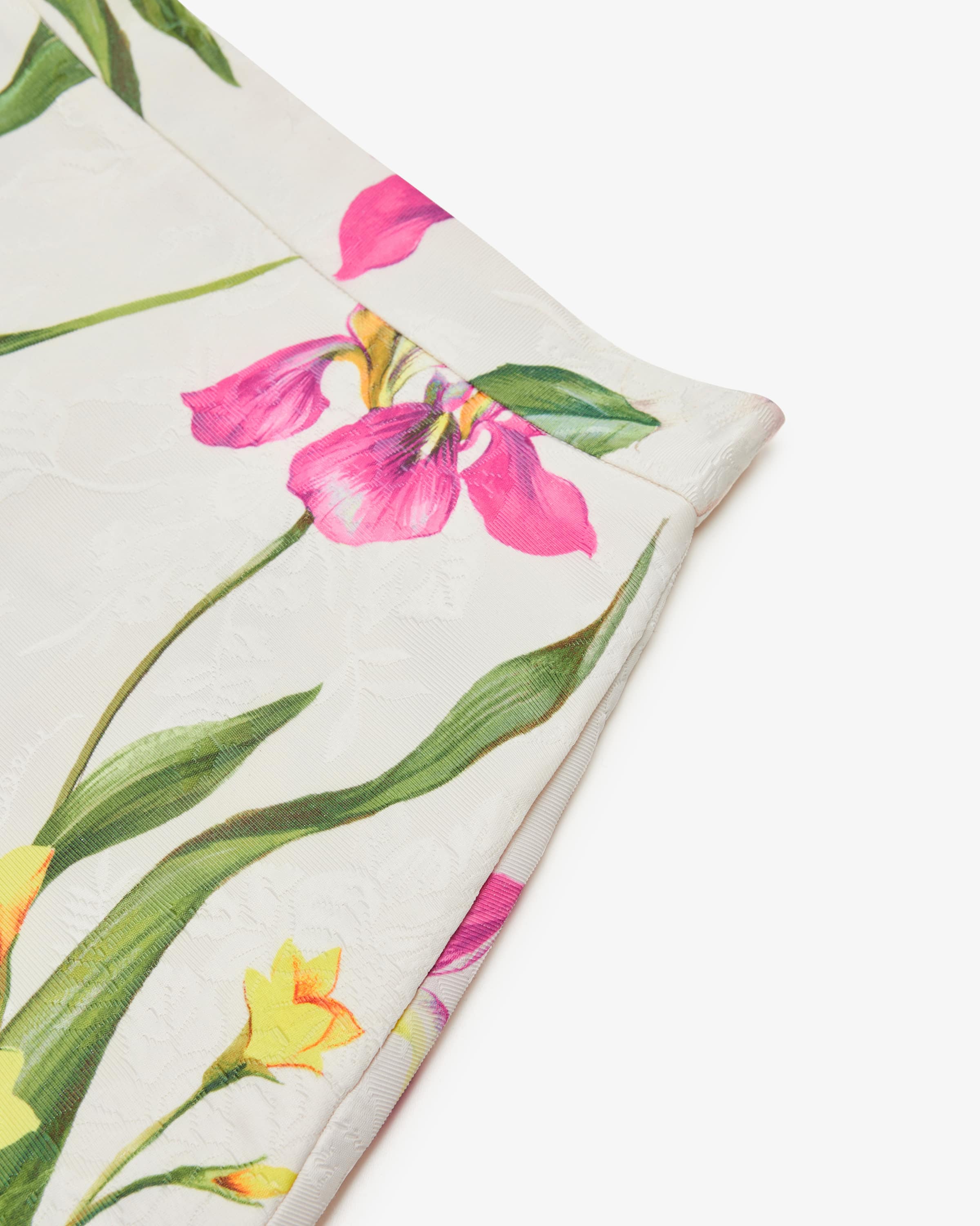 Rock Aline T Jardin für Damen von Lunatica Milano in Weiß, Grün und Pink. Lunatica Milano steht für handgefertigte Röcke made in Italy – farbenfroh und voller La-Dolce-Vita-Charme. Auch dieses Modell aus festem Jacquard-Stoff avanciert dank floralem Print zum femininen Hingucker und verleiht jedem Outfit das gewisse Etwas.