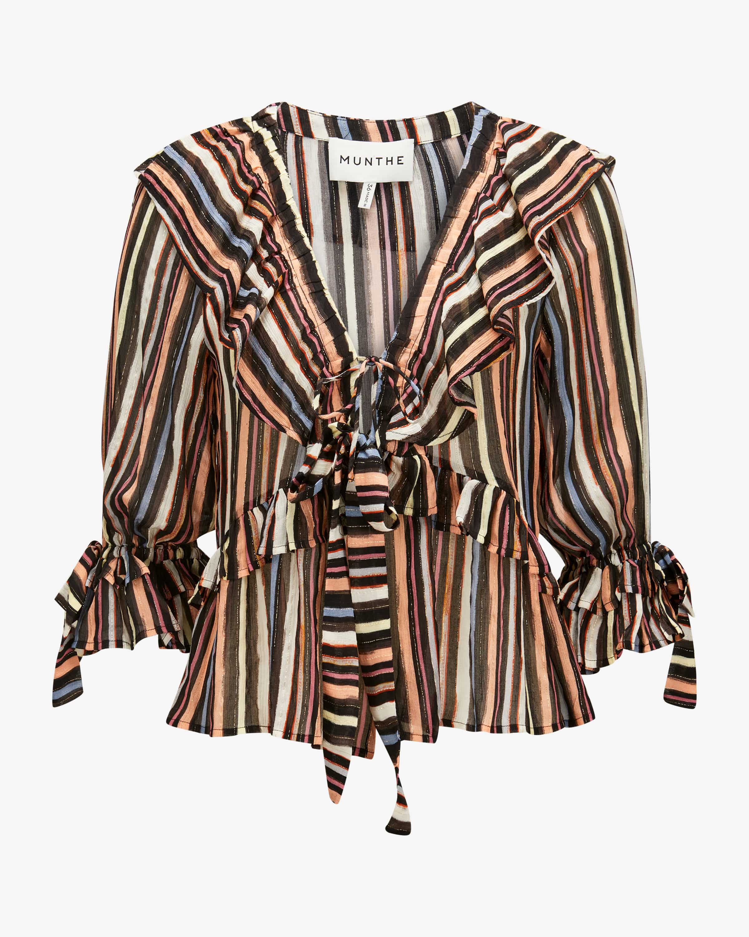 Ryley Bluse für Damen von Munthe in Bunt. Munthe ist ein skandinavisches Label aus Kopenhagen – feminin & cool. Das Modell zeichnet sich durch den besonders leichten Material-Mix mit Seiden-Anteil in semitransparenter Optik aus, während der geschnürte Ausschnitt sowie drapierte Volants-Details einen femininen Charakter verleihen. Zudem schafft das farbenfrohe Streifenmuster zusammen mit changierenden Glitzerfasern ein optisches Highlight.