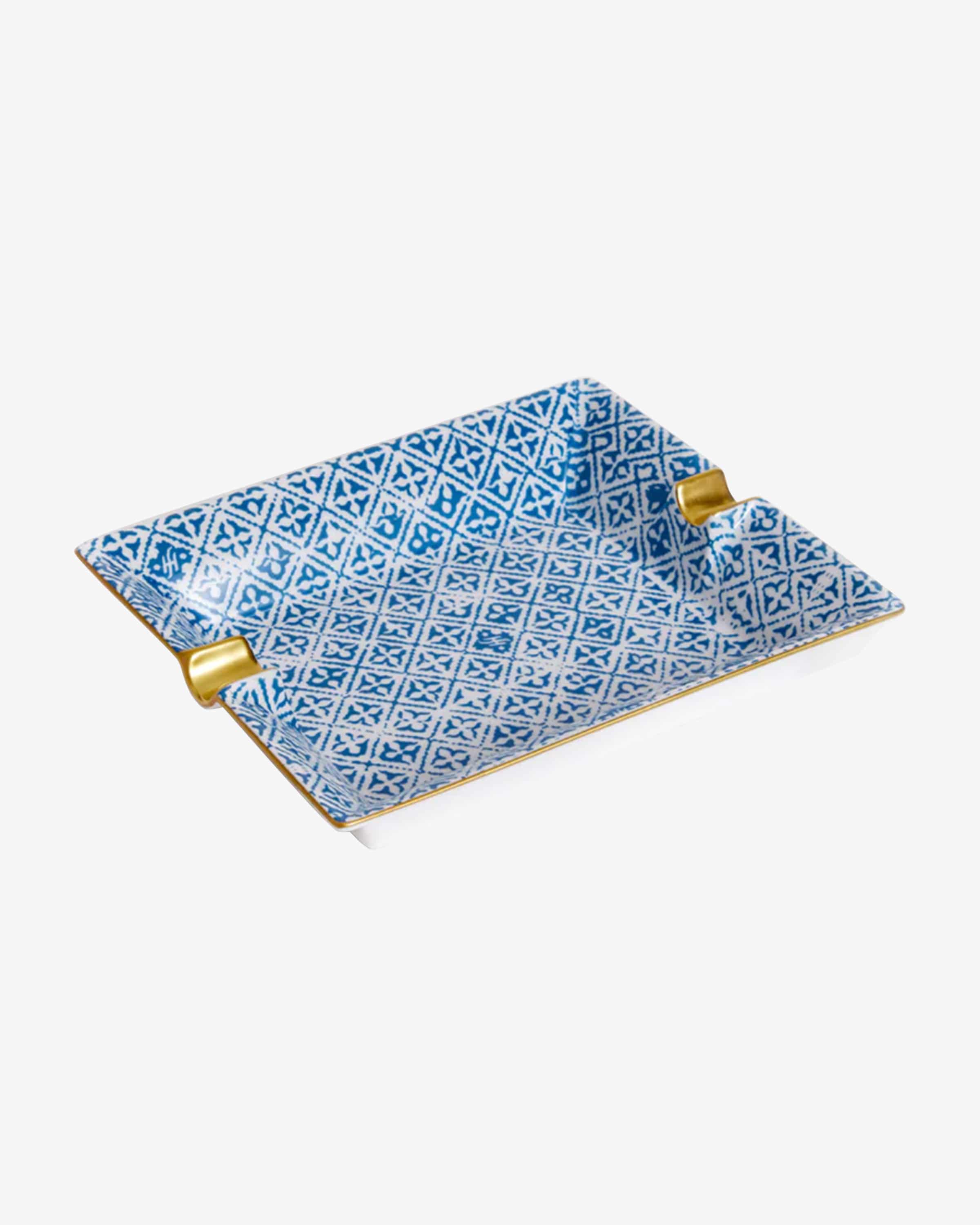 Schale von Friendly Hunting in Royal, Weiß und Gold. Diese universelle Schale mit Eyes of Marrakesh Print eignet sich dank den seitlichen Einkerbungen für Zigaretten perfekt als stilvoller Aschenbecher und ist eine Hommage an die typischen orientalischen Ornamente der Wüstenmetropole Marrakesh.