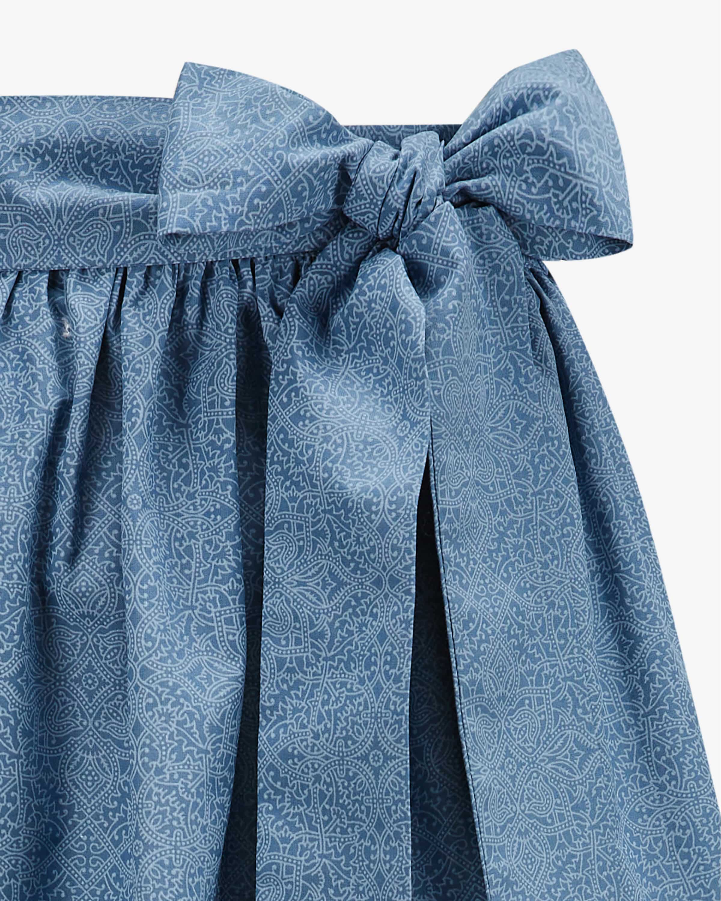 Schürze für Damen von LODENFREY in Taubenblau. Das Modell präsentiert sich mit leichter Baumwoll-Qualität und feinem Ornament-Muster - Ein femininer Begleiter für vielseitige Trachten-Looks.